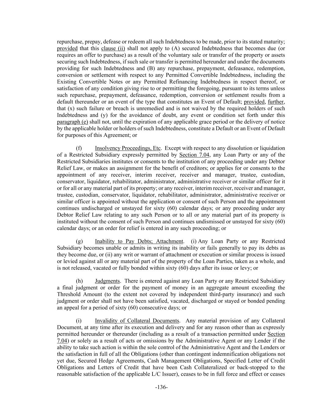 -136- repurchase, prepay, defease or redeem all such Indebtedness to be made, prior to its stated maturity; provided that this clause (ii) shall not apply to (A) secured Indebtedness that becomes due (or requires an offer to purchase) as a result of the voluntary sale or transfer of the property or assets securing such Indebtedness, if such sale or transfer is permitted hereunder and under the documents providing for such Indebtedness and (B) any repurchase, prepayment, defeasance, redemption, conversion or settlement with respect to any Permitted Convertible Indebtedness, including the Existing Convertible Notes or any Permitted Refinancing Indebtedness in respect thereof, or satisfaction of any condition giving rise to or permitting the foregoing, pursuant to its terms unless such repurchase, prepayment, defeasance, redemption, conversion or settlement results from a default thereunder or an event of the type that constitutes an Event of Default; provided, further, that (x) such failure or breach is unremedied and is not waived by the required holders of such Indebtedness and (y) for the avoidance of doubt, any event or condition set forth under this paragraph (e) shall not, until the expiration of any applicable grace period or the delivery of notice by the applicable holder or holders of such Indebtedness, constitute a Default or an Event of Default for purposes of this Agreement; or (f) Insolvency Proceedings, Etc. Except with respect to any dissolution or liquidation of a Restricted Subsidiary expressly permitted by Section 7.04, any Loan Party or any of the Restricted Subsidiaries institutes or consents to the institution of any proceeding under any Debtor Relief Law, or makes an assignment for the benefit of creditors; or applies for or consents to the appointment of any receiver, interim receiver, receiver and manager, trustee, custodian, conservator, liquidator, rehabilitator, administrator, administrative receiver or similar officer for it or for all or any material part of its property; or any receiver, interim receiver, receiver and manager, trustee, custodian, conservator, liquidator, rehabilitator, administrator, administrative receiver or similar officer is appointed without the application or consent of such Person and the appointment continues undischarged or unstayed for sixty (60) calendar days; or any proceeding under any Debtor Relief Law relating to any such Person or to all or any material part of its property is instituted without the consent of such Person and continues undismissed or unstayed for sixty (60) calendar days; or an order for relief is entered in any such proceeding; or (g) Inability to Pay Debts; Attachment. (i) Any Loan Party or any Restricted Subsidiary becomes unable or admits in writing its inability or fails generally to pay its debts as they become due, or (ii) any writ or warrant of attachment or execution or similar process is issued or levied against all or any material part of the property of the Loan Parties, taken as a whole, and is not released, vacated or fully bonded within sixty (60) days after its issue or levy; or (h) Judgments. There is entered against any Loan Party or any Restricted Subsidiary a final judgment or order for the payment of money in an aggregate amount exceeding the Threshold Amount (to the extent not covered by independent third-party insurance) and such judgment or order shall not have been satisfied, vacated, discharged or stayed or bonded pending an appeal for a period of sixty (60) consecutive days; or (i) Invalidity of Collateral Documents. Any material provision of any Collateral Document, at any time after its execution and delivery and for any reason other than as expressly permitted hereunder or thereunder (including as a result of a transaction permitted under Section 7.04) or solely as a result of acts or omissions by the Administrative Agent or any Lender if the ability to take such action is within the sole control of the Administrative Agent and the Lenders or the satisfaction in full of all the Obligations (other than contingent indemnification obligations not yet due, Secured Hedge Agreements, Cash Management Obligations, Specified Letter of Credit Obligations and Letters of Credit that have been Cash Collateralized or back-stopped to the reasonable satisfaction of the applicable L/C Issuer), ceases to be in full force and effect or ceases
