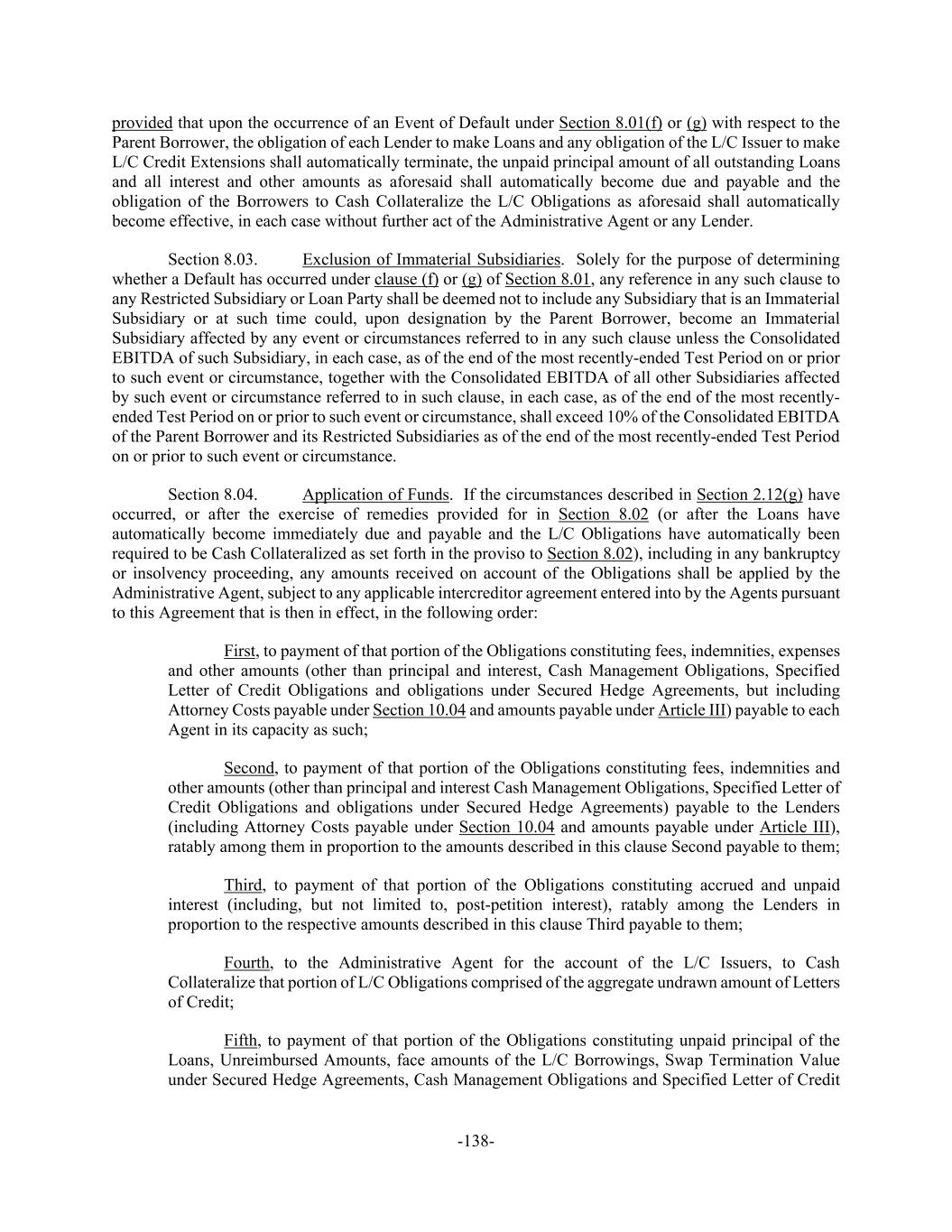 -138- provided that upon the occurrence of an Event of Default under Section 8.01(f) or (g) with respect to the Parent Borrower, the obligation of each Lender to make Loans and any obligation of the L/C Issuer to make L/C Credit Extensions shall automatically terminate, the unpaid principal amount of all outstanding Loans and all interest and other amounts as aforesaid shall automatically become due and payable and the obligation of the Borrowers to Cash Collateralize the L/C Obligations as aforesaid shall automatically become effective, in each case without further act of the Administrative Agent or any Lender. Section 8.03. Exclusion of Immaterial Subsidiaries. Solely for the purpose of determining whether a Default has occurred under clause (f) or (g) of Section 8.01, any reference in any such clause to any Restricted Subsidiary or Loan Party shall be deemed not to include any Subsidiary that is an Immaterial Subsidiary or at such time could, upon designation by the Parent Borrower, become an Immaterial Subsidiary affected by any event or circumstances referred to in any such clause unless the Consolidated EBITDA of such Subsidiary, in each case, as of the end of the most recently-ended Test Period on or prior to such event or circumstance, together with the Consolidated EBITDA of all other Subsidiaries affected by such event or circumstance referred to in such clause, in each case, as of the end of the most recently- ended Test Period on or prior to such event or circumstance, shall exceed 10% of the Consolidated EBITDA of the Parent Borrower and its Restricted Subsidiaries as of the end of the most recently-ended Test Period on or prior to such event or circumstance. Section 8.04. Application of Funds. If the circumstances described in Section 2.12(g) have occurred, or after the exercise of remedies provided for in Section 8.02 (or after the Loans have automatically become immediately due and payable and the L/C Obligations have automatically been required to be Cash Collateralized as set forth in the proviso to Section 8.02), including in any bankruptcy or insolvency proceeding, any amounts received on account of the Obligations shall be applied by the Administrative Agent, subject to any applicable intercreditor agreement entered into by the Agents pursuant to this Agreement that is then in effect, in the following order: First, to payment of that portion of the Obligations constituting fees, indemnities, expenses and other amounts (other than principal and interest, Cash Management Obligations, Specified Letter of Credit Obligations and obligations under Secured Hedge Agreements, but including Attorney Costs payable under Section 10.04 and amounts payable under Article III) payable to each Agent in its capacity as such; Second, to payment of that portion of the Obligations constituting fees, indemnities and other amounts (other than principal and interest Cash Management Obligations, Specified Letter of Credit Obligations and obligations under Secured Hedge Agreements) payable to the Lenders (including Attorney Costs payable under Section 10.04 and amounts payable under Article III), ratably among them in proportion to the amounts described in this clause Second payable to them; Third, to payment of that portion of the Obligations constituting accrued and unpaid interest (including, but not limited to, post-petition interest), ratably among the Lenders in proportion to the respective amounts described in this clause Third payable to them; Fourth, to the Administrative Agent for the account of the L/C Issuers, to Cash Collateralize that portion of L/C Obligations comprised of the aggregate undrawn amount of Letters of Credit; Fifth, to payment of that portion of the Obligations constituting unpaid principal of the Loans, Unreimbursed Amounts, face amounts of the L/C Borrowings, Swap Termination Value under Secured Hedge Agreements, Cash Management Obligations and Specified Letter of Credit