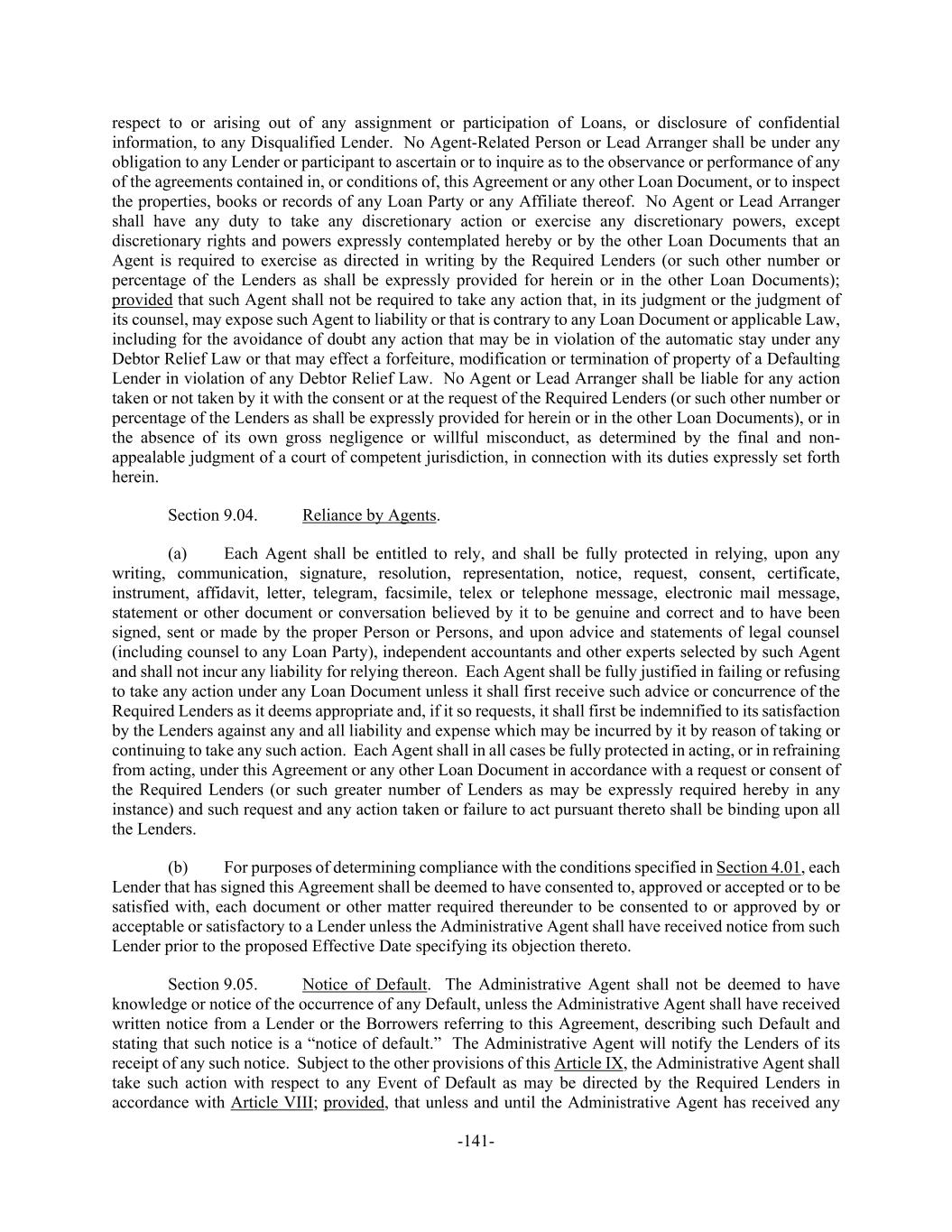 -141- respect to or arising out of any assignment or participation of Loans, or disclosure of confidential information, to any Disqualified Lender. No Agent-Related Person or Lead Arranger shall be under any obligation to any Lender or participant to ascertain or to inquire as to the observance or performance of any of the agreements contained in, or conditions of, this Agreement or any other Loan Document, or to inspect the properties, books or records of any Loan Party or any Affiliate thereof. No Agent or Lead Arranger shall have any duty to take any discretionary action or exercise any discretionary powers, except discretionary rights and powers expressly contemplated hereby or by the other Loan Documents that an Agent is required to exercise as directed in writing by the Required Lenders (or such other number or percentage of the Lenders as shall be expressly provided for herein or in the other Loan Documents); provided that such Agent shall not be required to take any action that, in its judgment or the judgment of its counsel, may expose such Agent to liability or that is contrary to any Loan Document or applicable Law, including for the avoidance of doubt any action that may be in violation of the automatic stay under any Debtor Relief Law or that may effect a forfeiture, modification or termination of property of a Defaulting Lender in violation of any Debtor Relief Law. No Agent or Lead Arranger shall be liable for any action taken or not taken by it with the consent or at the request of the Required Lenders (or such other number or percentage of the Lenders as shall be expressly provided for herein or in the other Loan Documents), or in the absence of its own gross negligence or willful misconduct, as determined by the final and non- appealable judgment of a court of competent jurisdiction, in connection with its duties expressly set forth herein. Section 9.04. Reliance by Agents. (a) Each Agent shall be entitled to rely, and shall be fully protected in relying, upon any writing, communication, signature, resolution, representation, notice, request, consent, certificate, instrument, affidavit, letter, telegram, facsimile, telex or telephone message, electronic mail message, statement or other document or conversation believed by it to be genuine and correct and to have been signed, sent or made by the proper Person or Persons, and upon advice and statements of legal counsel (including counsel to any Loan Party), independent accountants and other experts selected by such Agent and shall not incur any liability for relying thereon. Each Agent shall be fully justified in failing or refusing to take any action under any Loan Document unless it shall first receive such advice or concurrence of the Required Lenders as it deems appropriate and, if it so requests, it shall first be indemnified to its satisfaction by the Lenders against any and all liability and expense which may be incurred by it by reason of taking or continuing to take any such action. Each Agent shall in all cases be fully protected in acting, or in refraining from acting, under this Agreement or any other Loan Document in accordance with a request or consent of the Required Lenders (or such greater number of Lenders as may be expressly required hereby in any instance) and such request and any action taken or failure to act pursuant thereto shall be binding upon all the Lenders. (b) For purposes of determining compliance with the conditions specified in Section 4.01, each Lender that has signed this Agreement shall be deemed to have consented to, approved or accepted or to be satisfied with, each document or other matter required thereunder to be consented to or approved by or acceptable or satisfactory to a Lender unless the Administrative Agent shall have received notice from such Lender prior to the proposed Effective Date specifying its objection thereto. Section 9.05. Notice of Default. The Administrative Agent shall not be deemed to have knowledge or notice of the occurrence of any Default, unless the Administrative Agent shall have received written notice from a Lender or the Borrowers referring to this Agreement, describing such Default and stating that such notice is a “notice of default.” The Administrative Agent will notify the Lenders of its receipt of any such notice. Subject to the other provisions of this Article IX, the Administrative Agent shall take such action with respect to any Event of Default as may be directed by the Required Lenders in accordance with Article VIII; provided, that unless and until the Administrative Agent has received any