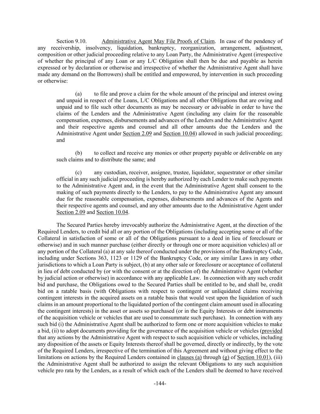 -144- Section 9.10. Administrative Agent May File Proofs of Claim. In case of the pendency of any receivership, insolvency, liquidation, bankruptcy, reorganization, arrangement, adjustment, composition or other judicial proceeding relative to any Loan Party, the Administrative Agent (irrespective of whether the principal of any Loan or any L/C Obligation shall then be due and payable as herein expressed or by declaration or otherwise and irrespective of whether the Administrative Agent shall have made any demand on the Borrowers) shall be entitled and empowered, by intervention in such proceeding or otherwise: (a) to file and prove a claim for the whole amount of the principal and interest owing and unpaid in respect of the Loans, L/C Obligations and all other Obligations that are owing and unpaid and to file such other documents as may be necessary or advisable in order to have the claims of the Lenders and the Administrative Agent (including any claim for the reasonable compensation, expenses, disbursements and advances of the Lenders and the Administrative Agent and their respective agents and counsel and all other amounts due the Lenders and the Administrative Agent under Section 2.09 and Section 10.04) allowed in such judicial proceeding; and (b) to collect and receive any monies or other property payable or deliverable on any such claims and to distribute the same; and (c) any custodian, receiver, assignee, trustee, liquidator, sequestrator or other similar official in any such judicial proceeding is hereby authorized by each Lender to make such payments to the Administrative Agent and, in the event that the Administrative Agent shall consent to the making of such payments directly to the Lenders, to pay to the Administrative Agent any amount due for the reasonable compensation, expenses, disbursements and advances of the Agents and their respective agents and counsel, and any other amounts due to the Administrative Agent under Section 2.09 and Section 10.04. The Secured Parties hereby irrevocably authorize the Administrative Agent, at the direction of the Required Lenders, to credit bid all or any portion of the Obligations (including accepting some or all of the Collateral in satisfaction of some or all of the Obligations pursuant to a deed in lieu of foreclosure or otherwise) and in such manner purchase (either directly or through one or more acquisition vehicles) all or any portion of the Collateral (a) at any sale thereof conducted under the provisions of the Bankruptcy Code, including under Sections 363, 1123 or 1129 of the Bankruptcy Code, or any similar Laws in any other jurisdictions to which a Loan Party is subject, (b) at any other sale or foreclosure or acceptance of collateral in lieu of debt conducted by (or with the consent or at the direction of) the Administrative Agent (whether by judicial action or otherwise) in accordance with any applicable Law. In connection with any such credit bid and purchase, the Obligations owed to the Secured Parties shall be entitled to be, and shall be, credit bid on a ratable basis (with Obligations with respect to contingent or unliquidated claims receiving contingent interests in the acquired assets on a ratable basis that would vest upon the liquidation of such claims in an amount proportional to the liquidated portion of the contingent claim amount used in allocating the contingent interests) in the asset or assets so purchased (or in the Equity Interests or debt instruments of the acquisition vehicle or vehicles that are used to consummate such purchase). In connection with any such bid (i) the Administrative Agent shall be authorized to form one or more acquisition vehicles to make a bid, (ii) to adopt documents providing for the governance of the acquisition vehicle or vehicles (provided that any actions by the Administrative Agent with respect to such acquisition vehicle or vehicles, including any disposition of the assets or Equity Interests thereof shall be governed, directly or indirectly, by the vote of the Required Lenders, irrespective of the termination of this Agreement and without giving effect to the limitations on actions by the Required Lenders contained in clauses (a) through (g) of Section 10.01), (iii) the Administrative Agent shall be authorized to assign the relevant Obligations to any such acquisition vehicle pro rata by the Lenders, as a result of which each of the Lenders shall be deemed to have received