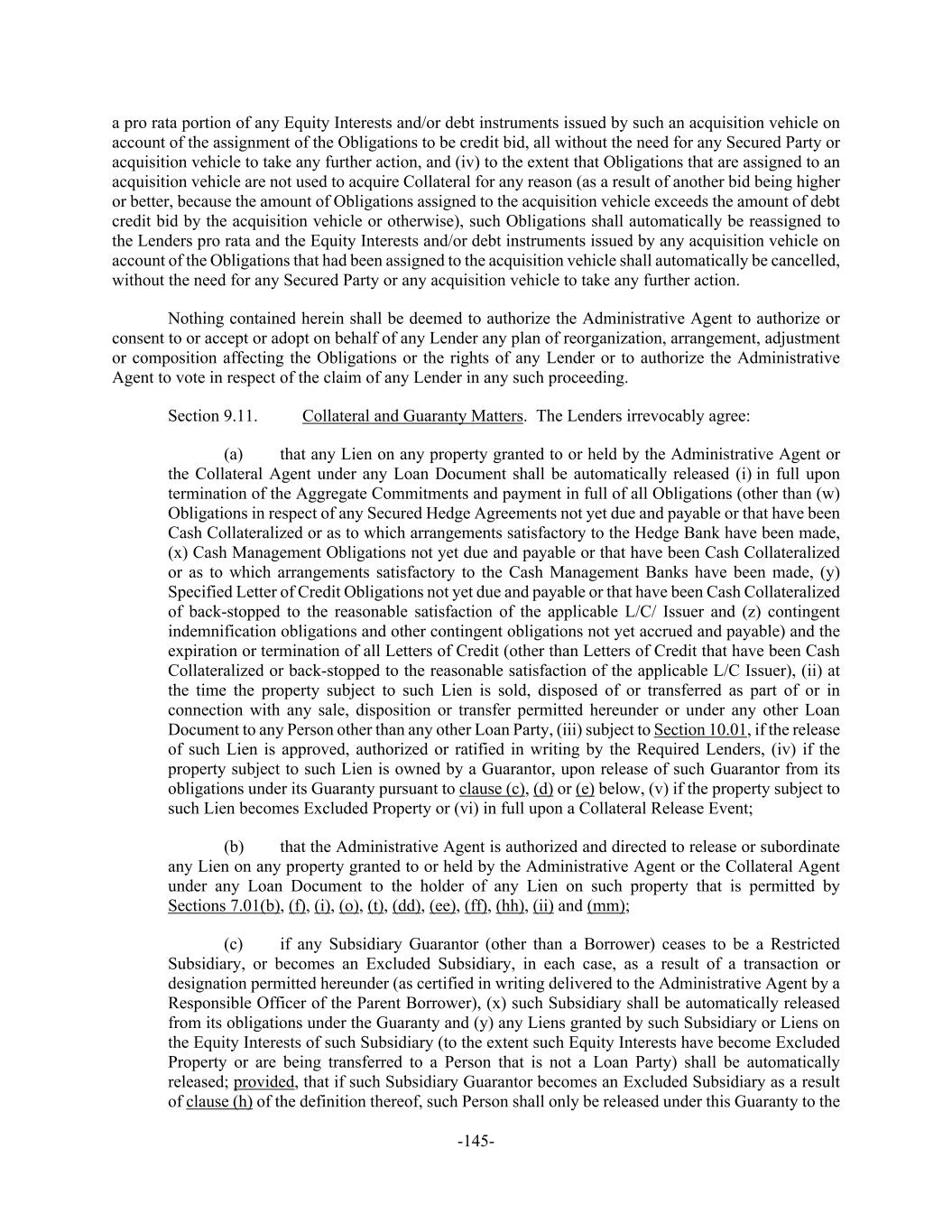 -145- a pro rata portion of any Equity Interests and/or debt instruments issued by such an acquisition vehicle on account of the assignment of the Obligations to be credit bid, all without the need for any Secured Party or acquisition vehicle to take any further action, and (iv) to the extent that Obligations that are assigned to an acquisition vehicle are not used to acquire Collateral for any reason (as a result of another bid being higher or better, because the amount of Obligations assigned to the acquisition vehicle exceeds the amount of debt credit bid by the acquisition vehicle or otherwise), such Obligations shall automatically be reassigned to the Lenders pro rata and the Equity Interests and/or debt instruments issued by any acquisition vehicle on account of the Obligations that had been assigned to the acquisition vehicle shall automatically be cancelled, without the need for any Secured Party or any acquisition vehicle to take any further action. Nothing contained herein shall be deemed to authorize the Administrative Agent to authorize or consent to or accept or adopt on behalf of any Lender any plan of reorganization, arrangement, adjustment or composition affecting the Obligations or the rights of any Lender or to authorize the Administrative Agent to vote in respect of the claim of any Lender in any such proceeding. Section 9.11. Collateral and Guaranty Matters. The Lenders irrevocably agree: (a) that any Lien on any property granted to or held by the Administrative Agent or the Collateral Agent under any Loan Document shall be automatically released (i) in full upon termination of the Aggregate Commitments and payment in full of all Obligations (other than (w) Obligations in respect of any Secured Hedge Agreements not yet due and payable or that have been Cash Collateralized or as to which arrangements satisfactory to the Hedge Bank have been made, (x) Cash Management Obligations not yet due and payable or that have been Cash Collateralized or as to which arrangements satisfactory to the Cash Management Banks have been made, (y) Specified Letter of Credit Obligations not yet due and payable or that have been Cash Collateralized of back-stopped to the reasonable satisfaction of the applicable L/C/ Issuer and (z) contingent indemnification obligations and other contingent obligations not yet accrued and payable) and the expiration or termination of all Letters of Credit (other than Letters of Credit that have been Cash Collateralized or back-stopped to the reasonable satisfaction of the applicable L/C Issuer), (ii) at the time the property subject to such Lien is sold, disposed of or transferred as part of or in connection with any sale, disposition or transfer permitted hereunder or under any other Loan Document to any Person other than any other Loan Party, (iii) subject to Section 10.01, if the release of such Lien is approved, authorized or ratified in writing by the Required Lenders, (iv) if the property subject to such Lien is owned by a Guarantor, upon release of such Guarantor from its obligations under its Guaranty pursuant to clause (c), (d) or (e) below, (v) if the property subject to such Lien becomes Excluded Property or (vi) in full upon a Collateral Release Event; (b) that the Administrative Agent is authorized and directed to release or subordinate any Lien on any property granted to or held by the Administrative Agent or the Collateral Agent under any Loan Document to the holder of any Lien on such property that is permitted by Sections 7.01(b), (f), (i), (o), (t), (dd), (ee), (ff), (hh), (ii) and (mm); (c) if any Subsidiary Guarantor (other than a Borrower) ceases to be a Restricted Subsidiary, or becomes an Excluded Subsidiary, in each case, as a result of a transaction or designation permitted hereunder (as certified in writing delivered to the Administrative Agent by a Responsible Officer of the Parent Borrower), (x) such Subsidiary shall be automatically released from its obligations under the Guaranty and (y) any Liens granted by such Subsidiary or Liens on the Equity Interests of such Subsidiary (to the extent such Equity Interests have become Excluded Property or are being transferred to a Person that is not a Loan Party) shall be automatically released; provided, that if such Subsidiary Guarantor becomes an Excluded Subsidiary as a result of clause (h) of the definition thereof, such Person shall only be released under this Guaranty to the