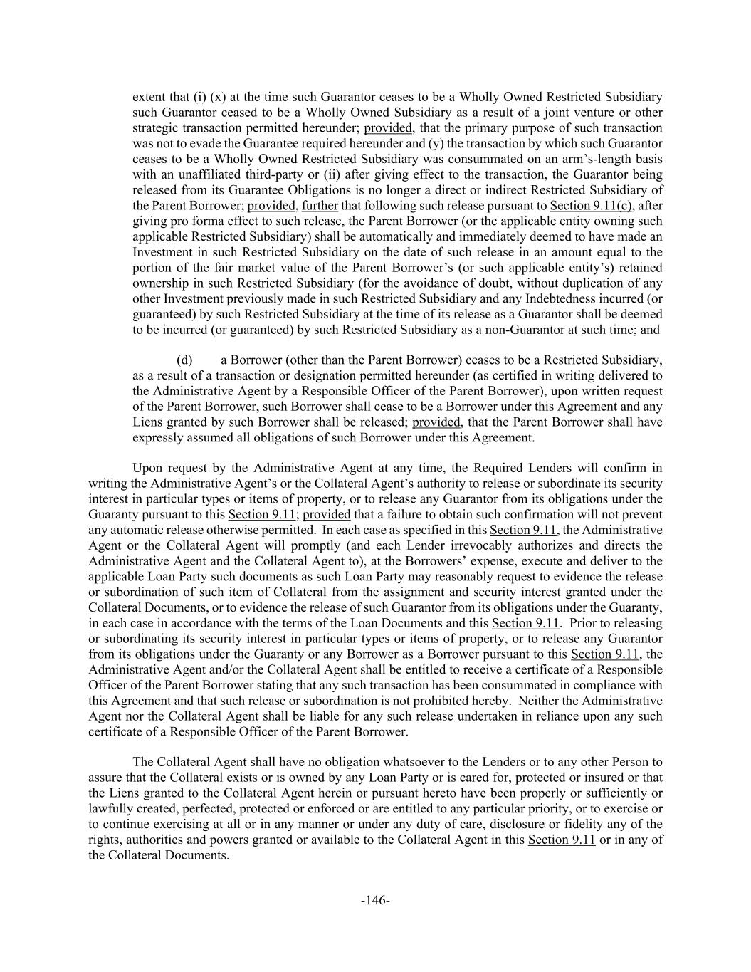 -146- extent that (i) (x) at the time such Guarantor ceases to be a Wholly Owned Restricted Subsidiary such Guarantor ceased to be a Wholly Owned Subsidiary as a result of a joint venture or other strategic transaction permitted hereunder; provided, that the primary purpose of such transaction was not to evade the Guarantee required hereunder and (y) the transaction by which such Guarantor ceases to be a Wholly Owned Restricted Subsidiary was consummated on an arm’s-length basis with an unaffiliated third-party or (ii) after giving effect to the transaction, the Guarantor being released from its Guarantee Obligations is no longer a direct or indirect Restricted Subsidiary of the Parent Borrower; provided, further that following such release pursuant to Section 9.11(c), after giving pro forma effect to such release, the Parent Borrower (or the applicable entity owning such applicable Restricted Subsidiary) shall be automatically and immediately deemed to have made an Investment in such Restricted Subsidiary on the date of such release in an amount equal to the portion of the fair market value of the Parent Borrower’s (or such applicable entity’s) retained ownership in such Restricted Subsidiary (for the avoidance of doubt, without duplication of any other Investment previously made in such Restricted Subsidiary and any Indebtedness incurred (or guaranteed) by such Restricted Subsidiary at the time of its release as a Guarantor shall be deemed to be incurred (or guaranteed) by such Restricted Subsidiary as a non-Guarantor at such time; and (d) a Borrower (other than the Parent Borrower) ceases to be a Restricted Subsidiary, as a result of a transaction or designation permitted hereunder (as certified in writing delivered to the Administrative Agent by a Responsible Officer of the Parent Borrower), upon written request of the Parent Borrower, such Borrower shall cease to be a Borrower under this Agreement and any Liens granted by such Borrower shall be released; provided, that the Parent Borrower shall have expressly assumed all obligations of such Borrower under this Agreement. Upon request by the Administrative Agent at any time, the Required Lenders will confirm in writing the Administrative Agent’s or the Collateral Agent’s authority to release or subordinate its security interest in particular types or items of property, or to release any Guarantor from its obligations under the Guaranty pursuant to this Section 9.11; provided that a failure to obtain such confirmation will not prevent any automatic release otherwise permitted. In each case as specified in this Section 9.11, the Administrative Agent or the Collateral Agent will promptly (and each Lender irrevocably authorizes and directs the Administrative Agent and the Collateral Agent to), at the Borrowers’ expense, execute and deliver to the applicable Loan Party such documents as such Loan Party may reasonably request to evidence the release or subordination of such item of Collateral from the assignment and security interest granted under the Collateral Documents, or to evidence the release of such Guarantor from its obligations under the Guaranty, in each case in accordance with the terms of the Loan Documents and this Section 9.11. Prior to releasing or subordinating its security interest in particular types or items of property, or to release any Guarantor from its obligations under the Guaranty or any Borrower as a Borrower pursuant to this Section 9.11, the Administrative Agent and/or the Collateral Agent shall be entitled to receive a certificate of a Responsible Officer of the Parent Borrower stating that any such transaction has been consummated in compliance with this Agreement and that such release or subordination is not prohibited hereby. Neither the Administrative Agent nor the Collateral Agent shall be liable for any such release undertaken in reliance upon any such certificate of a Responsible Officer of the Parent Borrower. The Collateral Agent shall have no obligation whatsoever to the Lenders or to any other Person to assure that the Collateral exists or is owned by any Loan Party or is cared for, protected or insured or that the Liens granted to the Collateral Agent herein or pursuant hereto have been properly or sufficiently or lawfully created, perfected, protected or enforced or are entitled to any particular priority, or to exercise or to continue exercising at all or in any manner or under any duty of care, disclosure or fidelity any of the rights, authorities and powers granted or available to the Collateral Agent in this Section 9.11 or in any of the Collateral Documents.