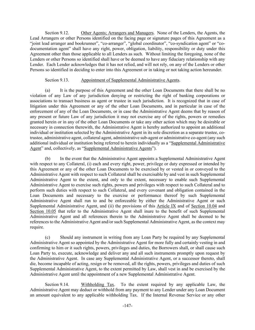 -147- Section 9.12. Other Agents; Arrangers and Managers. None of the Lenders, the Agents, the Lead Arrangers or other Persons identified on the facing page or signature pages of this Agreement as a “joint lead arranger and bookrunner”, “co-arranger”, “global coordinator”, “co-syndication agent” or “co- documentation agent” shall have any right, power, obligation, liability, responsibility or duty under this Agreement other than those applicable to all Lenders as such. Without limiting the foregoing, none of the Lenders or other Persons so identified shall have or be deemed to have any fiduciary relationship with any Lender. Each Lender acknowledges that it has not relied, and will not rely, on any of the Lenders or other Persons so identified in deciding to enter into this Agreement or in taking or not taking action hereunder. Section 9.13. Appointment of Supplemental Administrative Agents. (a) It is the purpose of this Agreement and the other Loan Documents that there shall be no violation of any Law of any jurisdiction denying or restricting the right of banking corporations or associations to transact business as agent or trustee in such jurisdiction. It is recognized that in case of litigation under this Agreement or any of the other Loan Documents, and in particular in case of the enforcement of any of the Loan Documents, or in case the Administrative Agent deems that by reason of any present or future Law of any jurisdiction it may not exercise any of the rights, powers or remedies granted herein or in any of the other Loan Documents or take any other action which may be desirable or necessary in connection therewith, the Administrative Agent is hereby authorized to appoint an additional individual or institution selected by the Administrative Agent in its sole discretion as a separate trustee, co- trustee, administrative agent, collateral agent, administrative sub-agent or administrative co-agent (any such additional individual or institution being referred to herein individually as a “Supplemental Administrative Agent” and, collectively, as “Supplemental Administrative Agents”). (b) In the event that the Administrative Agent appoints a Supplemental Administrative Agent with respect to any Collateral, (i) each and every right, power, privilege or duty expressed or intended by this Agreement or any of the other Loan Documents to be exercised by or vested in or conveyed to the Administrative Agent with respect to such Collateral shall be exercisable by and vest in such Supplemental Administrative Agent to the extent, and only to the extent, necessary to enable such Supplemental Administrative Agent to exercise such rights, powers and privileges with respect to such Collateral and to perform such duties with respect to such Collateral, and every covenant and obligation contained in the Loan Documents and necessary to the exercise or performance thereof by such Supplemental Administrative Agent shall run to and be enforceable by either the Administrative Agent or such Supplemental Administrative Agent, and (ii) the provisions of this Article IX and of Section 10.04 and Section 10.05 that refer to the Administrative Agent shall inure to the benefit of such Supplemental Administrative Agent and all references therein to the Administrative Agent shall be deemed to be references to the Administrative Agent and/or such Supplemental Administrative Agent, as the context may require. (c) Should any instrument in writing from any Loan Party be required by any Supplemental Administrative Agent so appointed by the Administrative Agent for more fully and certainly vesting in and confirming to him or it such rights, powers, privileges and duties, the Borrowers shall, or shall cause such Loan Party to, execute, acknowledge and deliver any and all such instruments promptly upon request by the Administrative Agent. In case any Supplemental Administrative Agent, or a successor thereto, shall die, become incapable of acting, resign or be removed, all the rights, powers, privileges and duties of such Supplemental Administrative Agent, to the extent permitted by Law, shall vest in and be exercised by the Administrative Agent until the appointment of a new Supplemental Administrative Agent. Section 9.14. Withholding Tax. To the extent required by any applicable Law, the Administrative Agent may deduct or withhold from any payment to any Lender under any Loan Document an amount equivalent to any applicable withholding Tax. If the Internal Revenue Service or any other