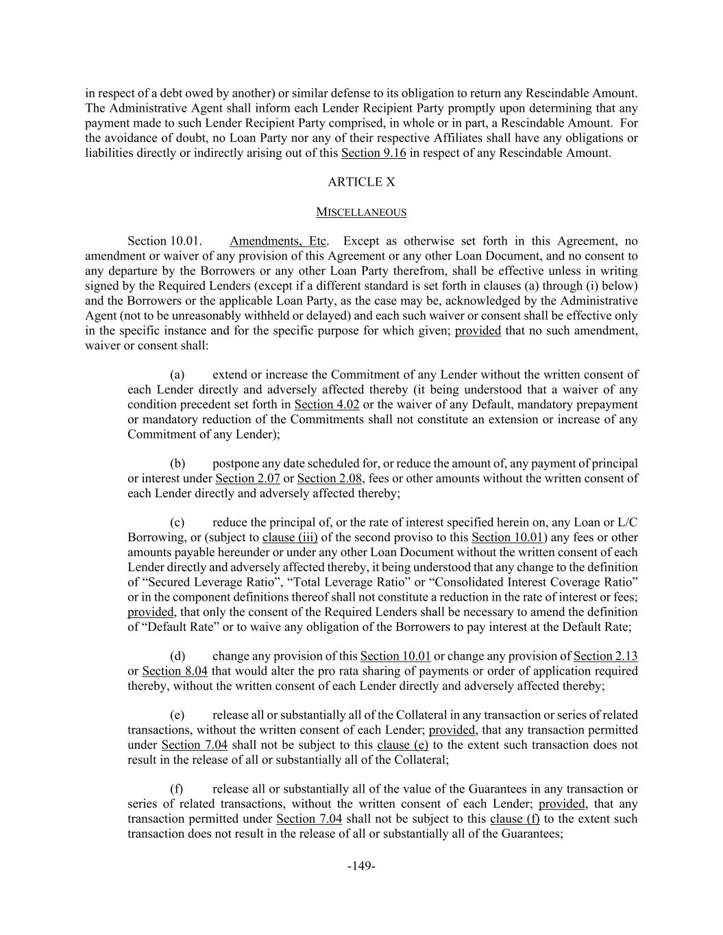-149- in respect of a debt owed by another) or similar defense to its obligation to return any Rescindable Amount. The Administrative Agent shall inform each Lender Recipient Party promptly upon determining that any payment made to such Lender Recipient Party comprised, in whole or in part, a Rescindable Amount. For the avoidance of doubt, no Loan Party nor any of their respective Affiliates shall have any obligations or liabilities directly or indirectly arising out of this Section 9.16 in respect of any Rescindable Amount. ARTICLE X MISCELLANEOUS Section 10.01. Amendments, Etc. Except as otherwise set forth in this Agreement, no amendment or waiver of any provision of this Agreement or any other Loan Document, and no consent to any departure by the Borrowers or any other Loan Party therefrom, shall be effective unless in writing signed by the Required Lenders (except if a different standard is set forth in clauses (a) through (i) below) and the Borrowers or the applicable Loan Party, as the case may be, acknowledged by the Administrative Agent (not to be unreasonably withheld or delayed) and each such waiver or consent shall be effective only in the specific instance and for the specific purpose for which given; provided that no such amendment, waiver or consent shall: (a) extend or increase the Commitment of any Lender without the written consent of each Lender directly and adversely affected thereby (it being understood that a waiver of any condition precedent set forth in Section 4.02 or the waiver of any Default, mandatory prepayment or mandatory reduction of the Commitments shall not constitute an extension or increase of any Commitment of any Lender); (b) postpone any date scheduled for, or reduce the amount of, any payment of principal or interest under Section 2.07 or Section 2.08, fees or other amounts without the written consent of each Lender directly and adversely affected thereby; (c) reduce the principal of, or the rate of interest specified herein on, any Loan or L/C Borrowing, or (subject to clause (iii) of the second proviso to this Section 10.01) any fees or other amounts payable hereunder or under any other Loan Document without the written consent of each Lender directly and adversely affected thereby, it being understood that any change to the definition of “Secured Leverage Ratio”, “Total Leverage Ratio” or “Consolidated Interest Coverage Ratio” or in the component definitions thereof shall not constitute a reduction in the rate of interest or fees; provided, that only the consent of the Required Lenders shall be necessary to amend the definition of “Default Rate” or to waive any obligation of the Borrowers to pay interest at the Default Rate; (d) change any provision of this Section 10.01 or change any provision of Section 2.13 or Section 8.04 that would alter the pro rata sharing of payments or order of application required thereby, without the written consent of each Lender directly and adversely affected thereby; (e) release all or substantially all of the Collateral in any transaction or series of related transactions, without the written consent of each Lender; provided, that any transaction permitted under Section 7.04 shall not be subject to this clause (e) to the extent such transaction does not result in the release of all or substantially all of the Collateral; (f) release all or substantially all of the value of the Guarantees in any transaction or series of related transactions, without the written consent of each Lender; provided, that any transaction permitted under Section 7.04 shall not be subject to this clause (f) to the extent such transaction does not result in the release of all or substantially all of the Guarantees;