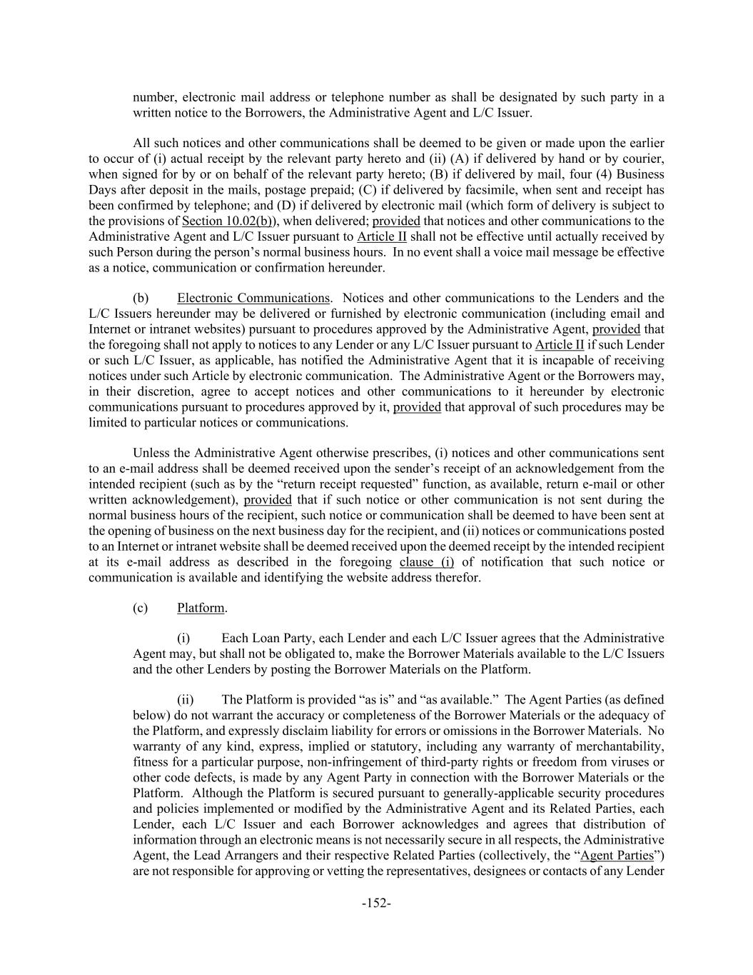 -152- number, electronic mail address or telephone number as shall be designated by such party in a written notice to the Borrowers, the Administrative Agent and L/C Issuer. All such notices and other communications shall be deemed to be given or made upon the earlier to occur of (i) actual receipt by the relevant party hereto and (ii) (A) if delivered by hand or by courier, when signed for by or on behalf of the relevant party hereto; (B) if delivered by mail, four (4) Business Days after deposit in the mails, postage prepaid; (C) if delivered by facsimile, when sent and receipt has been confirmed by telephone; and (D) if delivered by electronic mail (which form of delivery is subject to the provisions of Section 10.02(b)), when delivered; provided that notices and other communications to the Administrative Agent and L/C Issuer pursuant to Article II shall not be effective until actually received by such Person during the person’s normal business hours. In no event shall a voice mail message be effective as a notice, communication or confirmation hereunder. (b) Electronic Communications. Notices and other communications to the Lenders and the L/C Issuers hereunder may be delivered or furnished by electronic communication (including email and Internet or intranet websites) pursuant to procedures approved by the Administrative Agent, provided that the foregoing shall not apply to notices to any Lender or any L/C Issuer pursuant to Article II if such Lender or such L/C Issuer, as applicable, has notified the Administrative Agent that it is incapable of receiving notices under such Article by electronic communication. The Administrative Agent or the Borrowers may, in their discretion, agree to accept notices and other communications to it hereunder by electronic communications pursuant to procedures approved by it, provided that approval of such procedures may be limited to particular notices or communications. Unless the Administrative Agent otherwise prescribes, (i) notices and other communications sent to an e-mail address shall be deemed received upon the sender’s receipt of an acknowledgement from the intended recipient (such as by the “return receipt requested” function, as available, return e-mail or other written acknowledgement), provided that if such notice or other communication is not sent during the normal business hours of the recipient, such notice or communication shall be deemed to have been sent at the opening of business on the next business day for the recipient, and (ii) notices or communications posted to an Internet or intranet website shall be deemed received upon the deemed receipt by the intended recipient at its e-mail address as described in the foregoing clause (i) of notification that such notice or communication is available and identifying the website address therefor. (c) Platform. (i) Each Loan Party, each Lender and each L/C Issuer agrees that the Administrative Agent may, but shall not be obligated to, make the Borrower Materials available to the L/C Issuers and the other Lenders by posting the Borrower Materials on the Platform. (ii) The Platform is provided “as is” and “as available.” The Agent Parties (as defined below) do not warrant the accuracy or completeness of the Borrower Materials or the adequacy of the Platform, and expressly disclaim liability for errors or omissions in the Borrower Materials. No warranty of any kind, express, implied or statutory, including any warranty of merchantability, fitness for a particular purpose, non-infringement of third-party rights or freedom from viruses or other code defects, is made by any Agent Party in connection with the Borrower Materials or the Platform. Although the Platform is secured pursuant to generally-applicable security procedures and policies implemented or modified by the Administrative Agent and its Related Parties, each Lender, each L/C Issuer and each Borrower acknowledges and agrees that distribution of information through an electronic means is not necessarily secure in all respects, the Administrative Agent, the Lead Arrangers and their respective Related Parties (collectively, the “Agent Parties”) are not responsible for approving or vetting the representatives, designees or contacts of any Lender