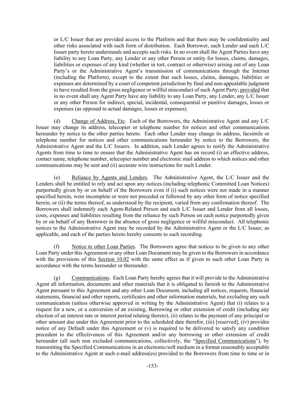 -153- or L/C Issuer that are provided access to the Platform and that there may be confidentiality and other risks associated with such form of distribution. Each Borrower, each Lender and each L/C Issuer party hereto understands and accepts such risks. In no event shall the Agent Parties have any liability to any Loan Party, any Lender or any other Person or entity for losses, claims, damages, liabilities or expenses of any kind (whether in tort, contract or otherwise) arising out of any Loan Party’s or the Administrative Agent’s transmission of communications through the Internet (including the Platform), except to the extent that such losses, claims, damages, liabilities or expenses are determined by a court of competent jurisdiction by final and non-appealable judgment to have resulted from the gross negligence or willful misconduct of such Agent Party; provided that in no event shall any Agent Party have any liability to any Loan Party, any Lender, any L/C Issuer or any other Person for indirect, special, incidental, consequential or punitive damages, losses or expenses (as opposed to actual damages, losses or expenses). (d) Change of Address, Etc. Each of the Borrowers, the Administrative Agent and any L/C Issuer may change its address, telecopier or telephone number for notices and other communications hereunder by notice to the other parties hereto. Each other Lender may change its address, facsimile or telephone number for notices and other communications hereunder by notice to the Borrowers, the Administrative Agent and the L/C Issuers. In addition, each Lender agrees to notify the Administrative Agents from time to time to ensure that the Administrative Agent has on record (i) an effective address, contact name, telephone number, telecopier number and electronic mail address to which notices and other communications may be sent and (ii) accurate wire instructions for such Lender. (e) Reliance by Agents and Lenders. The Administrative Agent, the L/C Issuer and the Lenders shall be entitled to rely and act upon any notices (including telephonic Committed Loan Notices) purportedly given by or on behalf of the Borrowers even if (i) such notices were not made in a manner specified herein, were incomplete or were not preceded or followed by any other form of notice specified herein, or (ii) the terms thereof, as understood by the recipient, varied from any confirmation thereof. The Borrowers shall indemnify each Agent-Related Person and each L/C Issuer and Lender from all losses, costs, expenses and liabilities resulting from the reliance by such Person on each notice purportedly given by or on behalf of any Borrower in the absence of gross negligence or willful misconduct. All telephonic notices to the Administrative Agent may be recorded by the Administrative Agent or the L/C Issuer, as applicable, and each of the parties hereto hereby consents to such recording. (f) Notice to other Loan Parties. The Borrowers agree that notices to be given to any other Loan Party under this Agreement or any other Loan Document may be given to the Borrowers in accordance with the provisions of this Section 10.02 with the same effect as if given to such other Loan Party in accordance with the terms hereunder or thereunder. (g) Communications. Each Loan Party hereby agrees that it will provide to the Administrative Agent all information, documents and other materials that it is obligated to furnish to the Administrative Agent pursuant to this Agreement and any other Loan Document, including all notices, requests, financial statements, financial and other reports, certificates and other information materials, but excluding any such communication (unless otherwise approved in writing by the Administrative Agent) that (i) relates to a request for a new, or a conversion of an existing, Borrowing or other extension of credit (including any election of an interest rate or interest period relating thereto), (ii) relates to the payment of any principal or other amount due under this Agreement prior to the scheduled date therefor, (iii) [reserved], (iv) provides notice of any Default under this Agreement or (v) is required to be delivered to satisfy any condition precedent to the effectiveness of this Agreement and/or any borrowing or other extension of credit hereunder (all such non excluded communications, collectively, the “Specified Communications”), by transmitting the Specified Communications in an electronic/soft medium in a format reasonably acceptable to the Administrative Agent at such e-mail address(es) provided to the Borrowers from time to time or in