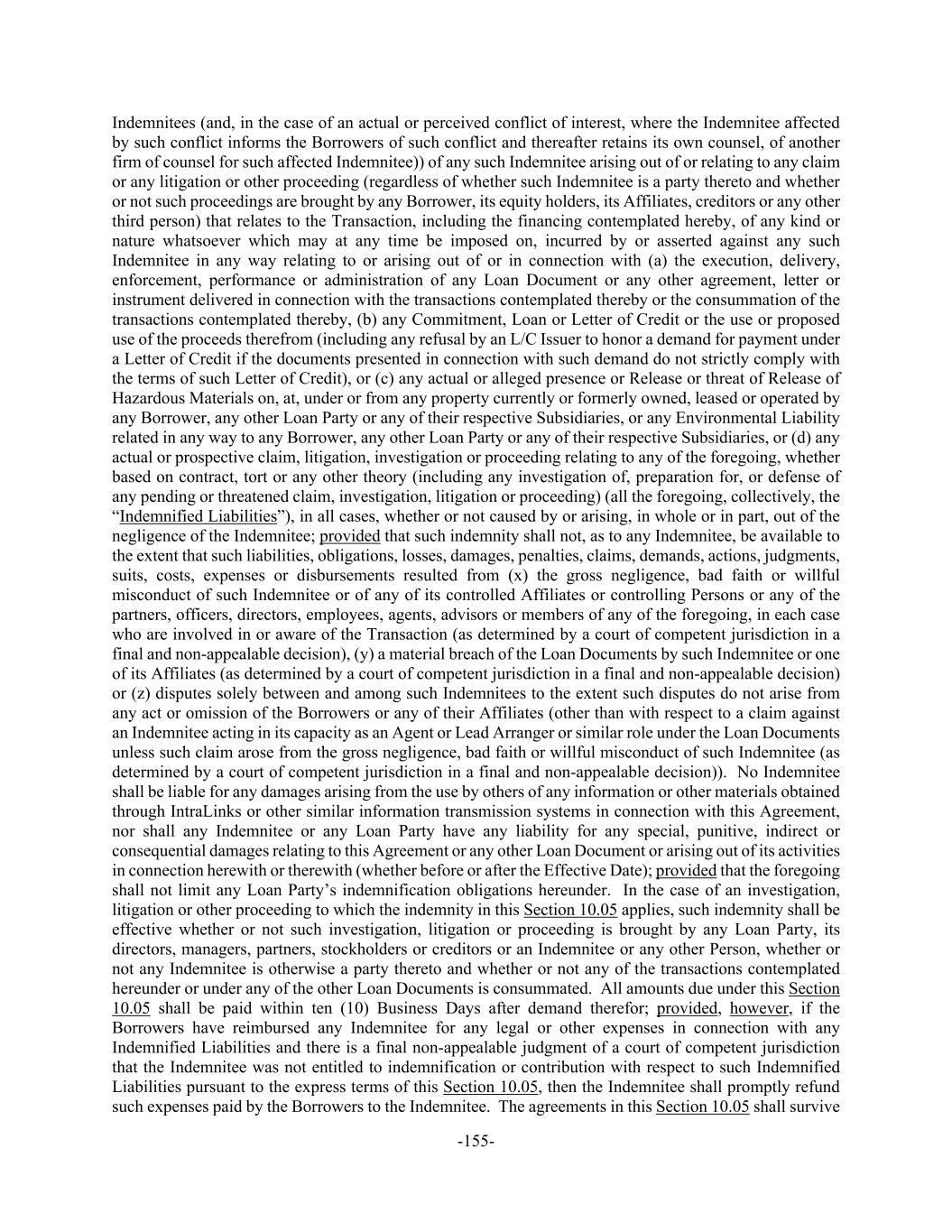-155- Indemnitees (and, in the case of an actual or perceived conflict of interest, where the Indemnitee affected by such conflict informs the Borrowers of such conflict and thereafter retains its own counsel, of another firm of counsel for such affected Indemnitee)) of any such Indemnitee arising out of or relating to any claim or any litigation or other proceeding (regardless of whether such Indemnitee is a party thereto and whether or not such proceedings are brought by any Borrower, its equity holders, its Affiliates, creditors or any other third person) that relates to the Transaction, including the financing contemplated hereby, of any kind or nature whatsoever which may at any time be imposed on, incurred by or asserted against any such Indemnitee in any way relating to or arising out of or in connection with (a) the execution, delivery, enforcement, performance or administration of any Loan Document or any other agreement, letter or instrument delivered in connection with the transactions contemplated thereby or the consummation of the transactions contemplated thereby, (b) any Commitment, Loan or Letter of Credit or the use or proposed use of the proceeds therefrom (including any refusal by an L/C Issuer to honor a demand for payment under a Letter of Credit if the documents presented in connection with such demand do not strictly comply with the terms of such Letter of Credit), or (c) any actual or alleged presence or Release or threat of Release of Hazardous Materials on, at, under or from any property currently or formerly owned, leased or operated by any Borrower, any other Loan Party or any of their respective Subsidiaries, or any Environmental Liability related in any way to any Borrower, any other Loan Party or any of their respective Subsidiaries, or (d) any actual or prospective claim, litigation, investigation or proceeding relating to any of the foregoing, whether based on contract, tort or any other theory (including any investigation of, preparation for, or defense of any pending or threatened claim, investigation, litigation or proceeding) (all the foregoing, collectively, the “Indemnified Liabilities”), in all cases, whether or not caused by or arising, in whole or in part, out of the negligence of the Indemnitee; provided that such indemnity shall not, as to any Indemnitee, be available to the extent that such liabilities, obligations, losses, damages, penalties, claims, demands, actions, judgments, suits, costs, expenses or disbursements resulted from (x) the gross negligence, bad faith or willful misconduct of such Indemnitee or of any of its controlled Affiliates or controlling Persons or any of the partners, officers, directors, employees, agents, advisors or members of any of the foregoing, in each case who are involved in or aware of the Transaction (as determined by a court of competent jurisdiction in a final and non-appealable decision), (y) a material breach of the Loan Documents by such Indemnitee or one of its Affiliates (as determined by a court of competent jurisdiction in a final and non-appealable decision) or (z) disputes solely between and among such Indemnitees to the extent such disputes do not arise from any act or omission of the Borrowers or any of their Affiliates (other than with respect to a claim against an Indemnitee acting in its capacity as an Agent or Lead Arranger or similar role under the Loan Documents unless such claim arose from the gross negligence, bad faith or willful misconduct of such Indemnitee (as determined by a court of competent jurisdiction in a final and non-appealable decision)). No Indemnitee shall be liable for any damages arising from the use by others of any information or other materials obtained through IntraLinks or other similar information transmission systems in connection with this Agreement, nor shall any Indemnitee or any Loan Party have any liability for any special, punitive, indirect or consequential damages relating to this Agreement or any other Loan Document or arising out of its activities in connection herewith or therewith (whether before or after the Effective Date); provided that the foregoing shall not limit any Loan Party’s indemnification obligations hereunder. In the case of an investigation, litigation or other proceeding to which the indemnity in this Section 10.05 applies, such indemnity shall be effective whether or not such investigation, litigation or proceeding is brought by any Loan Party, its directors, managers, partners, stockholders or creditors or an Indemnitee or any other Person, whether or not any Indemnitee is otherwise a party thereto and whether or not any of the transactions contemplated hereunder or under any of the other Loan Documents is consummated. All amounts due under this Section 10.05 shall be paid within ten (10) Business Days after demand therefor; provided, however, if the Borrowers have reimbursed any Indemnitee for any legal or other expenses in connection with any Indemnified Liabilities and there is a final non-appealable judgment of a court of competent jurisdiction that the Indemnitee was not entitled to indemnification or contribution with respect to such Indemnified Liabilities pursuant to the express terms of this Section 10.05, then the Indemnitee shall promptly refund such expenses paid by the Borrowers to the Indemnitee. The agreements in this Section 10.05 shall survive