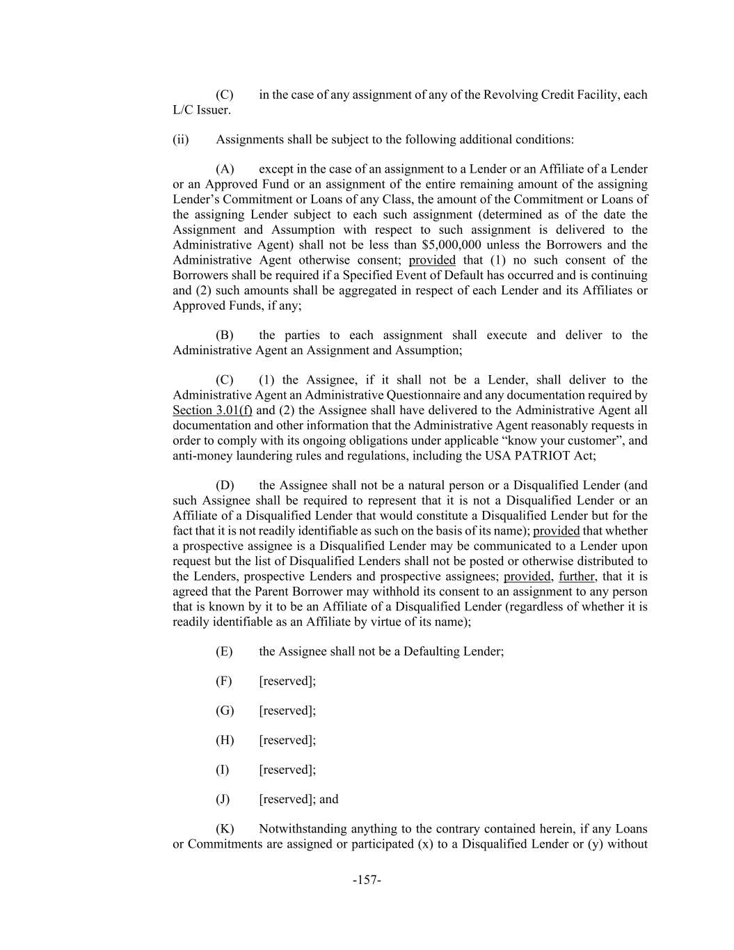 -157- (C) in the case of any assignment of any of the Revolving Credit Facility, each L/C Issuer. (ii) Assignments shall be subject to the following additional conditions: (A) except in the case of an assignment to a Lender or an Affiliate of a Lender or an Approved Fund or an assignment of the entire remaining amount of the assigning Lender’s Commitment or Loans of any Class, the amount of the Commitment or Loans of the assigning Lender subject to each such assignment (determined as of the date the Assignment and Assumption with respect to such assignment is delivered to the Administrative Agent) shall not be less than $5,000,000 unless the Borrowers and the Administrative Agent otherwise consent; provided that (1) no such consent of the Borrowers shall be required if a Specified Event of Default has occurred and is continuing and (2) such amounts shall be aggregated in respect of each Lender and its Affiliates or Approved Funds, if any; (B) the parties to each assignment shall execute and deliver to the Administrative Agent an Assignment and Assumption; (C) (1) the Assignee, if it shall not be a Lender, shall deliver to the Administrative Agent an Administrative Questionnaire and any documentation required by Section 3.01(f) and (2) the Assignee shall have delivered to the Administrative Agent all documentation and other information that the Administrative Agent reasonably requests in order to comply with its ongoing obligations under applicable “know your customer”, and anti-money laundering rules and regulations, including the USA PATRIOT Act; (D) the Assignee shall not be a natural person or a Disqualified Lender (and such Assignee shall be required to represent that it is not a Disqualified Lender or an Affiliate of a Disqualified Lender that would constitute a Disqualified Lender but for the fact that it is not readily identifiable as such on the basis of its name); provided that whether a prospective assignee is a Disqualified Lender may be communicated to a Lender upon request but the list of Disqualified Lenders shall not be posted or otherwise distributed to the Lenders, prospective Lenders and prospective assignees; provided, further, that it is agreed that the Parent Borrower may withhold its consent to an assignment to any person that is known by it to be an Affiliate of a Disqualified Lender (regardless of whether it is readily identifiable as an Affiliate by virtue of its name); (E) the Assignee shall not be a Defaulting Lender; (F) [reserved]; (G) [reserved]; (H) [reserved]; (I) [reserved]; (J) [reserved]; and (K) Notwithstanding anything to the contrary contained herein, if any Loans or Commitments are assigned or participated (x) to a Disqualified Lender or (y) without