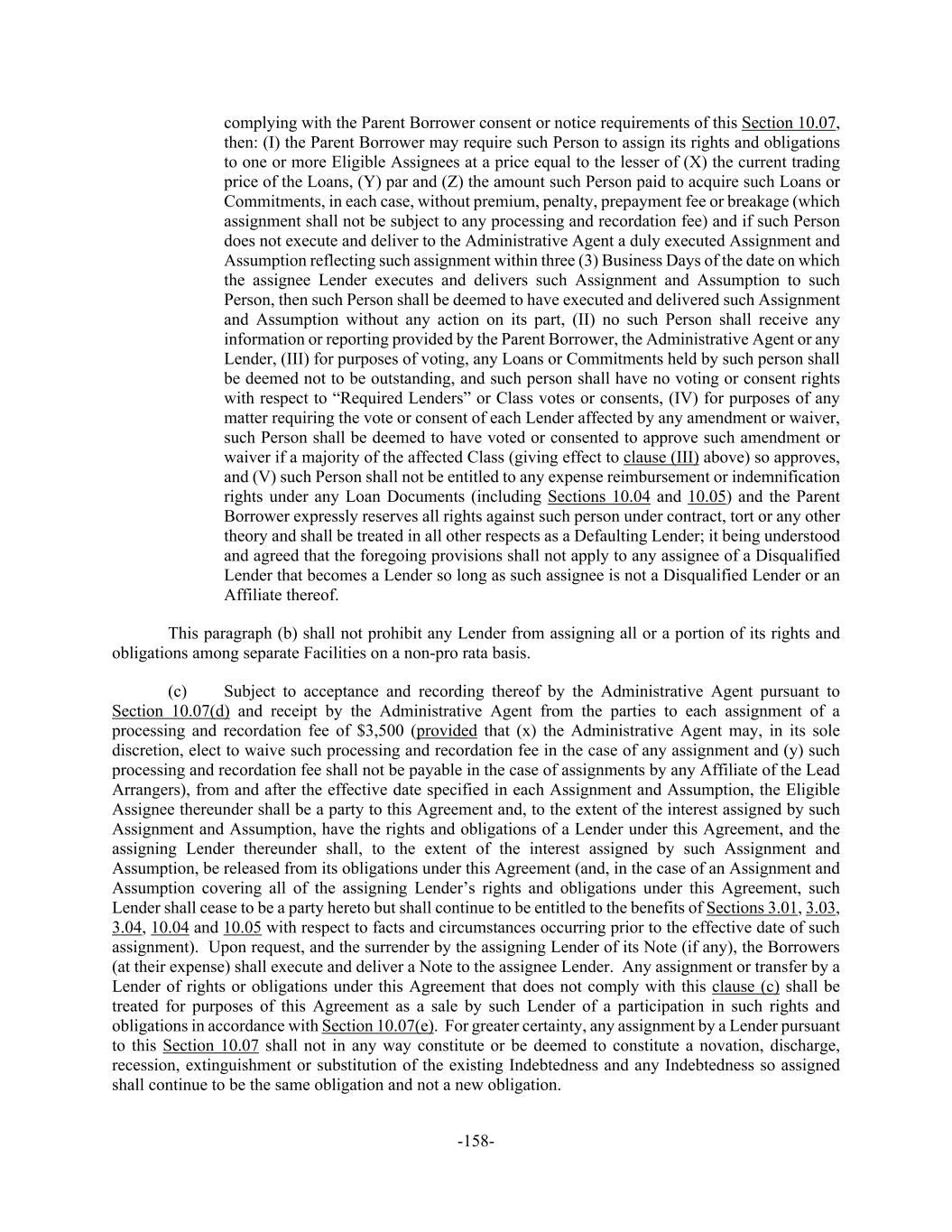 -158- complying with the Parent Borrower consent or notice requirements of this Section 10.07, then: (I) the Parent Borrower may require such Person to assign its rights and obligations to one or more Eligible Assignees at a price equal to the lesser of (X) the current trading price of the Loans, (Y) par and (Z) the amount such Person paid to acquire such Loans or Commitments, in each case, without premium, penalty, prepayment fee or breakage (which assignment shall not be subject to any processing and recordation fee) and if such Person does not execute and deliver to the Administrative Agent a duly executed Assignment and Assumption reflecting such assignment within three (3) Business Days of the date on which the assignee Lender executes and delivers such Assignment and Assumption to such Person, then such Person shall be deemed to have executed and delivered such Assignment and Assumption without any action on its part, (II) no such Person shall receive any information or reporting provided by the Parent Borrower, the Administrative Agent or any Lender, (III) for purposes of voting, any Loans or Commitments held by such person shall be deemed not to be outstanding, and such person shall have no voting or consent rights with respect to “Required Lenders” or Class votes or consents, (IV) for purposes of any matter requiring the vote or consent of each Lender affected by any amendment or waiver, such Person shall be deemed to have voted or consented to approve such amendment or waiver if a majority of the affected Class (giving effect to clause (III) above) so approves, and (V) such Person shall not be entitled to any expense reimbursement or indemnification rights under any Loan Documents (including Sections 10.04 and 10.05) and the Parent Borrower expressly reserves all rights against such person under contract, tort or any other theory and shall be treated in all other respects as a Defaulting Lender; it being understood and agreed that the foregoing provisions shall not apply to any assignee of a Disqualified Lender that becomes a Lender so long as such assignee is not a Disqualified Lender or an Affiliate thereof. This paragraph (b) shall not prohibit any Lender from assigning all or a portion of its rights and obligations among separate Facilities on a non-pro rata basis. (c) Subject to acceptance and recording thereof by the Administrative Agent pursuant to Section 10.07(d) and receipt by the Administrative Agent from the parties to each assignment of a processing and recordation fee of $3,500 (provided that (x) the Administrative Agent may, in its sole discretion, elect to waive such processing and recordation fee in the case of any assignment and (y) such processing and recordation fee shall not be payable in the case of assignments by any Affiliate of the Lead Arrangers), from and after the effective date specified in each Assignment and Assumption, the Eligible Assignee thereunder shall be a party to this Agreement and, to the extent of the interest assigned by such Assignment and Assumption, have the rights and obligations of a Lender under this Agreement, and the assigning Lender thereunder shall, to the extent of the interest assigned by such Assignment and Assumption, be released from its obligations under this Agreement (and, in the case of an Assignment and Assumption covering all of the assigning Lender’s rights and obligations under this Agreement, such Lender shall cease to be a party hereto but shall continue to be entitled to the benefits of Sections 3.01, 3.03, 3.04, 10.04 and 10.05 with respect to facts and circumstances occurring prior to the effective date of such assignment). Upon request, and the surrender by the assigning Lender of its Note (if any), the Borrowers (at their expense) shall execute and deliver a Note to the assignee Lender. Any assignment or transfer by a Lender of rights or obligations under this Agreement that does not comply with this clause (c) shall be treated for purposes of this Agreement as a sale by such Lender of a participation in such rights and obligations in accordance with Section 10.07(e). For greater certainty, any assignment by a Lender pursuant to this Section 10.07 shall not in any way constitute or be deemed to constitute a novation, discharge, recession, extinguishment or substitution of the existing Indebtedness and any Indebtedness so assigned shall continue to be the same obligation and not a new obligation.