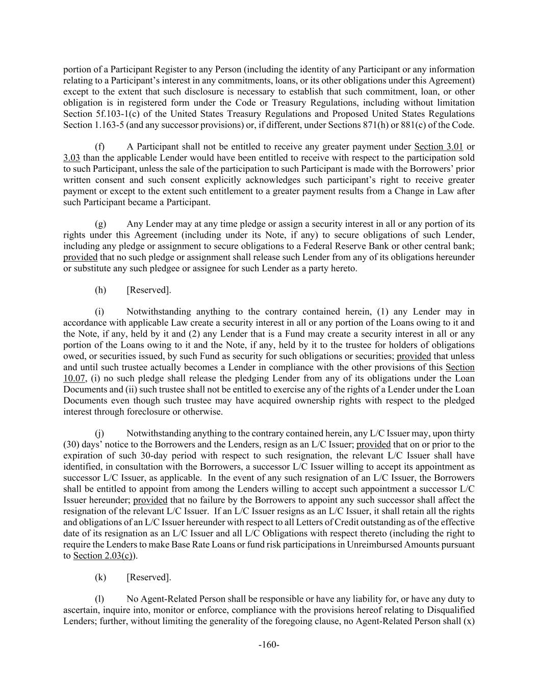 -160- portion of a Participant Register to any Person (including the identity of any Participant or any information relating to a Participant’s interest in any commitments, loans, or its other obligations under this Agreement) except to the extent that such disclosure is necessary to establish that such commitment, loan, or other obligation is in registered form under the Code or Treasury Regulations, including without limitation Section 5f.103-1(c) of the United States Treasury Regulations and Proposed United States Regulations Section 1.163-5 (and any successor provisions) or, if different, under Sections 871(h) or 881(c) of the Code. (f) A Participant shall not be entitled to receive any greater payment under Section 3.01 or 3.03 than the applicable Lender would have been entitled to receive with respect to the participation sold to such Participant, unless the sale of the participation to such Participant is made with the Borrowers’ prior written consent and such consent explicitly acknowledges such participant’s right to receive greater payment or except to the extent such entitlement to a greater payment results from a Change in Law after such Participant became a Participant. (g) Any Lender may at any time pledge or assign a security interest in all or any portion of its rights under this Agreement (including under its Note, if any) to secure obligations of such Lender, including any pledge or assignment to secure obligations to a Federal Reserve Bank or other central bank; provided that no such pledge or assignment shall release such Lender from any of its obligations hereunder or substitute any such pledgee or assignee for such Lender as a party hereto. (h) [Reserved]. (i) Notwithstanding anything to the contrary contained herein, (1) any Lender may in accordance with applicable Law create a security interest in all or any portion of the Loans owing to it and the Note, if any, held by it and (2) any Lender that is a Fund may create a security interest in all or any portion of the Loans owing to it and the Note, if any, held by it to the trustee for holders of obligations owed, or securities issued, by such Fund as security for such obligations or securities; provided that unless and until such trustee actually becomes a Lender in compliance with the other provisions of this Section 10.07, (i) no such pledge shall release the pledging Lender from any of its obligations under the Loan Documents and (ii) such trustee shall not be entitled to exercise any of the rights of a Lender under the Loan Documents even though such trustee may have acquired ownership rights with respect to the pledged interest through foreclosure or otherwise. (j) Notwithstanding anything to the contrary contained herein, any L/C Issuer may, upon thirty (30) days’ notice to the Borrowers and the Lenders, resign as an L/C Issuer; provided that on or prior to the expiration of such 30-day period with respect to such resignation, the relevant L/C Issuer shall have identified, in consultation with the Borrowers, a successor L/C Issuer willing to accept its appointment as successor L/C Issuer, as applicable. In the event of any such resignation of an L/C Issuer, the Borrowers shall be entitled to appoint from among the Lenders willing to accept such appointment a successor L/C Issuer hereunder; provided that no failure by the Borrowers to appoint any such successor shall affect the resignation of the relevant L/C Issuer. If an L/C Issuer resigns as an L/C Issuer, it shall retain all the rights and obligations of an L/C Issuer hereunder with respect to all Letters of Credit outstanding as of the effective date of its resignation as an L/C Issuer and all L/C Obligations with respect thereto (including the right to require the Lenders to make Base Rate Loans or fund risk participations in Unreimbursed Amounts pursuant to Section 2.03(c)). (k) [Reserved]. (l) No Agent-Related Person shall be responsible or have any liability for, or have any duty to ascertain, inquire into, monitor or enforce, compliance with the provisions hereof relating to Disqualified Lenders; further, without limiting the generality of the foregoing clause, no Agent-Related Person shall (x)