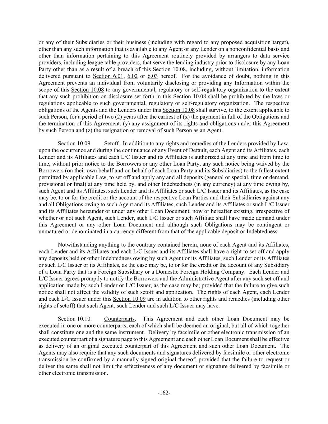 -162- or any of their Subsidiaries or their business (including with regard to any proposed acquisition target), other than any such information that is available to any Agent or any Lender on a nonconfidential basis and other than information pertaining to this Agreement routinely provided by arrangers to data service providers, including league table providers, that serve the lending industry prior to disclosure by any Loan Party other than as a result of a breach of this Section 10.08, including, without limitation, information delivered pursuant to Section 6.01, 6.02 or 6.03 hereof. For the avoidance of doubt, nothing in this Agreement prevents an individual from voluntarily disclosing or providing any Information within the scope of this Section 10.08 to any governmental, regulatory or self-regulatory organization to the extent that any such prohibition on disclosure set forth in this Section 10.08 shall be prohibited by the laws or regulations applicable to such governmental, regulatory or self-regulatory organization. The respective obligations of the Agents and the Lenders under this Section 10.08 shall survive, to the extent applicable to such Person, for a period of two (2) years after the earliest of (x) the payment in full of the Obligations and the termination of this Agreement, (y) any assignment of its rights and obligations under this Agreement by such Person and (z) the resignation or removal of such Person as an Agent. Section 10.09. Setoff. In addition to any rights and remedies of the Lenders provided by Law, upon the occurrence and during the continuance of any Event of Default, each Agent and its Affiliates, each Lender and its Affiliates and each L/C Issuer and its Affiliates is authorized at any time and from time to time, without prior notice to the Borrowers or any other Loan Party, any such notice being waived by the Borrowers (on their own behalf and on behalf of each Loan Party and its Subsidiaries) to the fullest extent permitted by applicable Law, to set off and apply any and all deposits (general or special, time or demand, provisional or final) at any time held by, and other Indebtedness (in any currency) at any time owing by, such Agent and its Affiliates, such Lender and its Affiliates or such L/C Issuer and its Affiliates, as the case may be, to or for the credit or the account of the respective Loan Parties and their Subsidiaries against any and all Obligations owing to such Agent and its Affiliates, such Lender and its Affiliates or such L/C Issuer and its Affiliates hereunder or under any other Loan Document, now or hereafter existing, irrespective of whether or not such Agent, such Lender, such L/C Issuer or such Affiliate shall have made demand under this Agreement or any other Loan Document and although such Obligations may be contingent or unmatured or denominated in a currency different from that of the applicable deposit or Indebtedness. Notwithstanding anything to the contrary contained herein, none of each Agent and its Affiliates, each Lender and its Affiliates and each L/C Issuer and its Affiliates shall have a right to set off and apply any deposits held or other Indebtedness owing by such Agent or its Affiliates, such Lender or its Affiliates or such L/C Issuer or its Affiliates, as the case may be, to or for the credit or the account of any Subsidiary of a Loan Party that is a Foreign Subsidiary or a Domestic Foreign Holding Company. Each Lender and L/C Issuer agrees promptly to notify the Borrowers and the Administrative Agent after any such set off and application made by such Lender or L/C Issuer, as the case may be; provided that the failure to give such notice shall not affect the validity of such setoff and application. The rights of each Agent, each Lender and each L/C Issuer under this Section 10.09 are in addition to other rights and remedies (including other rights of setoff) that such Agent, such Lender and such L/C Issuer may have. Section 10.10. Counterparts. This Agreement and each other Loan Document may be executed in one or more counterparts, each of which shall be deemed an original, but all of which together shall constitute one and the same instrument. Delivery by facsimile or other electronic transmission of an executed counterpart of a signature page to this Agreement and each other Loan Document shall be effective as delivery of an original executed counterpart of this Agreement and such other Loan Document. The Agents may also require that any such documents and signatures delivered by facsimile or other electronic transmission be confirmed by a manually signed original thereof; provided that the failure to request or deliver the same shall not limit the effectiveness of any document or signature delivered by facsimile or other electronic transmission.