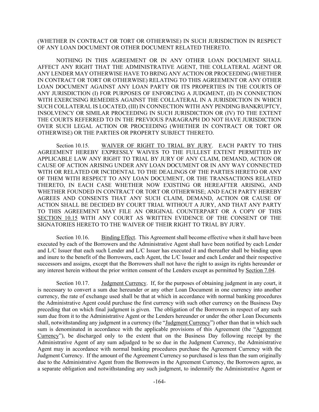 -164- (WHETHER IN CONTRACT OR TORT OR OTHERWISE) IN SUCH JURISDICTION IN RESPECT OF ANY LOAN DOCUMENT OR OTHER DOCUMENT RELATED THERETO. NOTHING IN THIS AGREEMENT OR IN ANY OTHER LOAN DOCUMENT SHALL AFFECT ANY RIGHT THAT THE ADMINISTRATIVE AGENT, THE COLLATERAL AGENT OR ANY LENDER MAY OTHERWISE HAVE TO BRING ANY ACTION OR PROCEEDING (WHETHER IN CONTRACT OR TORT OR OTHERWISE) RELATING TO THIS AGREEMENT OR ANY OTHER LOAN DOCUMENT AGAINST ANY LOAN PARTY OR ITS PROPERTIES IN THE COURTS OF ANY JURISDICTION (I) FOR PURPOSES OF ENFORCING A JUDGMENT, (II) IN CONNECTION WITH EXERCISING REMEDIES AGAINST THE COLLATERAL IN A JURISDICTION IN WHICH SUCH COLLATERAL IS LOCATED, (III) IN CONNECTION WITH ANY PENDING BANKRUPTCY, INSOLVENCY OR SIMILAR PROCEEDING IN SUCH JURISDICTION OR (IV) TO THE EXTENT THE COURTS REFERRED TO IN THE PREVIOUS PARAGRAPH DO NOT HAVE JURISDICTION OVER SUCH LEGAL ACTION OR PROCEEDING (WHETHER IN CONTRACT OR TORT OR OTHERWISE) OR THE PARTIES OR PROPERTY SUBJECT THERETO. Section 10.15. WAIVER OF RIGHT TO TRIAL BY JURY. EACH PARTY TO THIS AGREEMENT HEREBY EXPRESSLY WAIVES TO THE FULLEST EXTENT PERMITTED BY APPLICABLE LAW ANY RIGHT TO TRIAL BY JURY OF ANY CLAIM, DEMAND, ACTION OR CAUSE OF ACTION ARISING UNDER ANY LOAN DOCUMENT OR IN ANY WAY CONNECTED WITH OR RELATED OR INCIDENTAL TO THE DEALINGS OF THE PARTIES HERETO OR ANY OF THEM WITH RESPECT TO ANY LOAN DOCUMENT, OR THE TRANSACTIONS RELATED THERETO, IN EACH CASE WHETHER NOW EXISTING OR HEREAFTER ARISING, AND WHETHER FOUNDED IN CONTRACT OR TORT OR OTHERWISE; AND EACH PARTY HEREBY AGREES AND CONSENTS THAT ANY SUCH CLAIM, DEMAND, ACTION OR CAUSE OF ACTION SHALL BE DECIDED BY COURT TRIAL WITHOUT A JURY, AND THAT ANY PARTY TO THIS AGREEMENT MAY FILE AN ORIGINAL COUNTERPART OR A COPY OF THIS SECTION 10.15 WITH ANY COURT AS WRITTEN EVIDENCE OF THE CONSENT OF THE SIGNATORIES HERETO TO THE WAIVER OF THEIR RIGHT TO TRIAL BY JURY. Section 10.16. Binding Effect. This Agreement shall become effective when it shall have been executed by each of the Borrowers and the Administrative Agent shall have been notified by each Lender and L/C Issuer that each such Lender and L/C Issuer has executed it and thereafter shall be binding upon and inure to the benefit of the Borrowers, each Agent, the L/C Issuer and each Lender and their respective successors and assigns, except that the Borrowers shall not have the right to assign its rights hereunder or any interest herein without the prior written consent of the Lenders except as permitted by Section 7.04. Section 10.17. Judgment Currency. If, for the purposes of obtaining judgment in any court, it is necessary to convert a sum due hereunder or any other Loan Document in one currency into another currency, the rate of exchange used shall be that at which in accordance with normal banking procedures the Administrative Agent could purchase the first currency with such other currency on the Business Day preceding that on which final judgment is given. The obligation of the Borrowers in respect of any such sum due from it to the Administrative Agent or the Lenders hereunder or under the other Loan Documents shall, notwithstanding any judgment in a currency (the “Judgment Currency”) other than that in which such sum is denominated in accordance with the applicable provisions of this Agreement (the “Agreement Currency”), be discharged only to the extent that on the Business Day following receipt by the Administrative Agent of any sum adjudged to be so due in the Judgment Currency, the Administrative Agent may in accordance with normal banking procedures purchase the Agreement Currency with the Judgment Currency. If the amount of the Agreement Currency so purchased is less than the sum originally due to the Administrative Agent from the Borrowers in the Agreement Currency, the Borrowers agree, as a separate obligation and notwithstanding any such judgment, to indemnify the Administrative Agent or