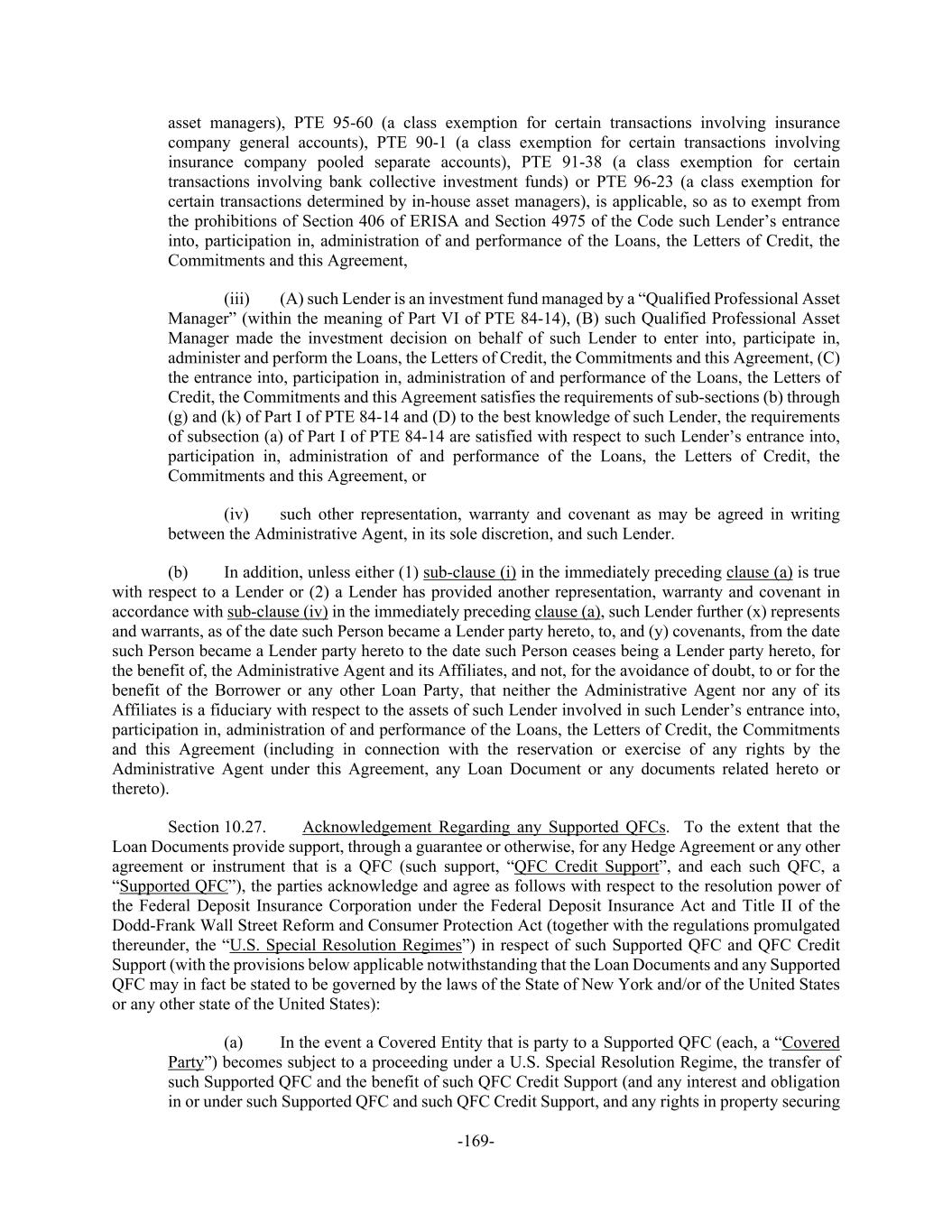 -169- asset managers), PTE 95-60 (a class exemption for certain transactions involving insurance company general accounts), PTE 90-1 (a class exemption for certain transactions involving insurance company pooled separate accounts), PTE 91-38 (a class exemption for certain transactions involving bank collective investment funds) or PTE 96-23 (a class exemption for certain transactions determined by in-house asset managers), is applicable, so as to exempt from the prohibitions of Section 406 of ERISA and Section 4975 of the Code such Lender’s entrance into, participation in, administration of and performance of the Loans, the Letters of Credit, the Commitments and this Agreement, (iii) (A) such Lender is an investment fund managed by a “Qualified Professional Asset Manager” (within the meaning of Part VI of PTE 84-14), (B) such Qualified Professional Asset Manager made the investment decision on behalf of such Lender to enter into, participate in, administer and perform the Loans, the Letters of Credit, the Commitments and this Agreement, (C) the entrance into, participation in, administration of and performance of the Loans, the Letters of Credit, the Commitments and this Agreement satisfies the requirements of sub-sections (b) through (g) and (k) of Part I of PTE 84-14 and (D) to the best knowledge of such Lender, the requirements of subsection (a) of Part I of PTE 84-14 are satisfied with respect to such Lender’s entrance into, participation in, administration of and performance of the Loans, the Letters of Credit, the Commitments and this Agreement, or (iv) such other representation, warranty and covenant as may be agreed in writing between the Administrative Agent, in its sole discretion, and such Lender. (b) In addition, unless either (1) sub-clause (i) in the immediately preceding clause (a) is true with respect to a Lender or (2) a Lender has provided another representation, warranty and covenant in accordance with sub-clause (iv) in the immediately preceding clause (a), such Lender further (x) represents and warrants, as of the date such Person became a Lender party hereto, to, and (y) covenants, from the date such Person became a Lender party hereto to the date such Person ceases being a Lender party hereto, for the benefit of, the Administrative Agent and its Affiliates, and not, for the avoidance of doubt, to or for the benefit of the Borrower or any other Loan Party, that neither the Administrative Agent nor any of its Affiliates is a fiduciary with respect to the assets of such Lender involved in such Lender’s entrance into, participation in, administration of and performance of the Loans, the Letters of Credit, the Commitments and this Agreement (including in connection with the reservation or exercise of any rights by the Administrative Agent under this Agreement, any Loan Document or any documents related hereto or thereto). Section 10.27. Acknowledgement Regarding any Supported QFCs. To the extent that the Loan Documents provide support, through a guarantee or otherwise, for any Hedge Agreement or any other agreement or instrument that is a QFC (such support, “QFC Credit Support”, and each such QFC, a “Supported QFC”), the parties acknowledge and agree as follows with respect to the resolution power of the Federal Deposit Insurance Corporation under the Federal Deposit Insurance Act and Title II of the Dodd-Frank Wall Street Reform and Consumer Protection Act (together with the regulations promulgated thereunder, the “U.S. Special Resolution Regimes”) in respect of such Supported QFC and QFC Credit Support (with the provisions below applicable notwithstanding that the Loan Documents and any Supported QFC may in fact be stated to be governed by the laws of the State of New York and/or of the United States or any other state of the United States): (a) In the event a Covered Entity that is party to a Supported QFC (each, a “Covered Party”) becomes subject to a proceeding under a U.S. Special Resolution Regime, the transfer of such Supported QFC and the benefit of such QFC Credit Support (and any interest and obligation in or under such Supported QFC and such QFC Credit Support, and any rights in property securing