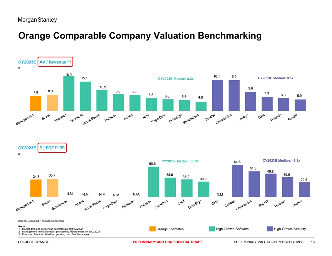 (1) Illustrative Valuation Matrix $MM other than per share data Street Case Management Case Premium / (Discount) To AV / Revenue P / FCF AV / ARR AV / Revenue P / FCF AV / ARR Fully Diluted Agg. Value Price Current 30-Day Avg. 52 Wk. High Equity Val. (AV) CY2022E CY2023E CY2022E CY2023E Dec-22 CY2022E CY2023E CY2022E CY2023E Dec-22 Metric $20.21 $17.25 $27.40 $3,744 $3,428 $334 $415 $82 $105 $377 $336 $440 $92 $107 $378 Growth Rate / Margin 35% 25% 25% 25% 32% 36% 31% 28% 24% 33% $20.21 0.0% 17.2% (26.2%) $3,744 $3,428 10.3x 8.3x 45.5x 35.7x 9.1x 10.2x 7.8x 40.5x 34.8x 9.1x $20.00 (1.0%) 15.9% (27.0%) $3,704 $3,389 10.2x 8.2x 45.1x 35.4x 9.0x 10.1x 7.7x 40.1x 34.5x 9.0x $21.00 3.9% 21.7% (23.4%) $3,891 $3,575 10.7x 8.6x 47.3x 37.1x 9.5x 10.7x 8.1x 42.1x 36.2x 9.4x $22.00 8.9% 27.5% (19.7%) $4,077 $3,762 11.3x 9.1x 49.6x 38.9x 10.0x 11.2x 8.5x 44.1x 37.9x 9.9x $23.00 13.8% 33.3% (16.1%) $4,264 $3,948 11.8x 9.5x 51.9x 40.7x 10.5x 11.8x 9.0x 46.2x 39.7x 10.4x $24.00 18.8% 39.1% (12.4%) $4,451 $4,135 12.4x 10.0x 54.2x 42.5x 11.0x 12.3x 9.4x 48.2x 41.4x 10.9x $25.00 23.7% 44.9% (8.8%) $4,637 $4,322 13.0x 10.4x 56.4x 44.3x 11.5x 12.9x 9.8x 50.2x 43.2x 11.4x $26.00 28.6% 50.7% (5.1%) $4,824 $4,508 13.5x 10.9x 58.7x 46.0x 12.0x 13.4x 10.2x 52.2x 44.9x 11.9x $27.00 33.6% 56.5% (1.5%) $5,010 $4,695 14.1x 11.3x 61.0x 47.8x 12.5x 14.0x 10.7x 54.2x 46.6x 12.4x $28.00 38.5% 62.3% 2.2% $5,197 $4,881 14.6x 11.8x 63.2x 49.6x 13.0x 14.5x 11.1x 56.3x 48.4x 12.9x (4) $29.00 43.5% 68.1% 5.8% $5,383 $5,068 15.2x 12.2x 65.5x 51.4x 13.5x 15.1x 11.5x 58.3x 50.1x 13.4x $30.00 48.4% 73.9% 9.5% $5,570 $5,254 15.8x 12.7x 67.8x 53.2x 14.0x 15.7x 11.9x 60.3x 51.8x 13.9x $31.00 53.4% 79.7% 13.1% $5,756 $5,441 16.3x 13.1x 70.0x 54.9x 14.5x 16.2x 12.4x 62.3x 53.6x 14.4x $32.00 58.3% 85.5% 16.8% $5,943 $5,627 16.9x 13.5x 72.3x 56.7x 14.9x 16.8x 12.8x 64.3x 55.3x 14.9x (4) Source: CapIQ, Thomson Consensus Notes: 1. Market data and consensus estimates as of 8/12/2022 PROJECT ORANGE PRELIMINARY AND CONFIDENTIAL DRAFT PRELIMINARY VALUATION PERSPECTIVES 17