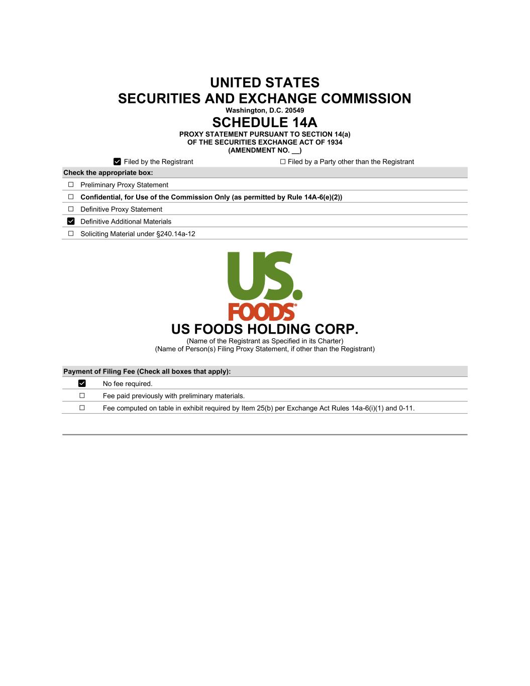 UNITED STATES SECURITIES AND EXCHANGE COMMISSION Washington, D.C. 20549 SCHEDULE 14A PROXY STATEMENT PURSUANT TO SECTION 14(a) OF THE SECURITIES EXCHANGE ACT OF 1934 (AMENDMENT NO. __) ☑ Filed by the Registrant ☐ Filed by a Party other than the Registrant Check the appropriate box: ☐ Preliminary Proxy Statement ☐ Confidential, for Use of the Commission Only (as permitted by Rule 14A-6(e)(2)) ☐ Definitive Proxy Statement ☑ Definitive Additional Materials ☐ Soliciting Material under §240.14a-12 US FOODS HOLDING CORP. (Name of the Registrant as Specified in its Charter) (Name of Person(s) Filing Proxy Statement, if other than the Registrant) Payment of Filing Fee (Check all boxes that apply): ☑ No fee required. ☐ Fee paid previously with preliminary materials. ☐ Fee computed on table in exhibit required by Item 25(b) per Exchange Act Rules 14a-6(i)(1) and 0-11.