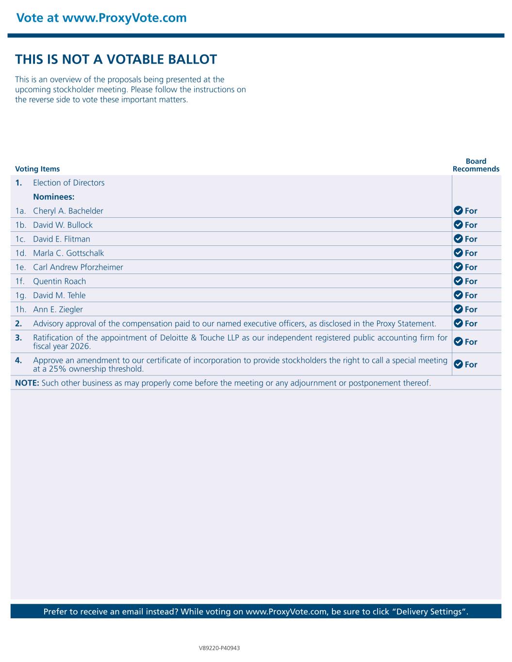 Vote at www.ProxyVote.com Prefer to receive an email instead? While voting on www.ProxyVote.com, be sure to click “Delivery Settings”. Voting Items Board Recommends V89220-P40943 THIS IS NOT A VOTABLE BALLOT This is an overview of the proposals being presented at the upcoming stockholder meeting. Please follow the instructions on the reverse side to vote these important matters. 1. Election of Directors Nominees: 1a. Cheryl A. Bachelder For 1b. David W. Bullock For 1c. David E. Flitman For 1d. Marla C. Gottschalk For 1e. Carl Andrew Pforzheimer For 1f. Quentin Roach For 1g. David M. Tehle For 1h. Ann E. Ziegler For 2. Advisory approval of the compensation paid to our named executive officers, as disclosed in the Proxy Statement. For 3. Ratification of the appointment of Deloitte & Touche LLP as our independent registered public accounting firm for fiscal year 2026. For 4. Approve an amendment to our certificate of incorporation to provide stockholders the right to call a special meeting at a 25% ownership threshold. For NOTE: Such other business as may properly come before the meeting or any adjournment or postponement thereof.