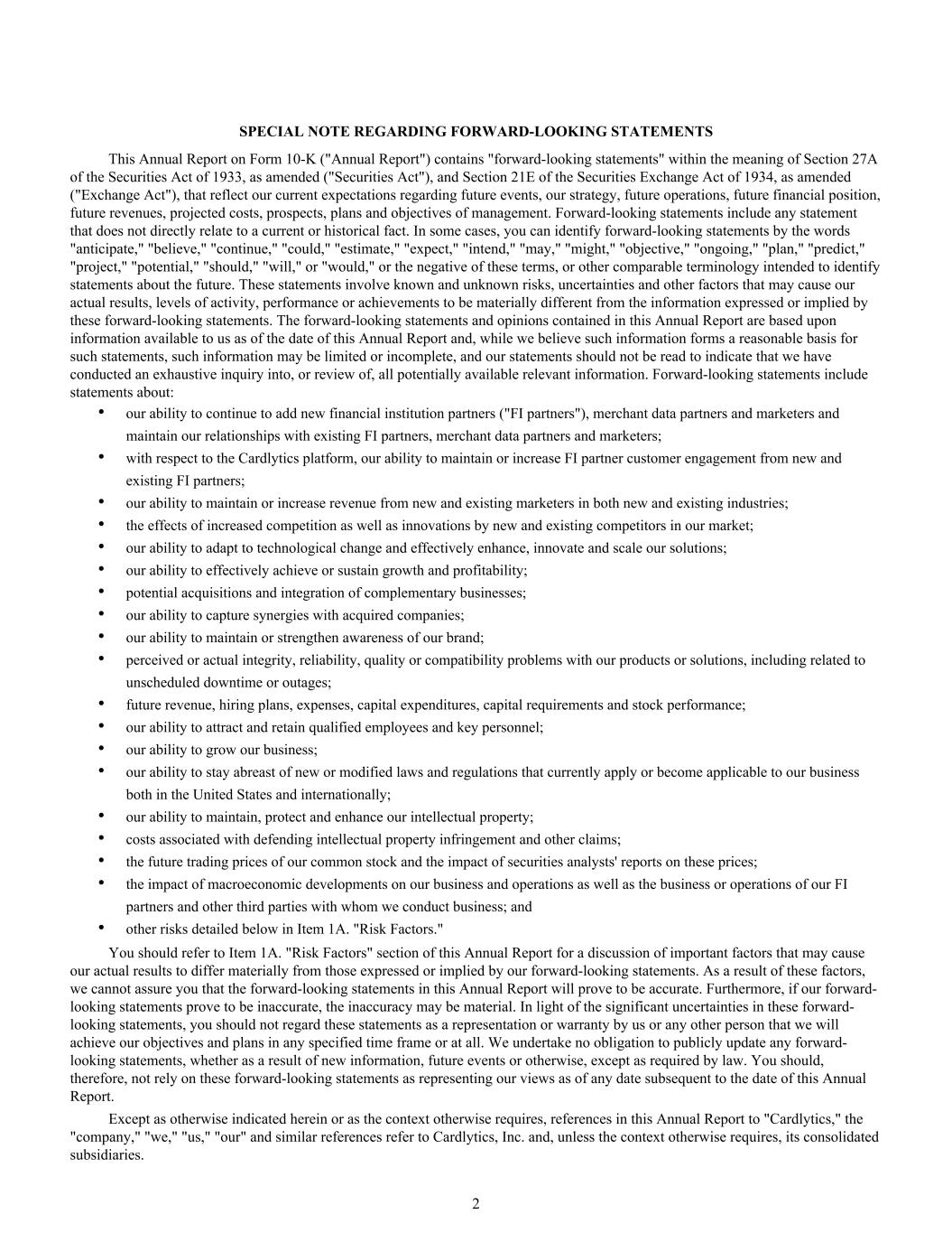 SPECIAL NOTE REGARDING FORWARD-LOOKING STATEMENTS This Annual Report on Form 10-K ("Annual Report") contains "forward-looking statements" within the meaning of Section 27A of the Securities Act of 1933, as amended ("Securities Act"), and Section 21E of the Securities Exchange Act of 1934, as amended ("Exchange Act"), that reflect our current expectations regarding future events, our strategy, future operations, future financial position, future revenues, projected costs, prospects, plans and objectives of management. Forward-looking statements include any statement that does not directly relate to a current or historical fact. In some cases, you can identify forward-looking statements by the words "anticipate," "believe," "continue," "could," "estimate," "expect," "intend," "may," "might," "objective," "ongoing," "plan," "predict," "project," "potential," "should," "will," or "would," or the negative of these terms, or other comparable terminology intended to identify statements about the future. These statements involve known and unknown risks, uncertainties and other factors that may cause our actual results, levels of activity, performance or achievements to be materially different from the information expressed or implied by these forward-looking statements. The forward-looking statements and opinions contained in this Annual Report are based upon information available to us as of the date of this Annual Report and, while we believe such information forms a reasonable basis for such statements, such information may be limited or incomplete, and our statements should not be read to indicate that we have conducted an exhaustive inquiry into, or review of, all potentially available relevant information. Forward-looking statements include statements about: • our ability to continue to add new financial institution partners ("FI partners"), merchant data partners and marketers and maintain our relationships with existing FI partners, merchant data partners and marketers; • with respect to the Cardlytics platform, our ability to maintain or increase FI partner customer engagement from new and existing FI partners; • our ability to maintain or increase revenue from new and existing marketers in both new and existing industries; • the effects of increased competition as well as innovations by new and existing competitors in our market; • our ability to adapt to technological change and effectively enhance, innovate and scale our solutions; • our ability to effectively achieve or sustain growth and profitability; • potential acquisitions and integration of complementary businesses; • our ability to capture synergies with acquired companies; • our ability to maintain or strengthen awareness of our brand; • perceived or actual integrity, reliability, quality or compatibility problems with our products or solutions, including related to unscheduled downtime or outages; • future revenue, hiring plans, expenses, capital expenditures, capital requirements and stock performance; • our ability to attract and retain qualified employees and key personnel; • our ability to grow our business; • our ability to stay abreast of new or modified laws and regulations that currently apply or become applicable to our business both in the United States and internationally; • our ability to maintain, protect and enhance our intellectual property; • costs associated with defending intellectual property infringement and other claims; • the future trading prices of our common stock and the impact of securities analysts' reports on these prices; • the impact of macroeconomic developments on our business and operations as well as the business or operations of our FI partners and other third parties with whom we conduct business; and • other risks detailed below in Item 1A. "Risk Factors." You should refer to Item 1A. "Risk Factors" section of this Annual Report for a discussion of important factors that may cause our actual results to differ materially from those expressed or implied by our forward-looking statements. As a result of these factors, we cannot assure you that the forward-looking statements in this Annual Report will prove to be accurate. Furthermore, if our forward- looking statements prove to be inaccurate, the inaccuracy may be material. In light of the significant uncertainties in these forward- looking statements, you should not regard these statements as a representation or warranty by us or any other person that we will achieve our objectives and plans in any specified time frame or at all. We undertake no obligation to publicly update any forward- looking statements, whether as a result of new information, future events or otherwise, except as required by law. You should, therefore, not rely on these forward-looking statements as representing our views as of any date subsequent to the date of this Annual Report. Except as otherwise indicated herein or as the context otherwise requires, references in this Annual Report to "Cardlytics," the "company," "we," "us," "our" and similar references refer to Cardlytics, Inc. and, unless the context otherwise requires, its consolidated subsidiaries. 2
