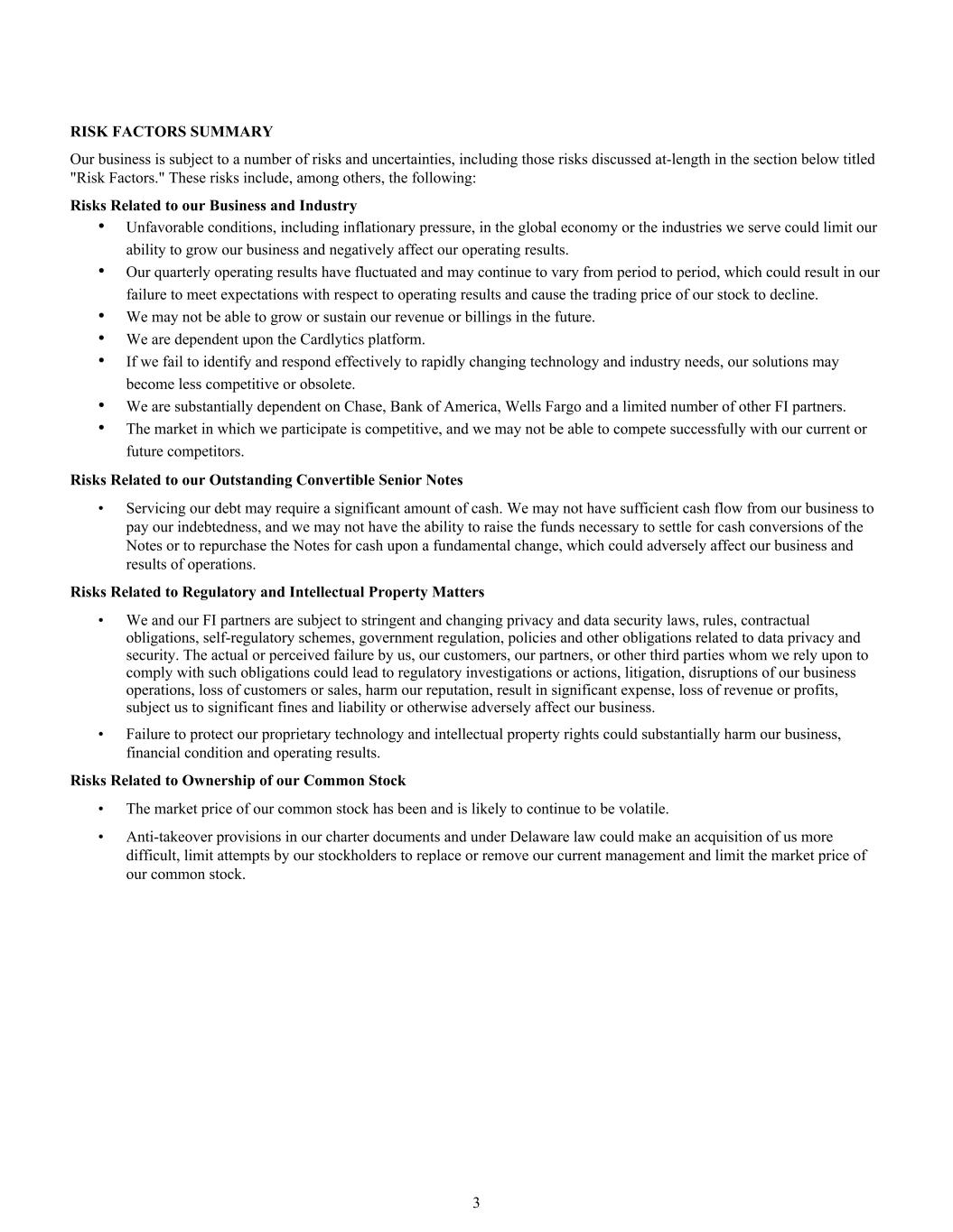 RISK FACTORS SUMMARY Our business is subject to a number of risks and uncertainties, including those risks discussed at-length in the section below titled "Risk Factors." These risks include, among others, the following: Risks Related to our Business and Industry • Unfavorable conditions, including inflationary pressure, in the global economy or the industries we serve could limit our ability to grow our business and negatively affect our operating results. • Our quarterly operating results have fluctuated and may continue to vary from period to period, which could result in our failure to meet expectations with respect to operating results and cause the trading price of our stock to decline. • We may not be able to grow or sustain our revenue or billings in the future. • We are dependent upon the Cardlytics platform. • If we fail to identify and respond effectively to rapidly changing technology and industry needs, our solutions may become less competitive or obsolete. • We are substantially dependent on Chase, Bank of America, Wells Fargo and a limited number of other FI partners. • The market in which we participate is competitive, and we may not be able to compete successfully with our current or future competitors. Risks Related to our Outstanding Convertible Senior Notes • Servicing our debt may require a significant amount of cash. We may not have sufficient cash flow from our business to pay our indebtedness, and we may not have the ability to raise the funds necessary to settle for cash conversions of the Notes or to repurchase the Notes for cash upon a fundamental change, which could adversely affect our business and results of operations. Risks Related to Regulatory and Intellectual Property Matters • We and our FI partners are subject to stringent and changing privacy and data security laws, rules, contractual obligations, self-regulatory schemes, government regulation, policies and other obligations related to data privacy and security. The actual or perceived failure by us, our customers, our partners, or other third parties whom we rely upon to comply with such obligations could lead to regulatory investigations or actions, litigation, disruptions of our business operations, loss of customers or sales, harm our reputation, result in significant expense, loss of revenue or profits, subject us to significant fines and liability or otherwise adversely affect our business. • Failure to protect our proprietary technology and intellectual property rights could substantially harm our business, financial condition and operating results. Risks Related to Ownership of our Common Stock • The market price of our common stock has been and is likely to continue to be volatile. • Anti-takeover provisions in our charter documents and under Delaware law could make an acquisition of us more difficult, limit attempts by our stockholders to replace or remove our current management and limit the market price of our common stock. 3