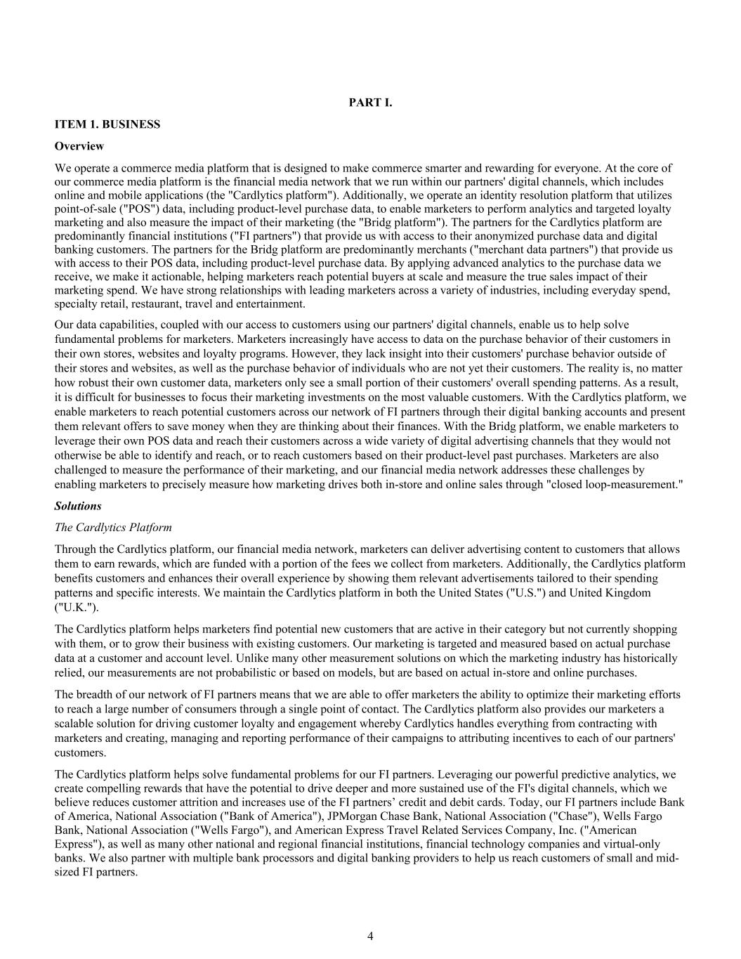 PART I. ITEM 1. BUSINESS Overview We operate a commerce media platform that is designed to make commerce smarter and rewarding for everyone. At the core of our commerce media platform is the financial media network that we run within our partners' digital channels, which includes online and mobile applications (the "Cardlytics platform"). Additionally, we operate an identity resolution platform that utilizes point-of-sale ("POS") data, including product-level purchase data, to enable marketers to perform analytics and targeted loyalty marketing and also measure the impact of their marketing (the "Bridg platform"). The partners for the Cardlytics platform are predominantly financial institutions ("FI partners") that provide us with access to their anonymized purchase data and digital banking customers. The partners for the Bridg platform are predominantly merchants ("merchant data partners") that provide us with access to their POS data, including product-level purchase data. By applying advanced analytics to the purchase data we receive, we make it actionable, helping marketers reach potential buyers at scale and measure the true sales impact of their marketing spend. We have strong relationships with leading marketers across a variety of industries, including everyday spend, specialty retail, restaurant, travel and entertainment. Our data capabilities, coupled with our access to customers using our partners' digital channels, enable us to help solve fundamental problems for marketers. Marketers increasingly have access to data on the purchase behavior of their customers in their own stores, websites and loyalty programs. However, they lack insight into their customers' purchase behavior outside of their stores and websites, as well as the purchase behavior of individuals who are not yet their customers. The reality is, no matter how robust their own customer data, marketers only see a small portion of their customers' overall spending patterns. As a result, it is difficult for businesses to focus their marketing investments on the most valuable customers. With the Cardlytics platform, we enable marketers to reach potential customers across our network of FI partners through their digital banking accounts and present them relevant offers to save money when they are thinking about their finances. With the Bridg platform, we enable marketers to leverage their own POS data and reach their customers across a wide variety of digital advertising channels that they would not otherwise be able to identify and reach, or to reach customers based on their product-level past purchases. Marketers are also challenged to measure the performance of their marketing, and our financial media network addresses these challenges by enabling marketers to precisely measure how marketing drives both in-store and online sales through "closed loop-measurement." Solutions The Cardlytics Platform Through the Cardlytics platform, our financial media network, marketers can deliver advertising content to customers that allows them to earn rewards, which are funded with a portion of the fees we collect from marketers. Additionally, the Cardlytics platform benefits customers and enhances their overall experience by showing them relevant advertisements tailored to their spending patterns and specific interests. We maintain the Cardlytics platform in both the United States ("U.S.") and United Kingdom ("U.K."). The Cardlytics platform helps marketers find potential new customers that are active in their category but not currently shopping with them, or to grow their business with existing customers. Our marketing is targeted and measured based on actual purchase data at a customer and account level. Unlike many other measurement solutions on which the marketing industry has historically relied, our measurements are not probabilistic or based on models, but are based on actual in-store and online purchases. The breadth of our network of FI partners means that we are able to offer marketers the ability to optimize their marketing efforts to reach a large number of consumers through a single point of contact. The Cardlytics platform also provides our marketers a scalable solution for driving customer loyalty and engagement whereby Cardlytics handles everything from contracting with marketers and creating, managing and reporting performance of their campaigns to attributing incentives to each of our partners' customers. The Cardlytics platform helps solve fundamental problems for our FI partners. Leveraging our powerful predictive analytics, we create compelling rewards that have the potential to drive deeper and more sustained use of the FI's digital channels, which we believe reduces customer attrition and increases use of the FI partners’ credit and debit cards. Today, our FI partners include Bank of America, National Association ("Bank of America"), JPMorgan Chase Bank, National Association ("Chase"), Wells Fargo Bank, National Association ("Wells Fargo"), and American Express Travel Related Services Company, Inc. ("American Express"), as well as many other national and regional financial institutions, financial technology companies and virtual-only banks. We also partner with multiple bank processors and digital banking providers to help us reach customers of small and mid- sized FI partners. 4