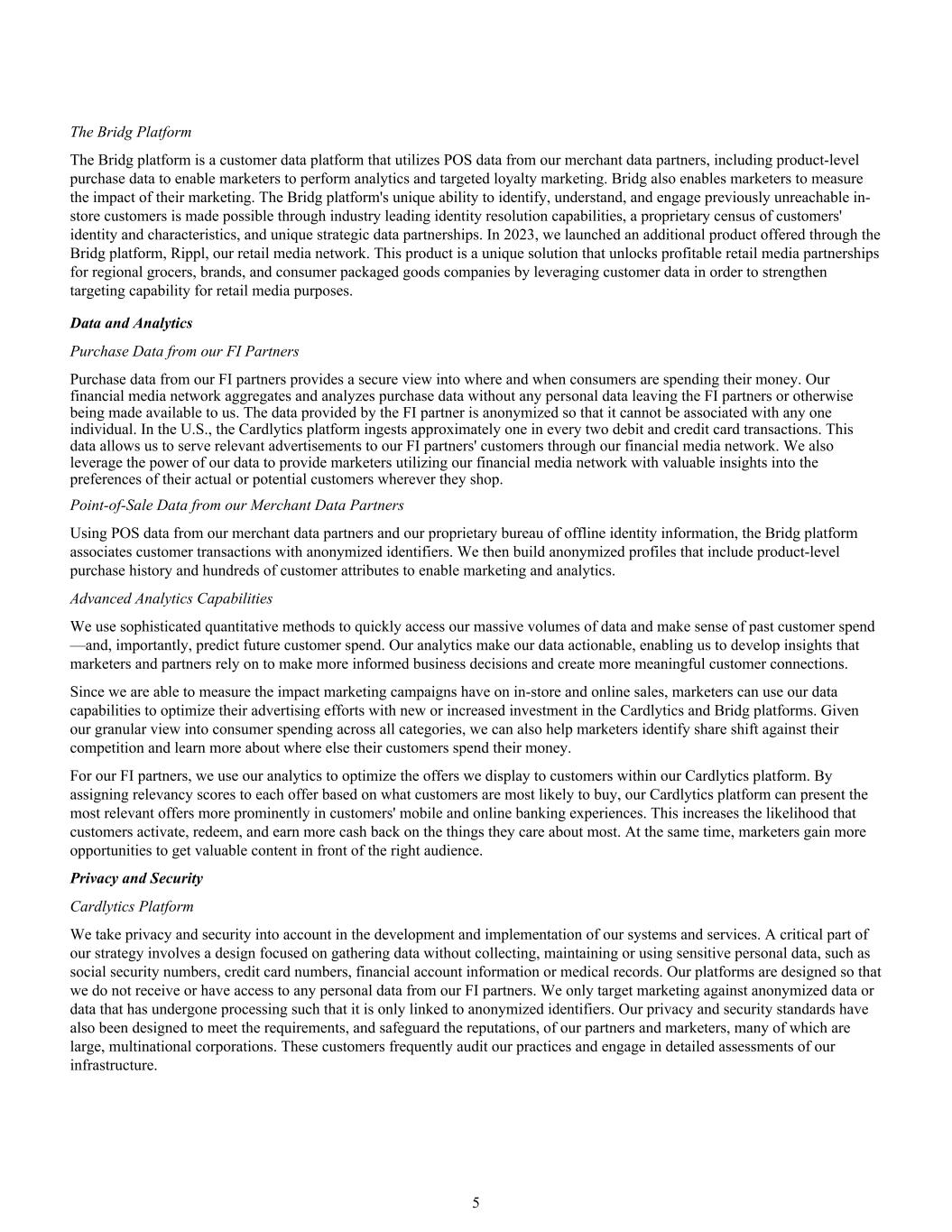 The Bridg Platform The Bridg platform is a customer data platform that utilizes POS data from our merchant data partners, including product-level purchase data to enable marketers to perform analytics and targeted loyalty marketing. Bridg also enables marketers to measure the impact of their marketing. The Bridg platform's unique ability to identify, understand, and engage previously unreachable in- store customers is made possible through industry leading identity resolution capabilities, a proprietary census of customers' identity and characteristics, and unique strategic data partnerships. In 2023, we launched an additional product offered through the Bridg platform, Rippl, our retail media network. This product is a unique solution that unlocks profitable retail media partnerships for regional grocers, brands, and consumer packaged goods companies by leveraging customer data in order to strengthen targeting capability for retail media purposes. Data and Analytics Purchase Data from our FI Partners Purchase data from our FI partners provides a secure view into where and when consumers are spending their money. Our financial media network aggregates and analyzes purchase data without any personal data leaving the FI partners or otherwise being made available to us. The data provided by the FI partner is anonymized so that it cannot be associated with any one individual. In the U.S., the Cardlytics platform ingests approximately one in every two debit and credit card transactions. This data allows us to serve relevant advertisements to our FI partners' customers through our financial media network. We also leverage the power of our data to provide marketers utilizing our financial media network with valuable insights into the preferences of their actual or potential customers wherever they shop. Point-of-Sale Data from our Merchant Data Partners Using POS data from our merchant data partners and our proprietary bureau of offline identity information, the Bridg platform associates customer transactions with anonymized identifiers. We then build anonymized profiles that include product-level purchase history and hundreds of customer attributes to enable marketing and analytics. Advanced Analytics Capabilities We use sophisticated quantitative methods to quickly access our massive volumes of data and make sense of past customer spend —and, importantly, predict future customer spend. Our analytics make our data actionable, enabling us to develop insights that marketers and partners rely on to make more informed business decisions and create more meaningful customer connections. Since we are able to measure the impact marketing campaigns have on in-store and online sales, marketers can use our data capabilities to optimize their advertising efforts with new or increased investment in the Cardlytics and Bridg platforms. Given our granular view into consumer spending across all categories, we can also help marketers identify share shift against their competition and learn more about where else their customers spend their money. For our FI partners, we use our analytics to optimize the offers we display to customers within our Cardlytics platform. By assigning relevancy scores to each offer based on what customers are most likely to buy, our Cardlytics platform can present the most relevant offers more prominently in customers' mobile and online banking experiences. This increases the likelihood that customers activate, redeem, and earn more cash back on the things they care about most. At the same time, marketers gain more opportunities to get valuable content in front of the right audience. Privacy and Security Cardlytics Platform We take privacy and security into account in the development and implementation of our systems and services. A critical part of our strategy involves a design focused on gathering data without collecting, maintaining or using sensitive personal data, such as social security numbers, credit card numbers, financial account information or medical records. Our platforms are designed so that we do not receive or have access to any personal data from our FI partners. We only target marketing against anonymized data or data that has undergone processing such that it is only linked to anonymized identifiers. Our privacy and security standards have also been designed to meet the requirements, and safeguard the reputations, of our partners and marketers, many of which are large, multinational corporations. These customers frequently audit our practices and engage in detailed assessments of our infrastructure. 5