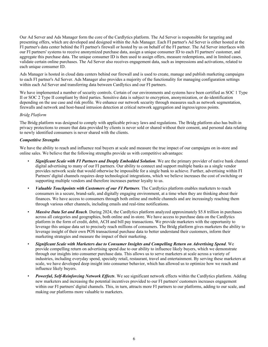 Our Ad Server and Ads Manager form the core of the Cardlytics platform. The Ad Server is responsible for targeting and presenting offers, which are developed and designed within the Ads Manager. Each FI partner's Ad Server is either hosted at the FI partner's data center behind the FI partner's firewall or hosted by us on behalf of the FI partner. The Ad Server interfaces with our FI partners' systems to receive anonymized purchase data, assign a unique consumer ID to each FI partners' customer, and aggregate this purchase data. The unique consumer ID is then used to assign offers, measure redemptions, and in limited cases, validate certain online purchases. The Ad Server also receives engagement data, such as impressions and activations, related to each unique consumer ID. Ads Manager is hosted in cloud data centers behind our firewall and is used to create, manage and publish marketing campaigns to each FI partner's Ad Server. Ads Manager also provides a majority of the functionality for managing configuration settings within each Ad Server and transferring data between Cardlytics and our FI partners. We have implemented a number of security controls. Certain of our environments and systems have been certified as SOC 1 Type II or SOC 2 Type II compliant by third parties. Sensitive data is subject to encryption, anonymization, or de-identification depending on the use case and risk profile. We enhance our network security through measures such as network segmentation, firewalls and network and host-based intrusion detection at critical network aggregation and ingress/egress points. Bridg Platform The Bridg platform was designed to comply with applicable privacy laws and regulations. The Bridg platform also has built-in privacy protections to ensure that data provided by clients is never sold or shared without their consent, and personal data relating to newly identified consumers is never shared with the clients. Competitive Strengths We have the ability to reach and influence real buyers at scale and measure the true impact of our campaigns on in-store and online sales. We believe that the following strengths provide us with competitive advantages: • Significant Scale with FI Partners and Deeply Embedded Solution. We are the primary provider of native bank channel digital advertising to many of our FI partners. Our ability to connect and support multiple banks as a single vendor provides network scale that would otherwise be impossible for a single bank to achieve. Further, advertising within FI Partners' digital channels requires deep technological integrations, which we believe increases the cost of switching or supporting multiple vendors and therefore increases partner loyalty to us. • Valuable Touchpoints with Customers of our FI Partners. The Cardlytics platform enables marketers to reach consumers in a secure, brand-safe, and digitally engaging environment, at a time when they are thinking about their finances. We have access to consumers through both online and mobile channels and are increasingly reaching them through various other channels, including emails and real-time notifications. • Massive Data Set and Reach. During 2024, the Cardlytics platform analyzed approximately $5.8 trillion in purchases across all categories and geographies, both online and in-store. We have access to purchase data on the Cardlytics platform in the form of credit, debit, ACH and bill pay transactions. We provide marketers with the opportunity to leverage this unique data set to precisely reach millions of consumers. The Bridg platform gives marketers the ability to leverage insight of their own POS transactional purchase data to better understand their customers, inform their marketing strategies and measure the impact of their marketing. • Significant Scale with Marketers due to Consumer Insights and Compelling Return on Advertising Spend. We provide compelling return on advertising spend due to our ability to influence likely buyers, which we demonstrate through our insights into consumer purchase data. This allows us to serve marketers at scale across a variety of industries, including everyday spend, specialty retail, restaurant, travel and entertainment. By serving these marketers at scale, we have developed deep insight into consumer behavior, which has allowed us to optimize how we reach and influence likely buyers. • Powerful, Self-Reinforcing Network Effects. We see significant network effects within the Cardlytics platform. Adding new marketers and increasing the potential incentives provided to our FI partners' customers increases engagement within our FI partners' digital channels. This, in turn, attracts more FI partners to our platforms, adding to our scale, and making our platforms more valuable to marketers. 6