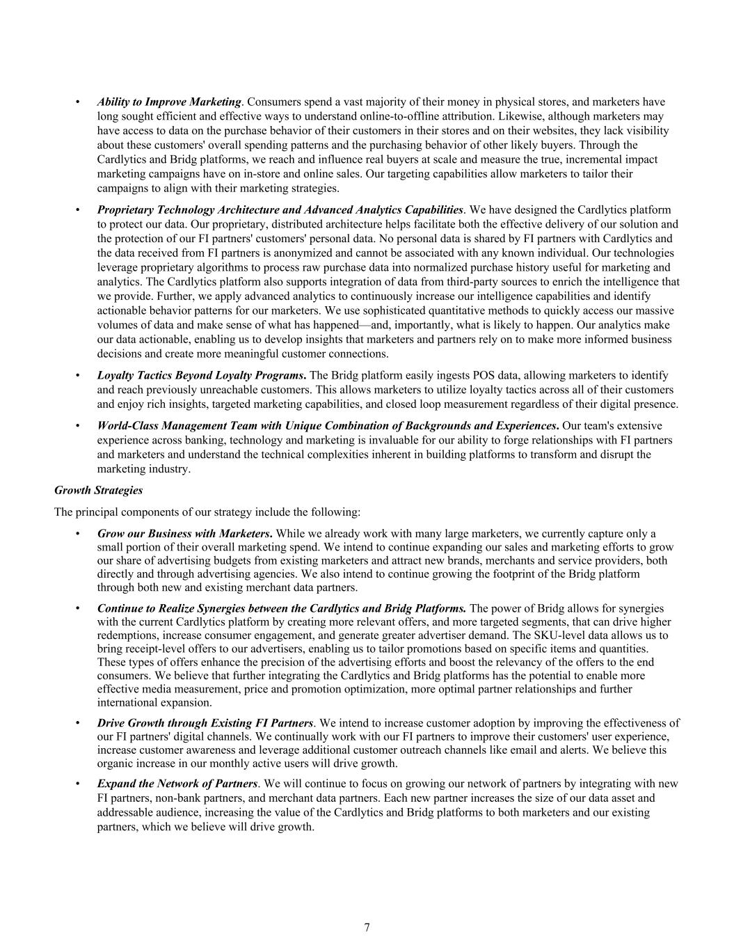 • Ability to Improve Marketing. Consumers spend a vast majority of their money in physical stores, and marketers have long sought efficient and effective ways to understand online-to-offline attribution. Likewise, although marketers may have access to data on the purchase behavior of their customers in their stores and on their websites, they lack visibility about these customers' overall spending patterns and the purchasing behavior of other likely buyers. Through the Cardlytics and Bridg platforms, we reach and influence real buyers at scale and measure the true, incremental impact marketing campaigns have on in-store and online sales. Our targeting capabilities allow marketers to tailor their campaigns to align with their marketing strategies. • Proprietary Technology Architecture and Advanced Analytics Capabilities. We have designed the Cardlytics platform to protect our data. Our proprietary, distributed architecture helps facilitate both the effective delivery of our solution and the protection of our FI partners' customers' personal data. No personal data is shared by FI partners with Cardlytics and the data received from FI partners is anonymized and cannot be associated with any known individual. Our technologies leverage proprietary algorithms to process raw purchase data into normalized purchase history useful for marketing and analytics. The Cardlytics platform also supports integration of data from third-party sources to enrich the intelligence that we provide. Further, we apply advanced analytics to continuously increase our intelligence capabilities and identify actionable behavior patterns for our marketers. We use sophisticated quantitative methods to quickly access our massive volumes of data and make sense of what has happened—and, importantly, what is likely to happen. Our analytics make our data actionable, enabling us to develop insights that marketers and partners rely on to make more informed business decisions and create more meaningful customer connections. • Loyalty Tactics Beyond Loyalty Programs. The Bridg platform easily ingests POS data, allowing marketers to identify and reach previously unreachable customers. This allows marketers to utilize loyalty tactics across all of their customers and enjoy rich insights, targeted marketing capabilities, and closed loop measurement regardless of their digital presence. • World-Class Management Team with Unique Combination of Backgrounds and Experiences. Our team's extensive experience across banking, technology and marketing is invaluable for our ability to forge relationships with FI partners and marketers and understand the technical complexities inherent in building platforms to transform and disrupt the marketing industry. Growth Strategies The principal components of our strategy include the following: • Grow our Business with Marketers. While we already work with many large marketers, we currently capture only a small portion of their overall marketing spend. We intend to continue expanding our sales and marketing efforts to grow our share of advertising budgets from existing marketers and attract new brands, merchants and service providers, both directly and through advertising agencies. We also intend to continue growing the footprint of the Bridg platform through both new and existing merchant data partners. • Continue to Realize Synergies between the Cardlytics and Bridg Platforms. The power of Bridg allows for synergies with the current Cardlytics platform by creating more relevant offers, and more targeted segments, that can drive higher redemptions, increase consumer engagement, and generate greater advertiser demand. The SKU-level data allows us to bring receipt-level offers to our advertisers, enabling us to tailor promotions based on specific items and quantities. These types of offers enhance the precision of the advertising efforts and boost the relevancy of the offers to the end consumers. We believe that further integrating the Cardlytics and Bridg platforms has the potential to enable more effective media measurement, price and promotion optimization, more optimal partner relationships and further international expansion. • Drive Growth through Existing FI Partners. We intend to increase customer adoption by improving the effectiveness of our FI partners' digital channels. We continually work with our FI partners to improve their customers' user experience, increase customer awareness and leverage additional customer outreach channels like email and alerts. We believe this organic increase in our monthly active users will drive growth. • Expand the Network of Partners. We will continue to focus on growing our network of partners by integrating with new FI partners, non-bank partners, and merchant data partners. Each new partner increases the size of our data asset and addressable audience, increasing the value of the Cardlytics and Bridg platforms to both marketers and our existing partners, which we believe will drive growth. 7