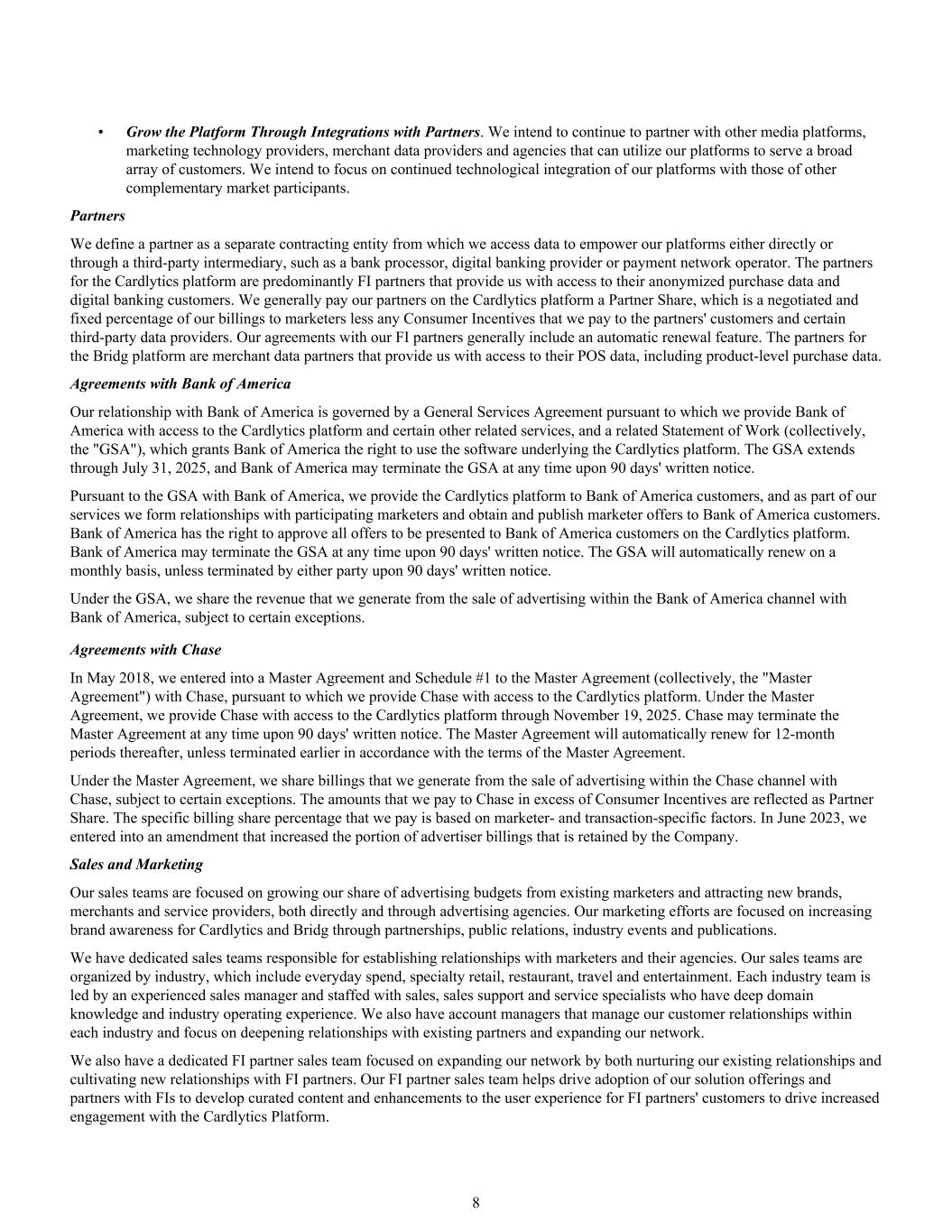 • Grow the Platform Through Integrations with Partners. We intend to continue to partner with other media platforms, marketing technology providers, merchant data providers and agencies that can utilize our platforms to serve a broad array of customers. We intend to focus on continued technological integration of our platforms with those of other complementary market participants. Partners We define a partner as a separate contracting entity from which we access data to empower our platforms either directly or through a third-party intermediary, such as a bank processor, digital banking provider or payment network operator. The partners for the Cardlytics platform are predominantly FI partners that provide us with access to their anonymized purchase data and digital banking customers. We generally pay our partners on the Cardlytics platform a Partner Share, which is a negotiated and fixed percentage of our billings to marketers less any Consumer Incentives that we pay to the partners' customers and certain third-party data providers. Our agreements with our FI partners generally include an automatic renewal feature. The partners for the Bridg platform are merchant data partners that provide us with access to their POS data, including product-level purchase data. Agreements with Bank of America Our relationship with Bank of America is governed by a General Services Agreement pursuant to which we provide Bank of America with access to the Cardlytics platform and certain other related services, and a related Statement of Work (collectively, the "GSA"), which grants Bank of America the right to use the software underlying the Cardlytics platform. The GSA extends through July 31, 2025, and Bank of America may terminate the GSA at any time upon 90 days' written notice. Pursuant to the GSA with Bank of America, we provide the Cardlytics platform to Bank of America customers, and as part of our services we form relationships with participating marketers and obtain and publish marketer offers to Bank of America customers. Bank of America has the right to approve all offers to be presented to Bank of America customers on the Cardlytics platform. Bank of America may terminate the GSA at any time upon 90 days' written notice. The GSA will automatically renew on a monthly basis, unless terminated by either party upon 90 days' written notice. Under the GSA, we share the revenue that we generate from the sale of advertising within the Bank of America channel with Bank of America, subject to certain exceptions. Agreements with Chase In May 2018, we entered into a Master Agreement and Schedule #1 to the Master Agreement (collectively, the "Master Agreement") with Chase, pursuant to which we provide Chase with access to the Cardlytics platform. Under the Master Agreement, we provide Chase with access to the Cardlytics platform through November 19, 2025. Chase may terminate the Master Agreement at any time upon 90 days' written notice. The Master Agreement will automatically renew for 12-month periods thereafter, unless terminated earlier in accordance with the terms of the Master Agreement. Under the Master Agreement, we share billings that we generate from the sale of advertising within the Chase channel with Chase, subject to certain exceptions. The amounts that we pay to Chase in excess of Consumer Incentives are reflected as Partner Share. The specific billing share percentage that we pay is based on marketer- and transaction-specific factors. In June 2023, we entered into an amendment that increased the portion of advertiser billings that is retained by the Company. Sales and Marketing Our sales teams are focused on growing our share of advertising budgets from existing marketers and attracting new brands, merchants and service providers, both directly and through advertising agencies. Our marketing efforts are focused on increasing brand awareness for Cardlytics and Bridg through partnerships, public relations, industry events and publications. We have dedicated sales teams responsible for establishing relationships with marketers and their agencies. Our sales teams are organized by industry, which include everyday spend, specialty retail, restaurant, travel and entertainment. Each industry team is led by an experienced sales manager and staffed with sales, sales support and service specialists who have deep domain knowledge and industry operating experience. We also have account managers that manage our customer relationships within each industry and focus on deepening relationships with existing partners and expanding our network. We also have a dedicated FI partner sales team focused on expanding our network by both nurturing our existing relationships and cultivating new relationships with FI partners. Our FI partner sales team helps drive adoption of our solution offerings and partners with FIs to develop curated content and enhancements to the user experience for FI partners' customers to drive increased engagement with the Cardlytics Platform. 8