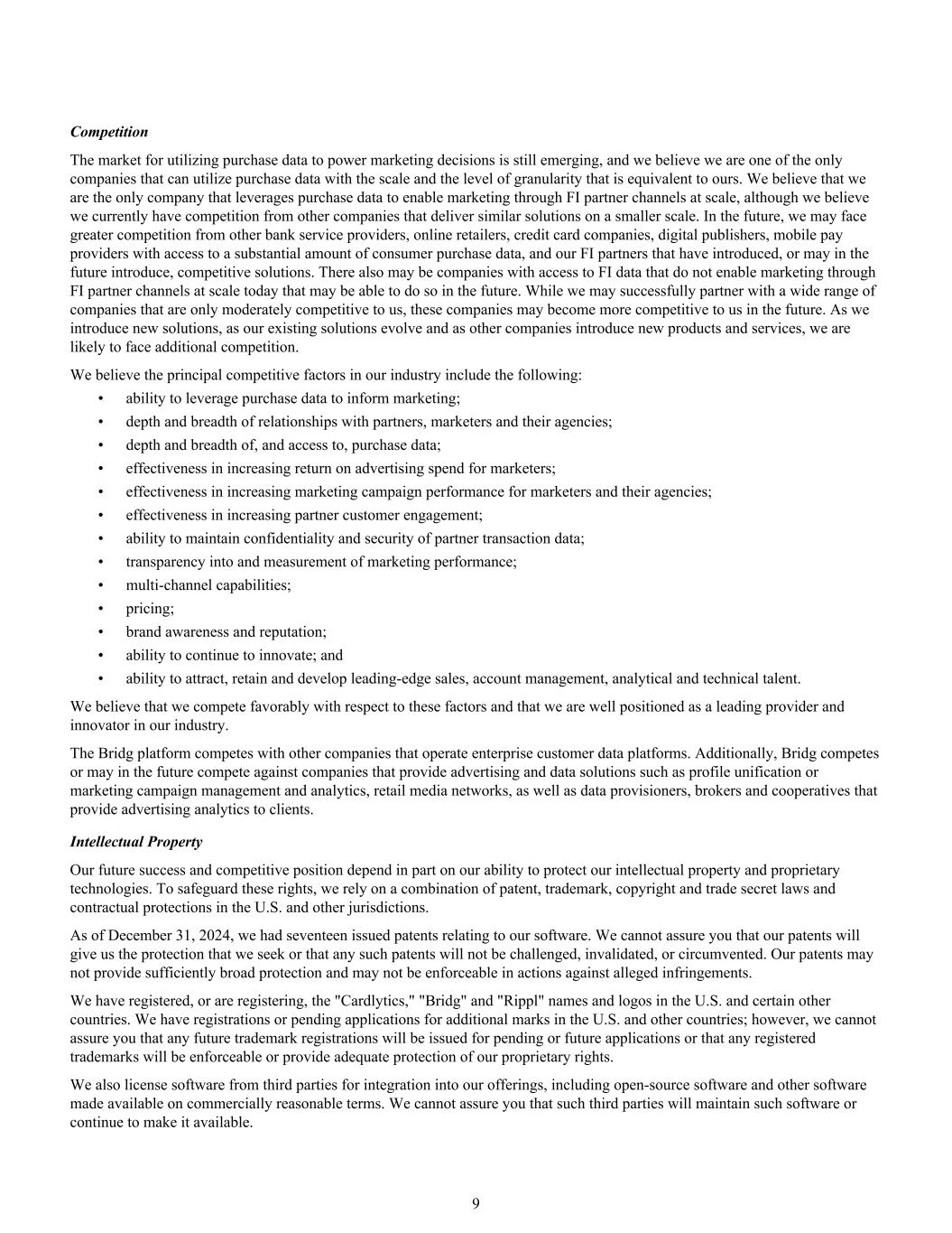 Competition The market for utilizing purchase data to power marketing decisions is still emerging, and we believe we are one of the only companies that can utilize purchase data with the scale and the level of granularity that is equivalent to ours. We believe that we are the only company that leverages purchase data to enable marketing through FI partner channels at scale, although we believe we currently have competition from other companies that deliver similar solutions on a smaller scale. In the future, we may face greater competition from other bank service providers, online retailers, credit card companies, digital publishers, mobile pay providers with access to a substantial amount of consumer purchase data, and our FI partners that have introduced, or may in the future introduce, competitive solutions. There also may be companies with access to FI data that do not enable marketing through FI partner channels at scale today that may be able to do so in the future. While we may successfully partner with a wide range of companies that are only moderately competitive to us, these companies may become more competitive to us in the future. As we introduce new solutions, as our existing solutions evolve and as other companies introduce new products and services, we are likely to face additional competition. We believe the principal competitive factors in our industry include the following: • ability to leverage purchase data to inform marketing; • depth and breadth of relationships with partners, marketers and their agencies; • depth and breadth of, and access to, purchase data; • effectiveness in increasing return on advertising spend for marketers; • effectiveness in increasing marketing campaign performance for marketers and their agencies; • effectiveness in increasing partner customer engagement; • ability to maintain confidentiality and security of partner transaction data; • transparency into and measurement of marketing performance; • multi-channel capabilities; • pricing; • brand awareness and reputation; • ability to continue to innovate; and • ability to attract, retain and develop leading-edge sales, account management, analytical and technical talent. We believe that we compete favorably with respect to these factors and that we are well positioned as a leading provider and innovator in our industry. The Bridg platform competes with other companies that operate enterprise customer data platforms. Additionally, Bridg competes or may in the future compete against companies that provide advertising and data solutions such as profile unification or marketing campaign management and analytics, retail media networks, as well as data provisioners, brokers and cooperatives that provide advertising analytics to clients. Intellectual Property Our future success and competitive position depend in part on our ability to protect our intellectual property and proprietary technologies. To safeguard these rights, we rely on a combination of patent, trademark, copyright and trade secret laws and contractual protections in the U.S. and other jurisdictions. As of December 31, 2024, we had seventeen issued patents relating to our software. We cannot assure you that our patents will give us the protection that we seek or that any such patents will not be challenged, invalidated, or circumvented. Our patents may not provide sufficiently broad protection and may not be enforceable in actions against alleged infringements. We have registered, or are registering, the "Cardlytics," "Bridg" and "Rippl" names and logos in the U.S. and certain other countries. We have registrations or pending applications for additional marks in the U.S. and other countries; however, we cannot assure you that any future trademark registrations will be issued for pending or future applications or that any registered trademarks will be enforceable or provide adequate protection of our proprietary rights. We also license software from third parties for integration into our offerings, including open-source software and other software made available on commercially reasonable terms. We cannot assure you that such third parties will maintain such software or continue to make it available. 9