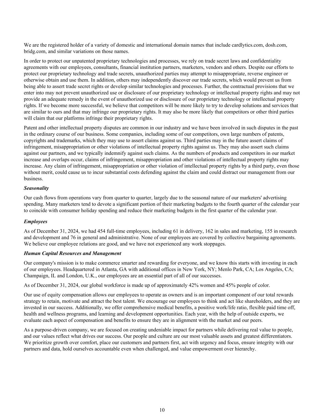 We are the registered holder of a variety of domestic and international domain names that include cardlytics.com, dosh.com, bridg.com, and similar variations on those names. In order to protect our unpatented proprietary technologies and processes, we rely on trade secret laws and confidentiality agreements with our employees, consultants, financial institution partners, marketers, vendors and others. Despite our efforts to protect our proprietary technology and trade secrets, unauthorized parties may attempt to misappropriate, reverse engineer or otherwise obtain and use them. In addition, others may independently discover our trade secrets, which would prevent us from being able to assert trade secret rights or develop similar technologies and processes. Further, the contractual provisions that we enter into may not prevent unauthorized use or disclosure of our proprietary technology or intellectual property rights and may not provide an adequate remedy in the event of unauthorized use or disclosure of our proprietary technology or intellectual property rights. If we become more successful, we believe that competitors will be more likely to try to develop solutions and services that are similar to ours and that may infringe our proprietary rights. It may also be more likely that competitors or other third parties will claim that our platforms infringe their proprietary rights. Patent and other intellectual property disputes are common in our industry and we have been involved in such disputes in the past in the ordinary course of our business. Some companies, including some of our competitors, own large numbers of patents, copyrights and trademarks, which they may use to assert claims against us. Third parties may in the future assert claims of infringement, misappropriation or other violations of intellectual property rights against us. They may also assert such claims against our partners, and we typically indemnify against such claims. As the numbers of products and competitors in our market increase and overlaps occur, claims of infringement, misappropriation and other violations of intellectual property rights may increase. Any claim of infringement, misappropriation or other violation of intellectual property rights by a third party, even those without merit, could cause us to incur substantial costs defending against the claim and could distract our management from our business. Seasonality Our cash flows from operations vary from quarter to quarter, largely due to the seasonal nature of our marketers' advertising spending. Many marketers tend to devote a significant portion of their marketing budgets to the fourth quarter of the calendar year to coincide with consumer holiday spending and reduce their marketing budgets in the first quarter of the calendar year. Employees As of December 31, 2024, we had 454 full-time employees, including 61 in delivery, 162 in sales and marketing, 155 in research and development and 76 in general and administrative. None of our employees are covered by collective bargaining agreements. We believe our employee relations are good, and we have not experienced any work stoppages. Human Capital Resources and Management Our company's mission is to make commerce smarter and rewarding for everyone, and we know this starts with investing in each of our employees. Headquartered in Atlanta, GA with additional offices in New York, NY; Menlo Park, CA; Los Angeles, CA; Champaign, IL and London, U.K., our employees are an essential part of all of our successes. As of December 31, 2024, our global workforce is made up of approximately 42% women and 45% people of color. Our use of equity compensation allows our employees to operate as owners and is an important component of our total rewards strategy to retain, motivate and attract the best talent. We encourage our employees to think and act like shareholders, and they are invested in our success. Additionally, we offer comprehensive medical benefits, a positive work/life ratio, flexible paid time off, health and wellness programs, and learning and development opportunities. Each year, with the help of outside experts, we evaluate each aspect of compensation and benefits to ensure they are in alignment with the market and our peers. As a purpose-driven company, we are focused on creating undeniable impact for partners while delivering real value to people, and our values reflect what drives our success. Our people and culture are our most valuable assets and greatest differentiators. We prioritize growth over comfort, place our customers and partners first, act with urgency and focus, ensure integrity with our partners and data, hold ourselves accountable even when challenged, and value empowerment over hierarchy. 10