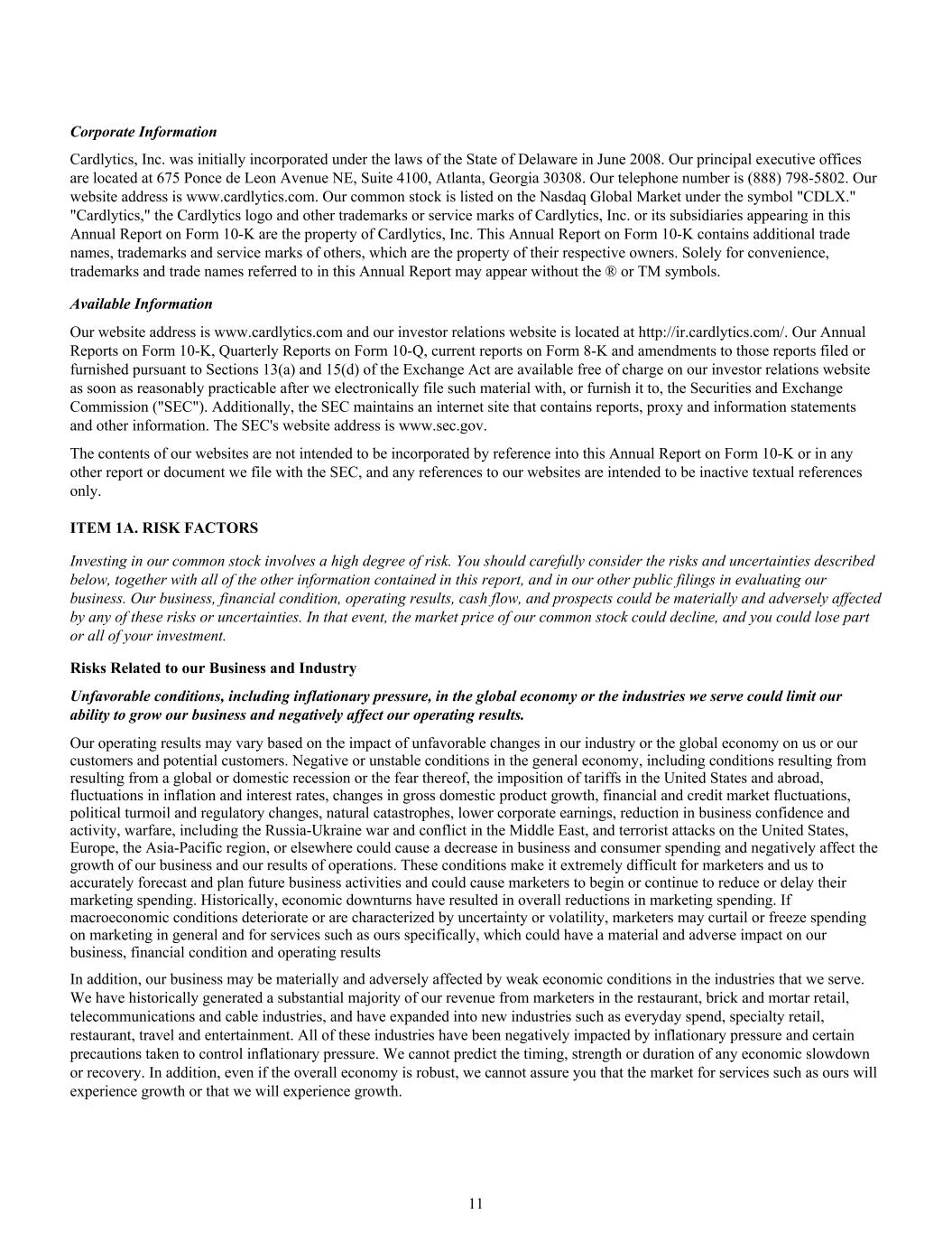Corporate Information Cardlytics, Inc. was initially incorporated under the laws of the State of Delaware in June 2008. Our principal executive offices are located at 675 Ponce de Leon Avenue NE, Suite 4100, Atlanta, Georgia 30308. Our telephone number is (888) 798-5802. Our website address is www.cardlytics.com. Our common stock is listed on the Nasdaq Global Market under the symbol "CDLX." "Cardlytics," the Cardlytics logo and other trademarks or service marks of Cardlytics, Inc. or its subsidiaries appearing in this Annual Report on Form 10-K are the property of Cardlytics, Inc. This Annual Report on Form 10-K contains additional trade names, trademarks and service marks of others, which are the property of their respective owners. Solely for convenience, trademarks and trade names referred to in this Annual Report may appear without the ® or TM symbols. Available Information Our website address is www.cardlytics.com and our investor relations website is located at http://ir.cardlytics.com/. Our Annual Reports on Form 10-K, Quarterly Reports on Form 10-Q, current reports on Form 8-K and amendments to those reports filed or furnished pursuant to Sections 13(a) and 15(d) of the Exchange Act are available free of charge on our investor relations website as soon as reasonably practicable after we electronically file such material with, or furnish it to, the Securities and Exchange Commission ("SEC"). Additionally, the SEC maintains an internet site that contains reports, proxy and information statements and other information. The SEC's website address is www.sec.gov. The contents of our websites are not intended to be incorporated by reference into this Annual Report on Form 10-K or in any other report or document we file with the SEC, and any references to our websites are intended to be inactive textual references only. ITEM 1A. RISK FACTORS Investing in our common stock involves a high degree of risk. You should carefully consider the risks and uncertainties described below, together with all of the other information contained in this report, and in our other public filings in evaluating our business. Our business, financial condition, operating results, cash flow, and prospects could be materially and adversely affected by any of these risks or uncertainties. In that event, the market price of our common stock could decline, and you could lose part or all of your investment. Risks Related to our Business and Industry Unfavorable conditions, including inflationary pressure, in the global economy or the industries we serve could limit our ability to grow our business and negatively affect our operating results. Our operating results may vary based on the impact of unfavorable changes in our industry or the global economy on us or our customers and potential customers. Negative or unstable conditions in the general economy, including conditions resulting from resulting from a global or domestic recession or the fear thereof, the imposition of tariffs in the United States and abroad, fluctuations in inflation and interest rates, changes in gross domestic product growth, financial and credit market fluctuations, political turmoil and regulatory changes, natural catastrophes, lower corporate earnings, reduction in business confidence and activity, warfare, including the Russia-Ukraine war and conflict in the Middle East, and terrorist attacks on the United States, Europe, the Asia-Pacific region, or elsewhere could cause a decrease in business and consumer spending and negatively affect the growth of our business and our results of operations. These conditions make it extremely difficult for marketers and us to accurately forecast and plan future business activities and could cause marketers to begin or continue to reduce or delay their marketing spending. Historically, economic downturns have resulted in overall reductions in marketing spending. If macroeconomic conditions deteriorate or are characterized by uncertainty or volatility, marketers may curtail or freeze spending on marketing in general and for services such as ours specifically, which could have a material and adverse impact on our business, financial condition and operating results In addition, our business may be materially and adversely affected by weak economic conditions in the industries that we serve. We have historically generated a substantial majority of our revenue from marketers in the restaurant, brick and mortar retail, telecommunications and cable industries, and have expanded into new industries such as everyday spend, specialty retail, restaurant, travel and entertainment. All of these industries have been negatively impacted by inflationary pressure and certain precautions taken to control inflationary pressure. We cannot predict the timing, strength or duration of any economic slowdown or recovery. In addition, even if the overall economy is robust, we cannot assure you that the market for services such as ours will experience growth or that we will experience growth. 11