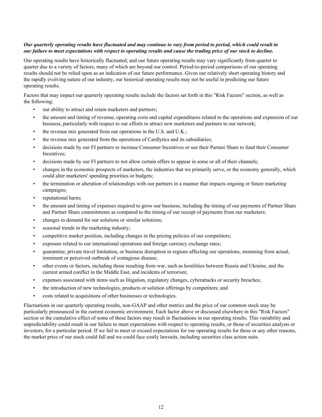 Our quarterly operating results have fluctuated and may continue to vary from period to period, which could result in our failure to meet expectations with respect to operating results and cause the trading price of our stock to decline. Our operating results have historically fluctuated, and our future operating results may vary significantly from quarter to quarter due to a variety of factors, many of which are beyond our control. Period-to-period comparisons of our operating results should not be relied upon as an indication of our future performance. Given our relatively short operating history and the rapidly evolving nature of our industry, our historical operating results may not be useful in predicting our future operating results. Factors that may impact our quarterly operating results include the factors set forth in this "Risk Factors" section, as well as the following: • our ability to attract and retain marketers and partners; • the amount and timing of revenue, operating costs and capital expenditures related to the operations and expansion of our business, particularly with respect to our efforts to attract new marketers and partners to our network; • the revenue mix generated from our operations in the U.S. and U.K.; • the revenue mix generated from the operations of Cardlytics and its subsidiaries; • decisions made by our FI partners to increase Consumer Incentives or use their Partner Share to fund their Consumer Incentives; • decisions made by our FI partners to not allow certain offers to appear in some or all of their channels; • changes in the economic prospects of marketers, the industries that we primarily serve, or the economy generally, which could alter marketers' spending priorities or budgets; • the termination or alteration of relationships with our partners in a manner that impacts ongoing or future marketing campaigns; • reputational harm; • the amount and timing of expenses required to grow our business, including the timing of our payments of Partner Share and Partner Share commitments as compared to the timing of our receipt of payments from our marketers; • changes in demand for our solutions or similar solutions; • seasonal trends in the marketing industry; • competitive market position, including changes in the pricing policies of our competitors; • exposure related to our international operations and foreign currency exchange rates; • quarantine, private travel limitation, or business disruption in regions affecting our operations, stemming from actual, imminent or perceived outbreak of contagious disease; • other events or factors, including those resulting from war, such as hostilities between Russia and Ukraine, and the current armed conflict in the Middle East, and incidents of terrorism; • expenses associated with items such as litigation, regulatory changes, cyberattacks or security breaches; • the introduction of new technologies, products or solution offerings by competitors; and • costs related to acquisitions of other businesses or technologies. Fluctuations in our quarterly operating results, non-GAAP and other metrics and the price of our common stock may be particularly pronounced in the current economic environment. Each factor above or discussed elsewhere in this "Risk Factors" section or the cumulative effect of some of these factors may result in fluctuations in our operating results. This variability and unpredictability could result in our failure to meet expectations with respect to operating results, or those of securities analysts or investors, for a particular period. If we fail to meet or exceed expectations for our operating results for these or any other reasons, the market price of our stock could fall and we could face costly lawsuits, including securities class action suits. 12