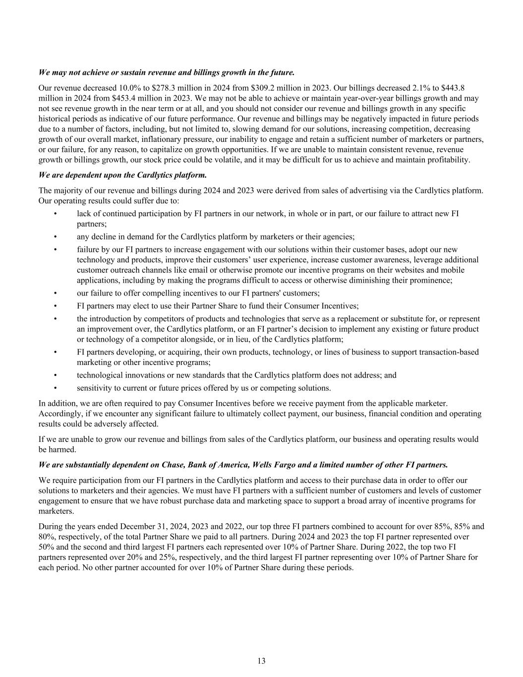 We may not achieve or sustain revenue and billings growth in the future. Our revenue decreased 10.0% to $278.3 million in 2024 from $309.2 million in 2023. Our billings decreased 2.1% to $443.8 million in 2024 from $453.4 million in 2023. We may not be able to achieve or maintain year-over-year billings growth and may not see revenue growth in the near term or at all, and you should not consider our revenue and billings growth in any specific historical periods as indicative of our future performance. Our revenue and billings may be negatively impacted in future periods due to a number of factors, including, but not limited to, slowing demand for our solutions, increasing competition, decreasing growth of our overall market, inflationary pressure, our inability to engage and retain a sufficient number of marketers or partners, or our failure, for any reason, to capitalize on growth opportunities. If we are unable to maintain consistent revenue, revenue growth or billings growth, our stock price could be volatile, and it may be difficult for us to achieve and maintain profitability. We are dependent upon the Cardlytics platform. The majority of our revenue and billings during 2024 and 2023 were derived from sales of advertising via the Cardlytics platform. Our operating results could suffer due to: • lack of continued participation by FI partners in our network, in whole or in part, or our failure to attract new FI partners; • any decline in demand for the Cardlytics platform by marketers or their agencies; • failure by our FI partners to increase engagement with our solutions within their customer bases, adopt our new technology and products, improve their customers’ user experience, increase customer awareness, leverage additional customer outreach channels like email or otherwise promote our incentive programs on their websites and mobile applications, including by making the programs difficult to access or otherwise diminishing their prominence; • our failure to offer compelling incentives to our FI partners' customers; • FI partners may elect to use their Partner Share to fund their Consumer Incentives; • the introduction by competitors of products and technologies that serve as a replacement or substitute for, or represent an improvement over, the Cardlytics platform, or an FI partner’s decision to implement any existing or future product or technology of a competitor alongside, or in lieu, of the Cardlytics platform; • FI partners developing, or acquiring, their own products, technology, or lines of business to support transaction-based marketing or other incentive programs; • technological innovations or new standards that the Cardlytics platform does not address; and • sensitivity to current or future prices offered by us or competing solutions. In addition, we are often required to pay Consumer Incentives before we receive payment from the applicable marketer. Accordingly, if we encounter any significant failure to ultimately collect payment, our business, financial condition and operating results could be adversely affected. If we are unable to grow our revenue and billings from sales of the Cardlytics platform, our business and operating results would be harmed. We are substantially dependent on Chase, Bank of America, Wells Fargo and a limited number of other FI partners. We require participation from our FI partners in the Cardlytics platform and access to their purchase data in order to offer our solutions to marketers and their agencies. We must have FI partners with a sufficient number of customers and levels of customer engagement to ensure that we have robust purchase data and marketing space to support a broad array of incentive programs for marketers. During the years ended December 31, 2024, 2023 and 2022, our top three FI partners combined to account for over 85%, 85% and 80%, respectively, of the total Partner Share we paid to all partners. During 2024 and 2023 the top FI partner represented over 50% and the second and third largest FI partners each represented over 10% of Partner Share. During 2022, the top two FI partners represented over 20% and 25%, respectively, and the third largest FI partner representing over 10% of Partner Share for each period. No other partner accounted for over 10% of Partner Share during these periods. 13