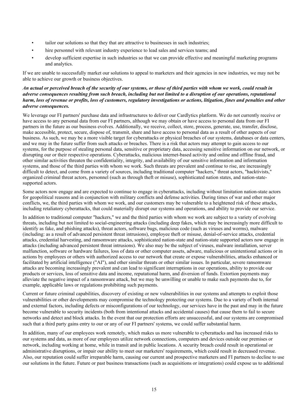 • tailor our solutions so that they that are attractive to businesses in such industries; • hire personnel with relevant industry experience to lead sales and services teams; and • develop sufficient expertise in such industries so that we can provide effective and meaningful marketing programs and analytics. If we are unable to successfully market our solutions to appeal to marketers and their agencies in new industries, we may not be able to achieve our growth or business objectives. An actual or perceived breach of the security of our systems, or those of third parties with whom we work, could result in adverse consequences resulting from such breach, including but not limited to a disruption of our operations, reputational harm, loss of revenue or profits, loss of customers, regulatory investigations or actions, litigation, fines and penalties and other adverse consequences. We leverage our FI partners' purchase data and infrastructures to deliver our Cardlytics platform. We do not currently receive or have access to any personal data from our FI partners, although we may obtain or have access to personal data from our FI partners in the future as our business evolves. Additionally, we receive, collect, store, process, generate, use, transfer, disclose, make accessible, protect, secure, dispose of, transmit, share and have access to personal data as a result of other aspects of our business. As such, we may be a more visible target for cyberattacks or physical breaches of our systems, databases or data centers, and we may in the future suffer from such attacks or breaches. There is a risk that actors may attempt to gain access to our systems, for the purpose of stealing personal data, sensitive or proprietary data, accessing sensitive information on our network, or disrupting our or their respective operations. Cyberattacks, malicious internet-based activity and online and offline fraud, and other similar activities threaten the confidentiality, integrity, and availability of our sensitive information and information systems, and those of the third parties with whom we work. Such threats are prevalent and continue to rise, are increasingly difficult to detect, and come from a variety of sources, including traditional computer "hackers," threat actors, "hacktivists," organized criminal threat actors, personnel (such as through theft or misuse), sophisticated nation states, and nation-state- supported actors. Some actors now engage and are expected to continue to engage in cyberattacks, including without limitation nation-state actors for geopolitical reasons and in conjunction with military conflicts and defense activities. During times of war and other major conflicts, we, the third parties with whom we work, and our customers may be vulnerable to a heightened risk of these attacks, including retaliatory cyberattacks, that could materially disrupt our systems and operations, and ability to provide our service. In addition to traditional computer "hackers," we and the third parties with whom we work are subject to a variety of evolving threats, including but not limited to social-engineering attacks (including deep fakes, which may be increasingly more difficult to identify as fake, and phishing attacks), threat actors, software bugs, malicious code (such as viruses and worms), malware (including: as a result of advanced persistent threat intrusions), employee theft or misuse, denial-of-service attacks, credential attacks, credential harvesting, and ransomware attacks, sophisticated nation-state and nation-state supported actors now engage in attacks (including advanced persistent threat intrusions). We also may be the subject of viruses, malware installation, server malfunction, software or hardware failures, loss of data or other computer assets, adware, malicious or unintentional actions or in actions by employees or others with authorized access to our network that create or expose vulnerabilities, attacks enhanced or facilitated by artificial intelligence ("AI"), and other similar threats or other similar issues. In particular, severe ransomware attacks are becoming increasingly prevalent and can lead to significant interruptions in our operations, ability to provide our products or services, loss of sensitive data and income, reputational harm, and diversion of funds. Extortion payments may alleviate the negative impact of a ransomware attack, but we may be unwilling or unable to make such payments due to, for example, applicable laws or regulations prohibiting such payments. Current or future criminal capabilities, discovery of existing or new vulnerabilities in our systems and attempts to exploit those vulnerabilities or other developments may compromise the technology protecting our systems. Due to a variety of both internal and external factors, including defects or misconfigurations of our technology, our services have in the past and may in the future become vulnerable to security incidents (both from intentional attacks and accidental causes) that cause them to fail to secure networks and detect and block attacks. In the event that our protection efforts are unsuccessful, and our systems are compromised such that a third party gains entry to our or any of our FI partners' systems, we could suffer substantial harm. In addition, many of our employees work remotely, which makes us more vulnerable to cyberattacks and has increased risks to our systems and data, as more of our employees utilize network connections, computers and devices outside our premises or network, including working at home, while in transit and in public locations. A security breach could result in operational or administrative disruptions, or impair our ability to meet our marketers' requirements, which could result in decreased revenue. Also, our reputation could suffer irreparable harm, causing our current and prospective marketers and FI partners to decline to use our solutions in the future. Fu