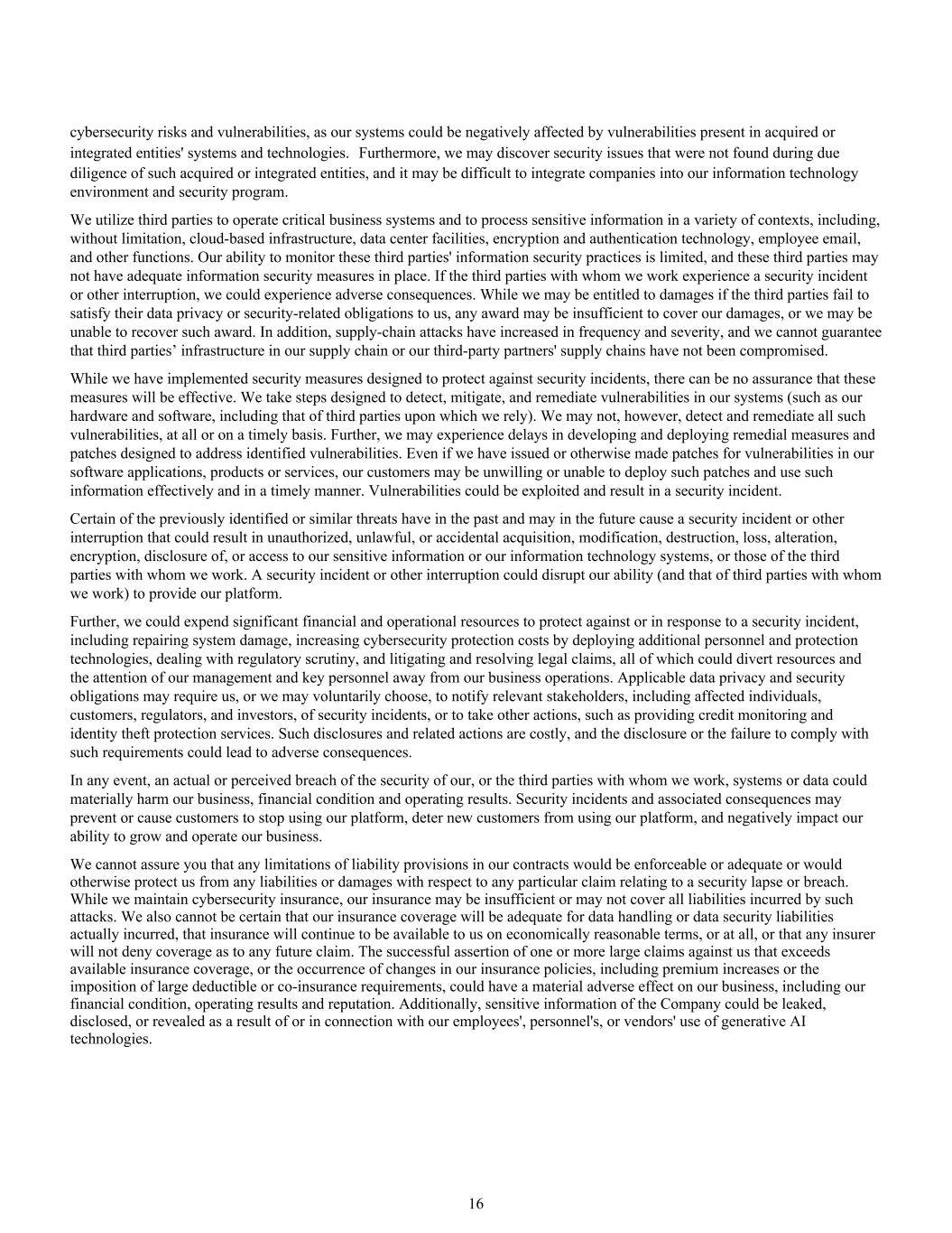 cybersecurity risks and vulnerabilities, as our systems could be negatively affected by vulnerabilities present in acquired or integrated entities' systems and technologies. Furthermore, we may discover security issues that were not found during due diligence of such acquired or integrated entities, and it may be difficult to integrate companies into our information technology environment and security program. We utilize third parties to operate critical business systems and to process sensitive information in a variety of contexts, including, without limitation, cloud-based infrastructure, data center facilities, encryption and authentication technology, employee email, and other functions. Our ability to monitor these third parties' information security practices is limited, and these third parties may not have adequate information security measures in place. If the third parties with whom we work experience a security incident or other interruption, we could experience adverse consequences. While we may be entitled to damages if the third parties fail to satisfy their data privacy or security-related obligations to us, any award may be insufficient to cover our damages, or we may be unable to recover such award. In addition, supply-chain attacks have increased in frequency and severity, and we cannot guarantee that third parties’ infrastructure in our supply chain or our third-party partners' supply chains have not been compromised. While we have implemented security measures designed to protect against security incidents, there can be no assurance that these measures will be effective. We take steps designed to detect, mitigate, and remediate vulnerabilities in our systems (such as our hardware and software, including that of third parties upon which we rely). We may not, however, detect and remediate all such vulnerabilities, at all or on a timely basis. Further, we may experience delays in developing and deploying remedial measures and patches designed to address identified vulnerabilities. Even if we have issued or otherwise made patches for vulnerabilities in our software applications, products or services, our customers may be unwilling or unable to deploy such patches and use such information effectively and in a timely manner. Vulnerabilities could be exploited and result in a security incident. Certain of the previously identified or similar threats have in the past and may in the future cause a security incident or other interruption that could result in unauthorized, unlawful, or accidental acquisition, modification, destruction, loss, alteration, encryption, disclosure of, or access to our sensitive information or our information technology systems, or those of the third parties with whom we work. A security incident or other interruption could disrupt our ability (and that of third parties with whom we work) to provide our platform. Further, we could expend significant financial and operational resources to protect against or in response to a security incident, including repairing system damage, increasing cybersecurity protection costs by deploying additional personnel and protection technologies, dealing with regulatory scrutiny, and litigating and resolving legal claims, all of which could divert resources and the attention of our management and key personnel away from our business operations. Applicable data privacy and security obligations may require us, or we may voluntarily choose, to notify relevant stakeholders, including affected individuals, customers, regulators, and investors, of security incidents, or to take other actions, such as providing credit monitoring and identity theft protection services. Such disclosures and related actions are costly, and the disclosure or the failure to comply with such requirements could lead to adverse consequences. In any event, an actual or perceived breach of the security of our, or the third parties with whom we work, systems or data could materially harm our business, financial condition and operating results. Security incidents and associated consequences may prevent or cause customers to stop using our platform, deter new customers from using our platform, and negatively impact our ability to grow and operate our business. We cannot assure you that any limitations of liability provisions in our contracts would be enforceable or adequate or would otherwise protect us from any liabilities or damages with respect to any particular claim relating to a security lapse or breach. While we maintain cybersecurity insurance, our insurance may be insufficient or may not cover all liabilities incurred by such attacks. We also cannot be certain that our insurance coverage will be adequate for data handling or data security liabilities actually incurred, that insurance will continue to be available to us on economically reasonable terms, or at all, or that any insurer will not deny coverage as to any future claim. The successful assertion of one or more large claims against us that exceeds available insurance coverage, or the occurrence of changes in our insurance policies, including premium increases or the imposition of large deductible or co-insurance requirements, could have a material adverse effect on our business, including our financial condition, operating results and reputation. Additionally, sensitive information of the Company could be leaked, disclosed, or revealed as a result of or in connection with our employees', personnel's, or vendors' use of generative AI technologies. 16
