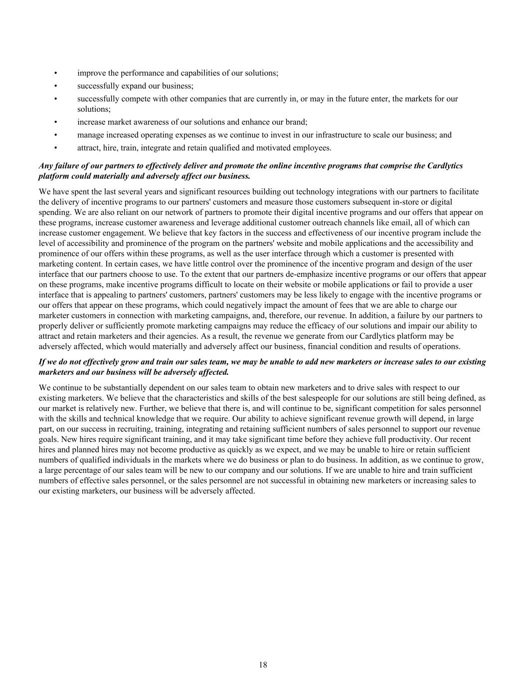 • improve the performance and capabilities of our solutions; • successfully expand our business; • successfully compete with other companies that are currently in, or may in the future enter, the markets for our solutions; • increase market awareness of our solutions and enhance our brand; • manage increased operating expenses as we continue to invest in our infrastructure to scale our business; and • attract, hire, train, integrate and retain qualified and motivated employees. Any failure of our partners to effectively deliver and promote the online incentive programs that comprise the Cardlytics platform could materially and adversely affect our business. We have spent the last several years and significant resources building out technology integrations with our partners to facilitate the delivery of incentive programs to our partners' customers and measure those customers subsequent in-store or digital spending. We are also reliant on our network of partners to promote their digital incentive programs and our offers that appear on these programs, increase customer awareness and leverage additional customer outreach channels like email, all of which can increase customer engagement. We believe that key factors in the success and effectiveness of our incentive program include the level of accessibility and prominence of the program on the partners' website and mobile applications and the accessibility and prominence of our offers within these programs, as well as the user interface through which a customer is presented with marketing content. In certain cases, we have little control over the prominence of the incentive program and design of the user interface that our partners choose to use. To the extent that our partners de-emphasize incentive programs or our offers that appear on these programs, make incentive programs difficult to locate on their website or mobile applications or fail to provide a user interface that is appealing to partners' customers, partners' customers may be less likely to engage with the incentive programs or our offers that appear on these programs, which could negatively impact the amount of fees that we are able to charge our marketer customers in connection with marketing campaigns, and, therefore, our revenue. In addition, a failure by our partners to properly deliver or sufficiently promote marketing campaigns may reduce the efficacy of our solutions and impair our ability to attract and retain marketers and their agencies. As a result, the revenue we generate from our Cardlytics platform may be adversely affected, which would materially and adversely affect our business, financial condition and results of operations. If we do not effectively grow and train our sales team, we may be unable to add new marketers or increase sales to our existing marketers and our business will be adversely affected. We continue to be substantially dependent on our sales team to obtain new marketers and to drive sales with respect to our existing marketers. We believe that the characteristics and skills of the best salespeople for our solutions are still being defined, as our market is relatively new. Further, we believe that there is, and will continue to be, significant competition for sales personnel with the skills and technical knowledge that we require. Our ability to achieve significant revenue growth will depend, in large part, on our success in recruiting, training, integrating and retaining sufficient numbers of sales personnel to support our revenue goals. New hires require significant training, and it may take significant time before they achieve full productivity. Our recent hires and planned hires may not become productive as quickly as we expect, and we may be unable to hire or retain sufficient numbers of qualified individuals in the markets where we do business or plan to do business. In addition, as we continue to grow, a large percentage of our sales team will be new to our company and our solutions. If we are unable to hire and train sufficient numbers of effective sales personnel, or the sales personnel are not successful in obtaining new marketers or increasing sales to our existing marketers, our business will be adversely affected. 18