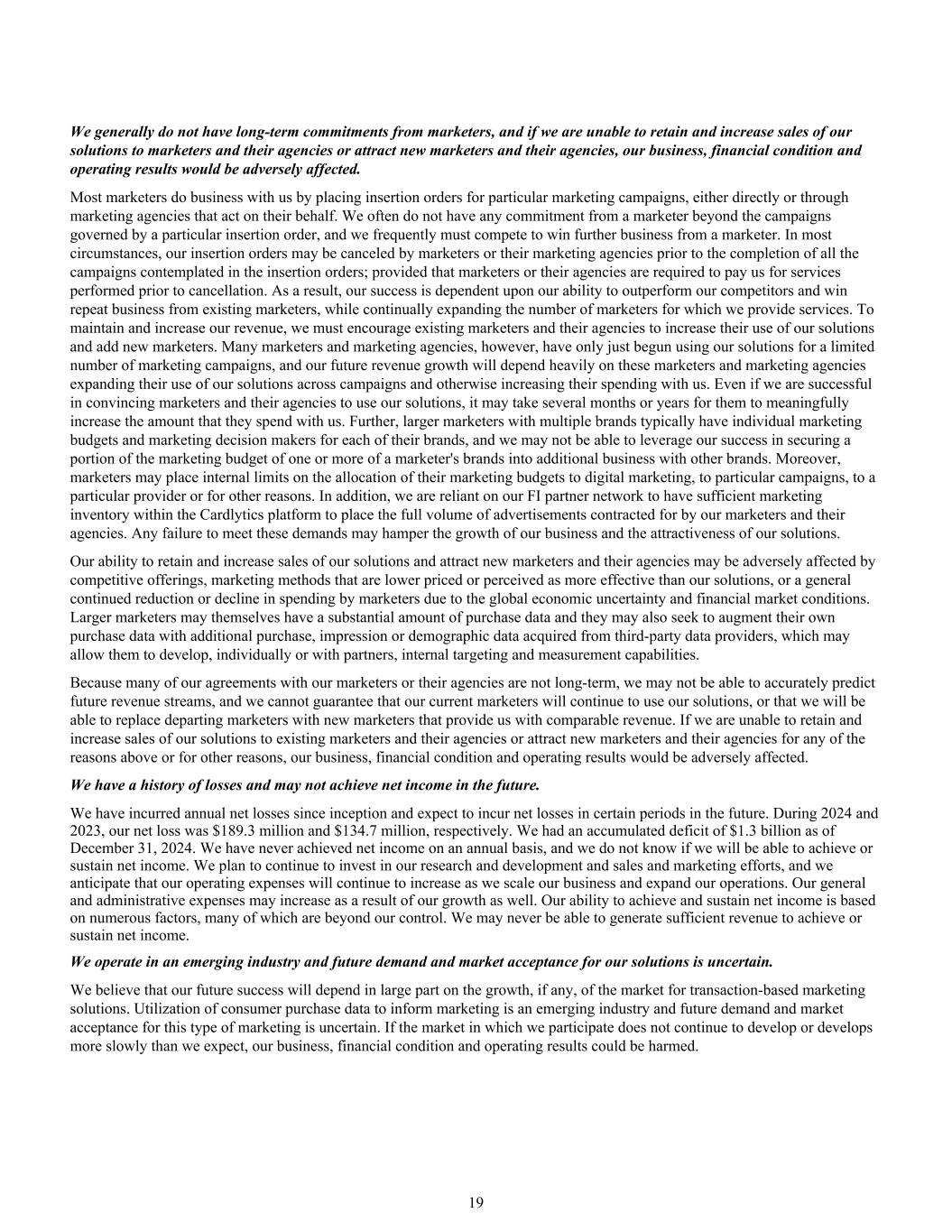 We generally do not have long-term commitments from marketers, and if we are unable to retain and increase sales of our solutions to marketers and their agencies or attract new marketers and their agencies, our business, financial condition and operating results would be adversely affected. Most marketers do business with us by placing insertion orders for particular marketing campaigns, either directly or through marketing agencies that act on their behalf. We often do not have any commitment from a marketer beyond the campaigns governed by a particular insertion order, and we frequently must compete to win further business from a marketer. In most circumstances, our insertion orders may be canceled by marketers or their marketing agencies prior to the completion of all the campaigns contemplated in the insertion orders; provided that marketers or their agencies are required to pay us for services performed prior to cancellation. As a result, our success is dependent upon our ability to outperform our competitors and win repeat business from existing marketers, while continually expanding the number of marketers for which we provide services. To maintain and increase our revenue, we must encourage existing marketers and their agencies to increase their use of our solutions and add new marketers. Many marketers and marketing agencies, however, have only just begun using our solutions for a limited number of marketing campaigns, and our future revenue growth will depend heavily on these marketers and marketing agencies expanding their use of our solutions across campaigns and otherwise increasing their spending with us. Even if we are successful in convincing marketers and their agencies to use our solutions, it may take several months or years for them to meaningfully increase the amount that they spend with us. Further, larger marketers with multiple brands typically have individual marketing budgets and marketing decision makers for each of their brands, and we may not be able to leverage our success in securing a portion of the marketing budget of one or more of a marketer's brands into additional business with other brands. Moreover, marketers may place internal limits on the allocation of their marketing budgets to digital marketing, to particular campaigns, to a particular provider or for other reasons. In addition, we are reliant on our FI partner network to have sufficient marketing inventory within the Cardlytics platform to place the full volume of advertisements contracted for by our marketers and their agencies. Any failure to meet these demands may hamper the growth of our business and the attractiveness of our solutions. Our ability to retain and increase sales of our solutions and attract new marketers and their agencies may be adversely affected by competitive offerings, marketing methods that are lower priced or perceived as more effective than our solutions, or a general continued reduction or decline in spending by marketers due to the global economic uncertainty and financial market conditions. Larger marketers may themselves have a substantial amount of purchase data and they may also seek to augment their own purchase data with additional purchase, impression or demographic data acquired from third-party data providers, which may allow them to develop, individually or with partners, internal targeting and measurement capabilities. Because many of our agreements with our marketers or their agencies are not long-term, we may not be able to accurately predict future revenue streams, and we cannot guarantee that our current marketers will continue to use our solutions, or that we will be able to replace departing marketers with new marketers that provide us with comparable revenue. If we are unable to retain and increase sales of our solutions to existing marketers and their agencies or attract new marketers and their agencies for any of the reasons above or for other reasons, our business, financial condition and operating results would be adversely affected. We have a history of losses and may not achieve net income in the future. We have incurred annual net losses since inception and expect to incur net losses in certain periods in the future. During 2024 and 2023, our net loss was $189.3 million and $134.7 million, respectively. We had an accumulated deficit of $1.3 billion as of December 31, 2024. We have never achieved net income on an annual basis, and we do not know if we will be able to achieve or sustain net income. We plan to continue to invest in our research and development and sales and marketing efforts, and we anticipate that our operating expenses will continue to increase as we scale our business and expand our operations. Our general and administrative expenses may increase as a result of our growth as well. Our ability to achieve and sustain net income is based on numerous factors, many of which are beyond our control. We may never be able to generate sufficient revenue to achieve or sustain net income. We operate in an emerging industry and future demand and market acceptance for our solutions is uncertain. We believe that our future success will depend in large part on the growth, if any, of the market for transaction-based marketing solutions. Utilization of consumer purchase data to inform marketing is an emerging industry and future demand and market acceptance for this type of marketing is uncertain. If the market in which we participate does not continue to develop or develops more slowly than we expect, our business, financial condition and operating results could be harmed. 19