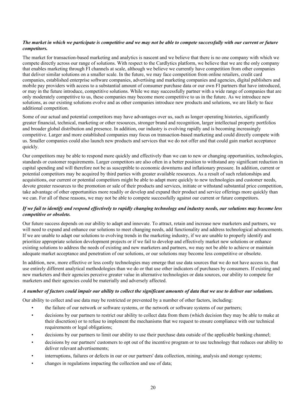 The market in which we participate is competitive and we may not be able to compete successfully with our current or future competitors. The market for transaction-based marketing and analytics is nascent and we believe that there is no one company with which we compete directly across our range of solutions. With respect to the Cardlytics platform, we believe that we are the only company that enables marketing through FI channels at scale, although we believe we currently have competition from other companies that deliver similar solutions on a smaller scale. In the future, we may face competition from online retailers, credit card companies, established enterprise software companies, advertising and marketing companies and agencies, digital publishers and mobile pay providers with access to a substantial amount of consumer purchase data or our own FI partners that have introduced, or may in the future introduce, competitive solutions. While we may successfully partner with a wide range of companies that are only moderately competitive to us, these companies may become more competitive to us in the future. As we introduce new solutions, as our existing solutions evolve and as other companies introduce new products and solutions, we are likely to face additional competition. Some of our actual and potential competitors may have advantages over us, such as longer operating histories, significantly greater financial, technical, marketing or other resources, stronger brand and recognition, larger intellectual property portfolios and broader global distribution and presence. In addition, our industry is evolving rapidly and is becoming increasingly competitive. Larger and more established companies may focus on transaction-based marketing and could directly compete with us. Smaller companies could also launch new products and services that we do not offer and that could gain market acceptance quickly. Our competitors may be able to respond more quickly and effectively than we can to new or changing opportunities, technologies, standards or customer requirements. Larger competitors are also often in a better position to withstand any significant reduction in capital spending and will therefore not be as susceptible to economic downturns and inflationary pressure. In addition, current or potential competitors may be acquired by third parties with greater available resources. As a result of such relationships and acquisitions, our current or potential competitors might be able to adapt more quickly to new technologies and customer needs, devote greater resources to the promotion or sale of their products and services, initiate or withstand substantial price competition, take advantage of other opportunities more readily or develop and expand their product and service offerings more quickly than we can. For all of these reasons, we may not be able to compete successfully against our current or future competitors. If we fail to identify and respond effectively to rapidly changing technology and industry needs, our solutions may become less competitive or obsolete. Our future success depends on our ability to adapt and innovate. To attract, retain and increase new marketers and partners, we will need to expand and enhance our solutions to meet changing needs, add functionality and address technological advancements. If we are unable to adapt our solutions to evolving trends in the marketing industry, if we are unable to properly identify and prioritize appropriate solution development projects or if we fail to develop and effectively market new solutions or enhance existing solutions to address the needs of existing and new marketers and partners, we may not be able to achieve or maintain adequate market acceptance and penetration of our solutions, or our solutions may become less competitive or obsolete. In addition, new, more effective or less costly technologies may emerge that use data sources that we do not have access to, that use entirely different analytical methodologies than we do or that use other indicators of purchases by consumers. If existing and new marketers and their agencies perceive greater value in alternative technologies or data sources, our ability to compete for marketers and their agencies could be materially and adversely affected. A number of factors could impair our ability to collect the significant amounts of data that we use to deliver our solutions. Our ability to collect and use data may be restricted or prevented by a number of other factors, including: • the failure of our network or software systems, or the network or software systems of our partners; • decisions by our partners to restrict our ability to collect data from them (which decision they may be able to make at their discretion) or to refuse to implement the mechanisms that we request to ensure compliance with our technical requirements or legal obligations; • decisions by our partners to limit our ability to use their purchase data outside of the applicable banking channel; • decisions by our partners' customers to opt out of the incentive program or to use technology that reduces our ability to deliver relevant advertisements; • interruptions, failures or defects in our or our partners' data collection, mining, analysis and storage systems; • changes in regulations impacting the collection and use of data; 20