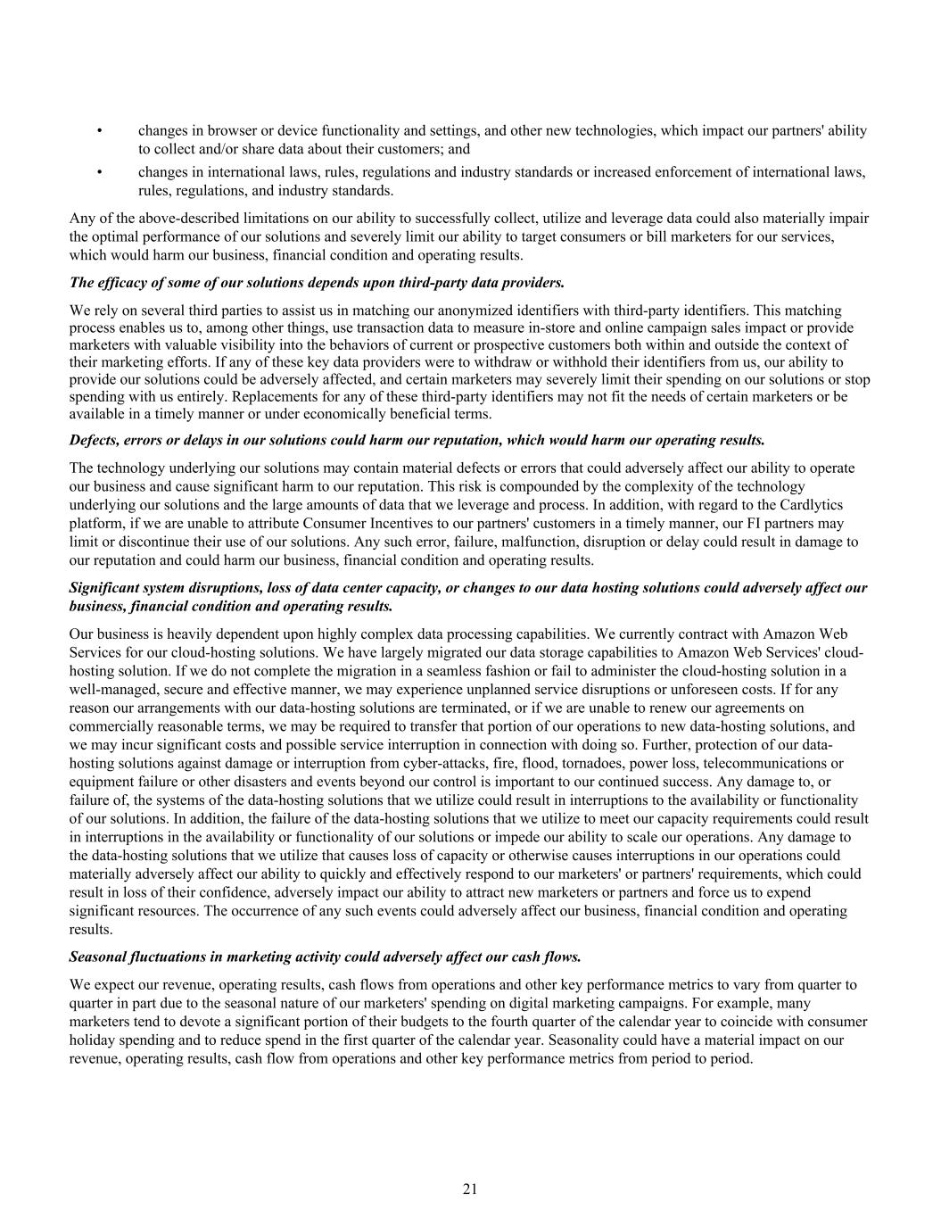 • changes in browser or device functionality and settings, and other new technologies, which impact our partners' ability to collect and/or share data about their customers; and • changes in international laws, rules, regulations and industry standards or increased enforcement of international laws, rules, regulations, and industry standards. Any of the above-described limitations on our ability to successfully collect, utilize and leverage data could also materially impair the optimal performance of our solutions and severely limit our ability to target consumers or bill marketers for our services, which would harm our business, financial condition and operating results. The efficacy of some of our solutions depends upon third-party data providers. We rely on several third parties to assist us in matching our anonymized identifiers with third-party identifiers. This matching process enables us to, among other things, use transaction data to measure in-store and online campaign sales impact or provide marketers with valuable visibility into the behaviors of current or prospective customers both within and outside the context of their marketing efforts. If any of these key data providers were to withdraw or withhold their identifiers from us, our ability to provide our solutions could be adversely affected, and certain marketers may severely limit their spending on our solutions or stop spending with us entirely. Replacements for any of these third-party identifiers may not fit the needs of certain marketers or be available in a timely manner or under economically beneficial terms. Defects, errors or delays in our solutions could harm our reputation, which would harm our operating results. The technology underlying our solutions may contain material defects or errors that could adversely affect our ability to operate our business and cause significant harm to our reputation. This risk is compounded by the complexity of the technology underlying our solutions and the large amounts of data that we leverage and process. In addition, with regard to the Cardlytics platform, if we are unable to attribute Consumer Incentives to our partners' customers in a timely manner, our FI partners may limit or discontinue their use of our solutions. Any such error, failure, malfunction, disruption or delay could result in damage to our reputation and could harm our business, financial condition and operating results. Significant system disruptions, loss of data center capacity, or changes to our data hosting solutions could adversely affect our business, financial condition and operating results. Our business is heavily dependent upon highly complex data processing capabilities. We currently contract with Amazon Web Services for our cloud-hosting solutions. We have largely migrated our data storage capabilities to Amazon Web Services' cloud- hosting solution. If we do not complete the migration in a seamless fashion or fail to administer the cloud-hosting solution in a well-managed, secure and effective manner, we may experience unplanned service disruptions or unforeseen costs. If for any reason our arrangements with our data-hosting solutions are terminated, or if we are unable to renew our agreements on commercially reasonable terms, we may be required to transfer that portion of our operations to new data-hosting solutions, and we may incur significant costs and possible service interruption in connection with doing so. Further, protection of our data- hosting solutions against damage or interruption from cyber-attacks, fire, flood, tornadoes, power loss, telecommunications or equipment failure or other disasters and events beyond our control is important to our continued success. Any damage to, or failure of, the systems of the data-hosting solutions that we utilize could result in interruptions to the availability or functionality of our solutions. In addition, the failure of the data-hosting solutions that we utilize to meet our capacity requirements could result in interruptions in the availability or functionality of our solutions or impede our ability to scale our operations. Any damage to the data-hosting solutions that we utilize that causes loss of capacity or otherwise causes interruptions in our operations could materially adversely affect our ability to quickly and effectively respond to our marketers' or partners' requirements, which could result in loss of their confidence, adversely impact our ability to attract new marketers or partners and force us to expend significant resources. The occurrence of any such events could adversely affect our business, financial condition and operating results. Seasonal fluctuations in marketing activity could adversely affect our cash flows. We expect our revenue, operating results, cash flows from operations and other key performance metrics to vary from quarter to quarter in part due to the seasonal nature of our marketers' spending on digital marketing campaigns. For example, many marketers tend to devote a significant portion of their budgets to the fourth quarter of the calendar year to coincide with consumer holiday spending and to reduce spend in the first quarter of the calendar year. Seasonality could have a material impact on our revenue, operating results, cash flow from operations and other key performance metrics from period to period. 21