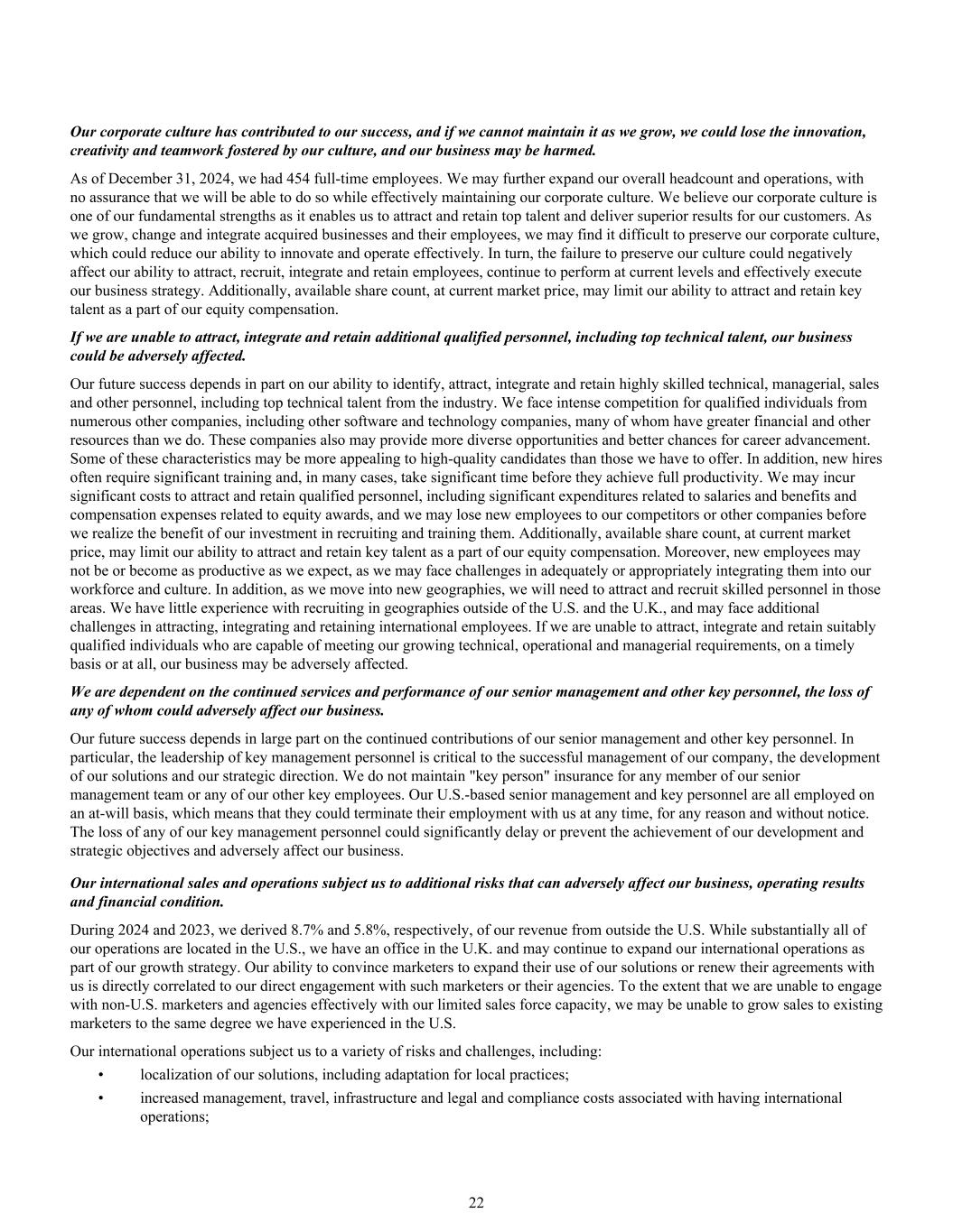 Our corporate culture has contributed to our success, and if we cannot maintain it as we grow, we could lose the innovation, creativity and teamwork fostered by our culture, and our business may be harmed. As of December 31, 2024, we had 454 full-time employees. We may further expand our overall headcount and operations, with no assurance that we will be able to do so while effectively maintaining our corporate culture. We believe our corporate culture is one of our fundamental strengths as it enables us to attract and retain top talent and deliver superior results for our customers. As we grow, change and integrate acquired businesses and their employees, we may find it difficult to preserve our corporate culture, which could reduce our ability to innovate and operate effectively. In turn, the failure to preserve our culture could negatively affect our ability to attract, recruit, integrate and retain employees, continue to perform at current levels and effectively execute our business strategy. Additionally, available share count, at current market price, may limit our ability to attract and retain key talent as a part of our equity compensation. If we are unable to attract, integrate and retain additional qualified personnel, including top technical talent, our business could be adversely affected. Our future success depends in part on our ability to identify, attract, integrate and retain highly skilled technical, managerial, sales and other personnel, including top technical talent from the industry. We face intense competition for qualified individuals from numerous other companies, including other software and technology companies, many of whom have greater financial and other resources than we do. These companies also may provide more diverse opportunities and better chances for career advancement. Some of these characteristics may be more appealing to high-quality candidates than those we have to offer. In addition, new hires often require significant training and, in many cases, take significant time before they achieve full productivity. We may incur significant costs to attract and retain qualified personnel, including significant expenditures related to salaries and benefits and compensation expenses related to equity awards, and we may lose new employees to our competitors or other companies before we realize the benefit of our investment in recruiting and training them. Additionally, available share count, at current market price, may limit our ability to attract and retain key talent as a part of our equity compensation. Moreover, new employees may not be or become as productive as we expect, as we may face challenges in adequately or appropriately integrating them into our workforce and culture. In addition, as we move into new geographies, we will need to attract and recruit skilled personnel in those areas. We have little experience with recruiting in geographies outside of the U.S. and the U.K., and may face additional challenges in attracting, integrating and retaining international employees. If we are unable to attract, integrate and retain suitably qualified individuals who are capable of meeting our growing technical, operational and managerial requirements, on a timely basis or at all, our business may be adversely affected. We are dependent on the continued services and performance of our senior management and other key personnel, the loss of any of whom could adversely affect our business. Our future success depends in large part on the continued contributions of our senior management and other key personnel. In particular, the leadership of key management personnel is critical to the successful management of our company, the development of our solutions and our strategic direction. We do not maintain "key person" insurance for any member of our senior management team or any of our other key employees. Our U.S.-based senior management and key personnel are all employed on an at-will basis, which means that they could terminate their employment with us at any time, for any reason and without notice. The loss of any of our key management personnel could significantly delay or prevent the achievement of our development and strategic objectives and adversely affect our business. Our international sales and operations subject us to additional risks that can adversely affect our business, operating results and financial condition. During 2024 and 2023, we derived 8.7% and 5.8%, respectively, of our revenue from outside the U.S. While substantially all of our operations are located in the U.S., we have an office in the U.K. and may continue to expand our international operations as part of our growth strategy. Our ability to convince marketers to expand their use of our solutions or renew their agreements with us is directly correlated to our direct engagement with such marketers or their agencies. To the extent that we are unable to engage with non-U.S. marketers and agencies effectively with our limited sales force capacity, we may be unable to grow sales to existing marketers to the same degree we have experienced in the U.S. Our international operations subject us to a variety of risks and challenges, including: • localization of our solutions, including adaptation for local practices; • increased management, travel, infrastructure and legal and compliance costs associated with having international operations; 22