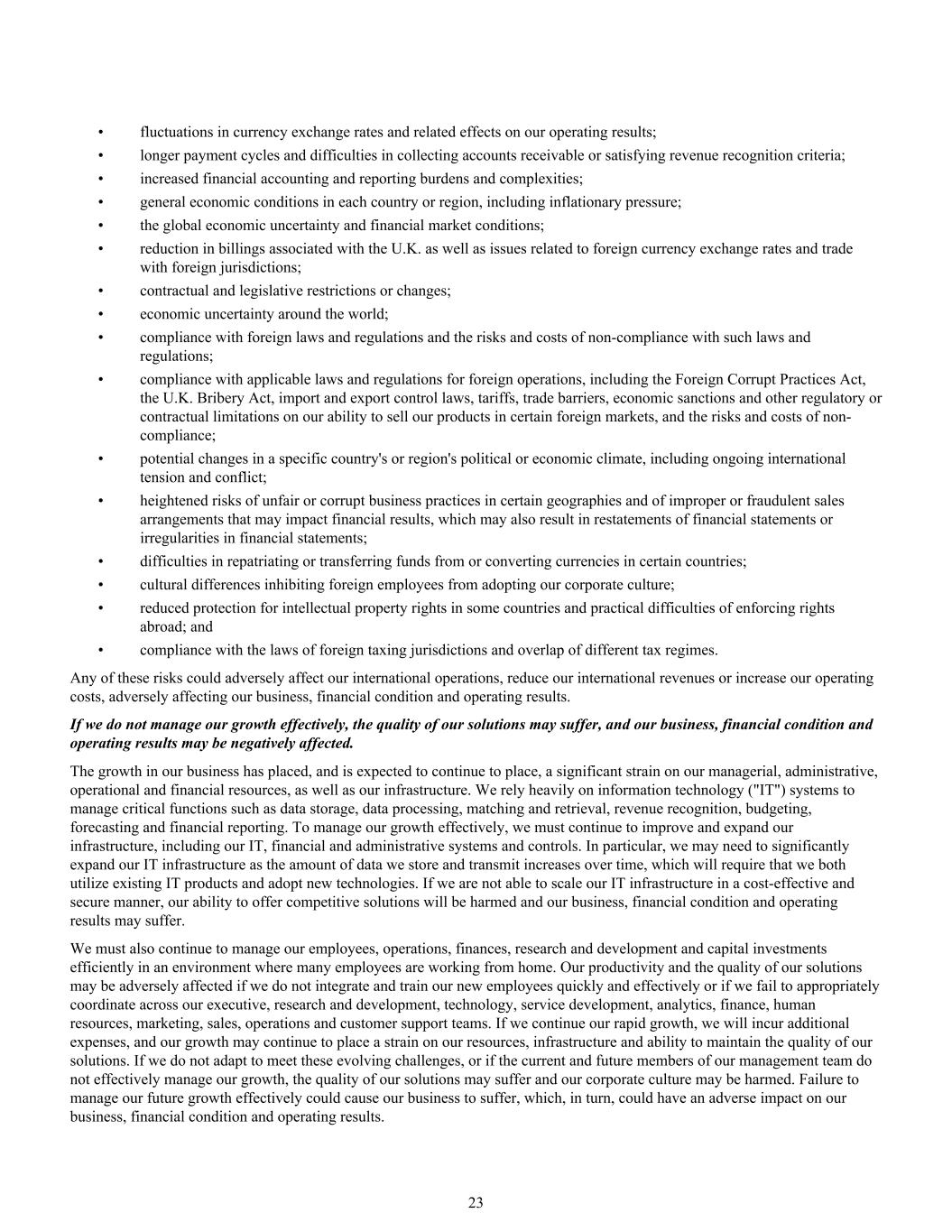 • fluctuations in currency exchange rates and related effects on our operating results; • longer payment cycles and difficulties in collecting accounts receivable or satisfying revenue recognition criteria; • increased financial accounting and reporting burdens and complexities; • general economic conditions in each country or region, including inflationary pressure; • the global economic uncertainty and financial market conditions; • reduction in billings associated with the U.K. as well as issues related to foreign currency exchange rates and trade with foreign jurisdictions; • contractual and legislative restrictions or changes; • economic uncertainty around the world; • compliance with foreign laws and regulations and the risks and costs of non-compliance with such laws and regulations; • compliance with applicable laws and regulations for foreign operations, including the Foreign Corrupt Practices Act, the U.K. Bribery Act, import and export control laws, tariffs, trade barriers, economic sanctions and other regulatory or contractual limitations on our ability to sell our products in certain foreign markets, and the risks and costs of non- compliance; • potential changes in a specific country's or region's political or economic climate, including ongoing international tension and conflict; • heightened risks of unfair or corrupt business practices in certain geographies and of improper or fraudulent sales arrangements that may impact financial results, which may also result in restatements of financial statements or irregularities in financial statements; • difficulties in repatriating or transferring funds from or converting currencies in certain countries; • cultural differences inhibiting foreign employees from adopting our corporate culture; • reduced protection for intellectual property rights in some countries and practical difficulties of enforcing rights abroad; and • compliance with the laws of foreign taxing jurisdictions and overlap of different tax regimes. Any of these risks could adversely affect our international operations, reduce our international revenues or increase our operating costs, adversely affecting our business, financial condition and operating results. If we do not manage our growth effectively, the quality of our solutions may suffer, and our business, financial condition and operating results may be negatively affected. The growth in our business has placed, and is expected to continue to place, a significant strain on our managerial, administrative, operational and financial resources, as well as our infrastructure. We rely heavily on information technology ("IT") systems to manage critical functions such as data storage, data processing, matching and retrieval, revenue recognition, budgeting, forecasting and financial reporting. To manage our growth effectively, we must continue to improve and expand our infrastructure, including our IT, financial and administrative systems and controls. In particular, we may need to significantly expand our IT infrastructure as the amount of data we store and transmit increases over time, which will require that we both utilize existing IT products and adopt new technologies. If we are not able to scale our IT infrastructure in a cost-effective and secure manner, our ability to offer competitive solutions will be harmed and our business, financial condition and operating results may suffer. We must also continue to manage our employees, operations, finances, research and development and capital investments efficiently in an environment where many employees are working from home. Our productivity and the quality of our solutions may be adversely affected if we do not integrate and train our new employees quickly and effectively or if we fail to appropriately coordinate across our executive, research and development, technology, service development, analytics, finance, human resources, marketing, sales, operations and customer support teams. If we continue our rapid growth, we will incur additional expenses, and our growth may continue to place a strain on our resources, infrastructure and ability to maintain the quality of our solutions. If we do not adapt to meet these evolving challenges, or if the current and future members of our management team do not effectively manage our growth, the quality of our solutions may suffer and our corporate culture may be harmed. Failure to manage our future growth effectively could cause our business to suffer, which, in turn, could have an adverse impact on our business, financial condition and operating results. 23