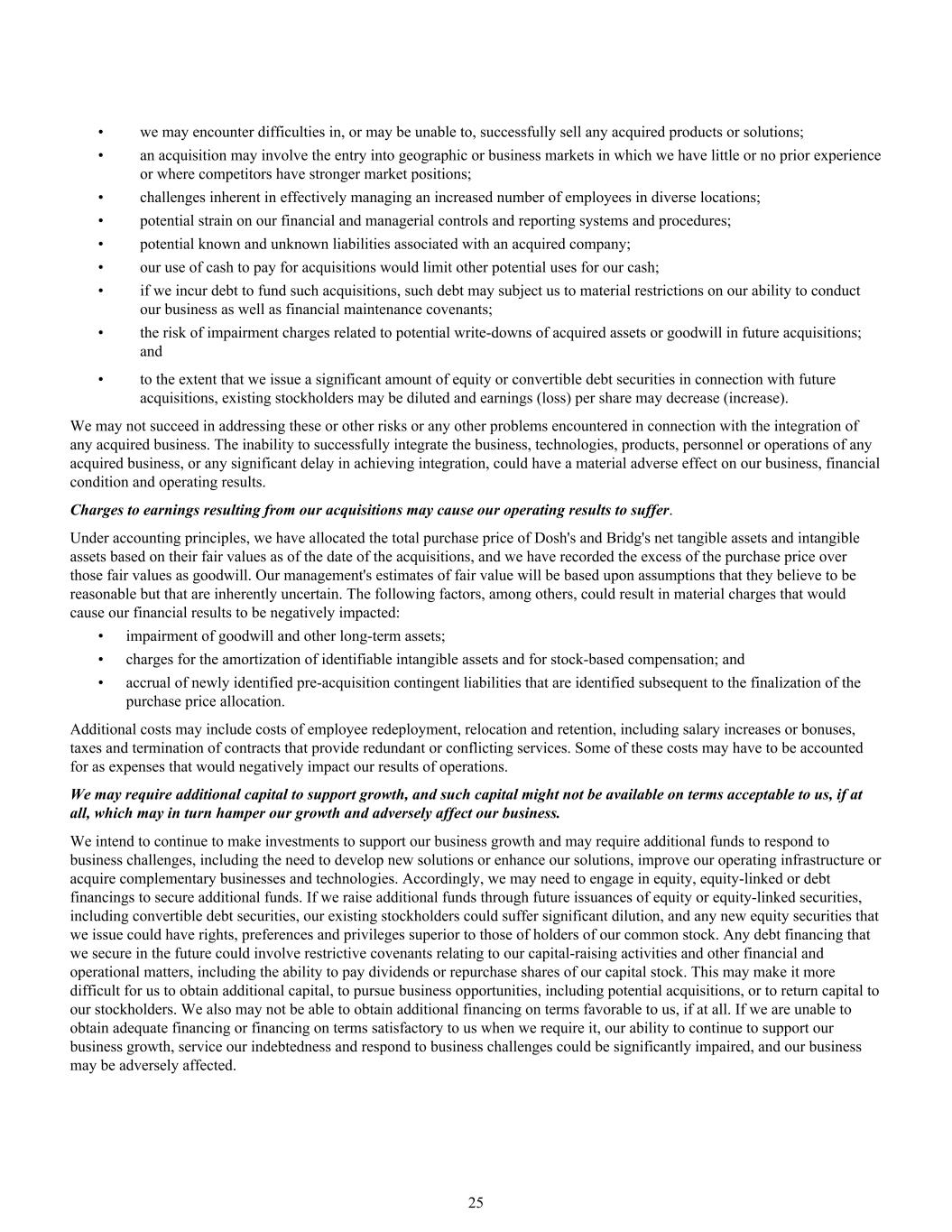 • we may encounter difficulties in, or may be unable to, successfully sell any acquired products or solutions; • an acquisition may involve the entry into geographic or business markets in which we have little or no prior experience or where competitors have stronger market positions; • challenges inherent in effectively managing an increased number of employees in diverse locations; • potential strain on our financial and managerial controls and reporting systems and procedures; • potential known and unknown liabilities associated with an acquired company; • our use of cash to pay for acquisitions would limit other potential uses for our cash; • if we incur debt to fund such acquisitions, such debt may subject us to material restrictions on our ability to conduct our business as well as financial maintenance covenants; • the risk of impairment charges related to potential write-downs of acquired assets or goodwill in future acquisitions; and • to the extent that we issue a significant amount of equity or convertible debt securities in connection with future acquisitions, existing stockholders may be diluted and earnings (loss) per share may decrease (increase). We may not succeed in addressing these or other risks or any other problems encountered in connection with the integration of any acquired business. The inability to successfully integrate the business, technologies, products, personnel or operations of any acquired business, or any significant delay in achieving integration, could have a material adverse effect on our business, financial condition and operating results. Charges to earnings resulting from our acquisitions may cause our operating results to suffer. Under accounting principles, we have allocated the total purchase price of Dosh's and Bridg's net tangible assets and intangible assets based on their fair values as of the date of the acquisitions, and we have recorded the excess of the purchase price over those fair values as goodwill. Our management's estimates of fair value will be based upon assumptions that they believe to be reasonable but that are inherently uncertain. The following factors, among others, could result in material charges that would cause our financial results to be negatively impacted: • impairment of goodwill and other long-term assets; • charges for the amortization of identifiable intangible assets and for stock-based compensation; and • accrual of newly identified pre-acquisition contingent liabilities that are identified subsequent to the finalization of the purchase price allocation. Additional costs may include costs of employee redeployment, relocation and retention, including salary increases or bonuses, taxes and termination of contracts that provide redundant or conflicting services. Some of these costs may have to be accounted for as expenses that would negatively impact our results of operations. We may require additional capital to support growth, and such capital might not be available on terms acceptable to us, if at all, which may in turn hamper our growth and adversely affect our business. We intend to continue to make investments to support our business growth and may require additional funds to respond to business challenges, including the need to develop new solutions or enhance our solutions, improve our operating infrastructure or acquire complementary businesses and technologies. Accordingly, we may need to engage in equity, equity-linked or debt financings to secure additional funds. If we raise additional funds through future issuances of equity or equity-linked securities, including convertible debt securities, our existing stockholders could suffer significant dilution, and any new equity securities that we issue could have rights, preferences and privileges superior to those of holders of our common stock. Any debt financing that we secure in the future could involve restrictive covenants relating to our capital-raising activities and other financial and operational matters, including the ability to pay dividends or repurchase shares of our capital stock. This may make it more difficult for us to obtain additional capital, to pursue business opportunities, including potential acquisitions, or to return capital to our stockholders. We also may not be able to obtain additional financing on terms favorable to us, if at all. If we are unable to obtain adequate financing or financing on terms satisfactory to us when we require it, our ability to continue to support our business growth, service our indebtedness and respond to business challenges could be significantly impaired, and our business may be adversely affected. 25