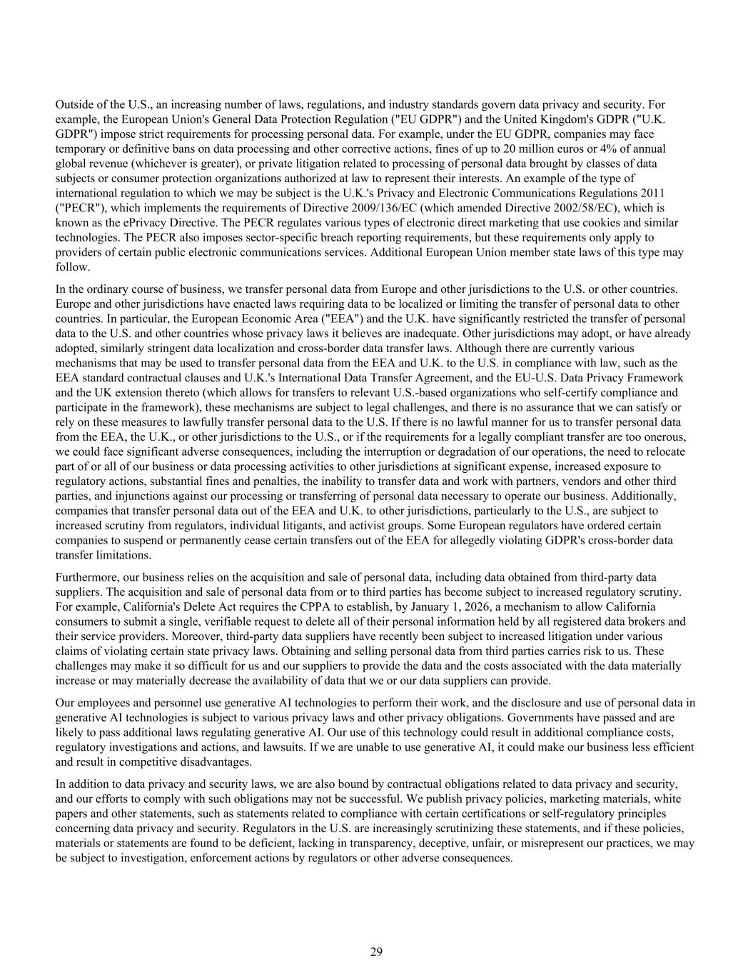 Outside of the U.S., an increasing number of laws, regulations, and industry standards govern data privacy and security. For example, the European Union's General Data Protection Regulation ("EU GDPR") and the United Kingdom's GDPR ("U.K. GDPR") impose strict requirements for processing personal data. For example, under the EU GDPR, companies may face temporary or definitive bans on data processing and other corrective actions, fines of up to 20 million euros or 4% of annual global revenue (whichever is greater), or private litigation related to processing of personal data brought by classes of data subjects or consumer protection organizations authorized at law to represent their interests. An example of the type of international regulation to which we may be subject is the U.K.'s Privacy and Electronic Communications Regulations 2011 ("PECR"), which implements the requirements of Directive 2009/136/EC (which amended Directive 2002/58/EC), which is known as the ePrivacy Directive. The PECR regulates various types of electronic direct marketing that use cookies and similar technologies. The PECR also imposes sector-specific breach reporting requirements, but these requirements only apply to providers of certain public electronic communications services. Additional European Union member state laws of this type may follow. In the ordinary course of business, we transfer personal data from Europe and other jurisdictions to the U.S. or other countries. Europe and other jurisdictions have enacted laws requiring data to be localized or limiting the transfer of personal data to other countries. In particular, the European Economic Area ("EEA") and the U.K. have significantly restricted the transfer of personal data to the U.S. and other countries whose privacy laws it believes are inadequate. Other jurisdictions may adopt, or have already adopted, similarly stringent data localization and cross-border data transfer laws. Although there are currently various mechanisms that may be used to transfer personal data from the EEA and U.K. to the U.S. in compliance with law, such as the EEA standard contractual clauses and U.K.'s International Data Transfer Agreement, and the EU-U.S. Data Privacy Framework and the UK extension thereto (which allows for transfers to relevant U.S.-based organizations who self-certify compliance and participate in the framework), these mechanisms are subject to legal challenges, and there is no assurance that we can satisfy or rely on these measures to lawfully transfer personal data to the U.S. If there is no lawful manner for us to transfer personal data from the EEA, the U.K., or other jurisdictions to the U.S., or if the requirements for a legally compliant transfer are too onerous, we could face significant adverse consequences, including the interruption or degradation of our operations, the need to relocate part of or all of our business or data processing activities to other jurisdictions at significant expense, increased exposure to regulatory actions, substantial fines and penalties, the inability to transfer data and work with partners, vendors and other third parties, and injunctions against our processing or transferring of personal data necessary to operate our business. Additionally, companies that transfer personal data out of the EEA and U.K. to other jurisdictions, particularly to the U.S., are subject to increased scrutiny from regulators, individual litigants, and activist groups. Some European regulators have ordered certain companies to suspend or permanently cease certain transfers out of the EEA for allegedly violating GDPR's cross-border data transfer limitations. Furthermore, our business relies on the acquisition and sale of personal data, including data obtained from third-party data suppliers. The acquisition and sale of personal data from or to third parties has become subject to increased regulatory scrutiny. For example, California's Delete Act requires the CPPA to establish, by January 1, 2026, a mechanism to allow California consumers to submit a single, verifiable request to delete all of their personal information held by all registered data brokers and their service providers. Moreover, third-party data suppliers have recently been subject to increased litigation under various claims of violating certain state privacy laws. Obtaining and selling personal data from third parties carries risk to us. These challenges may make it so difficult for us and our suppliers to provide the data and the costs associated with the data materially increase or may materially decrease the availability of data that we or our data suppliers can provide. Our employees and personnel use generative AI technologies to perform their work, and the disclosure and use of personal data in generative AI technologies is subject to various privacy laws and other privacy obligations. Governments have passed and are likely to pass additional laws regulating generative AI. Our use of this technology could result in additional compliance costs, regulatory investigations and actions, and lawsuits. If we are unable to use generative AI, it could make our business less efficient and result in competitive disadvantages. In addition to data privacy and security laws, we are also bound by contractual obligations related to data privacy and security, and our efforts to comply with such obligations may not be successful. We publish privacy policies, marketing materials, white papers and other statements, such as statements related to compliance with certain certifications or self-regulatory principles concerning data privacy and security. Regulators in the U.S. are increasingly scrutinizing these statements, and if these policies, materials or statements are found to be deficient, lacking in transparency, deceptive, unfair, or misrepresent our practices, we may be subject to investigation, enforcement actions by regulators or other adverse consequences. 29