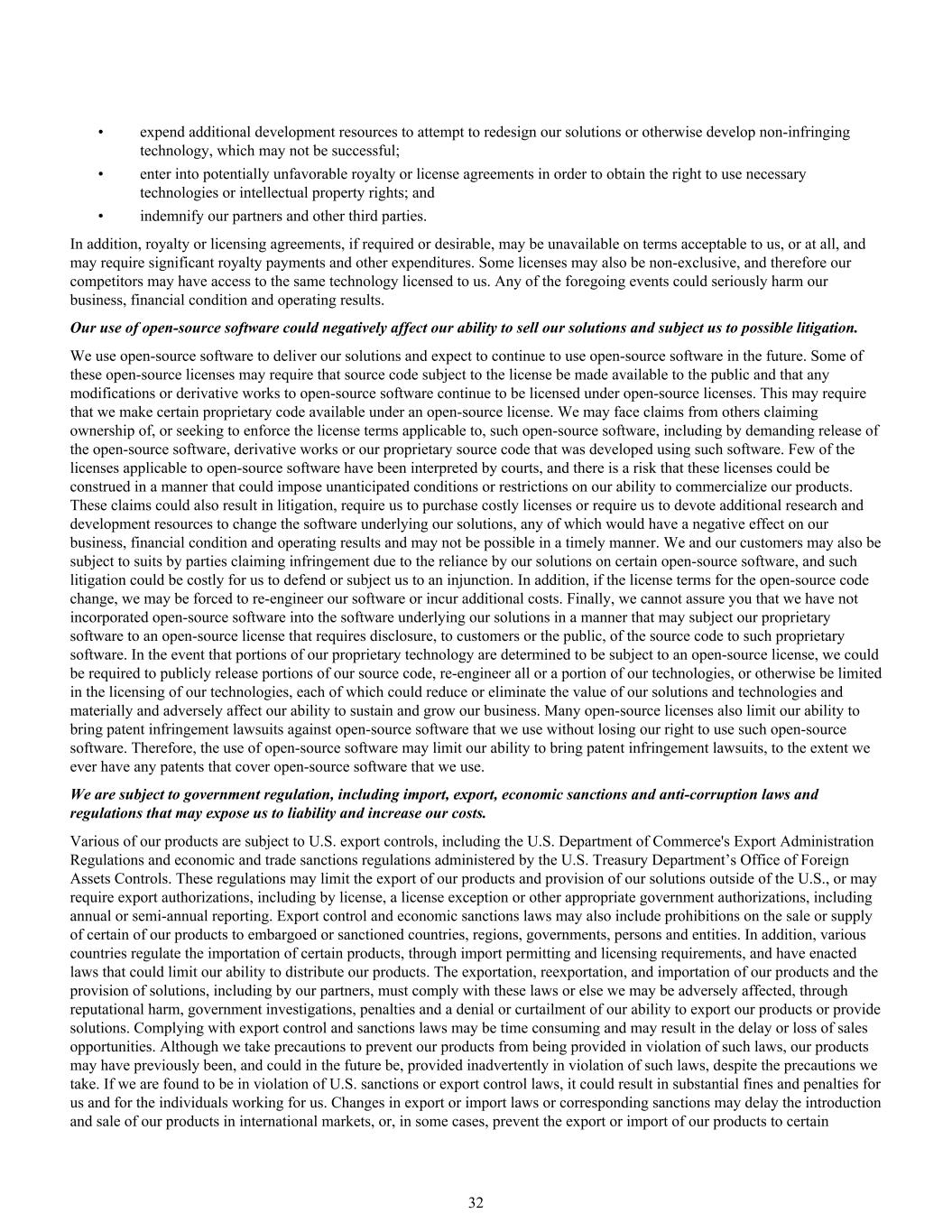 • expend additional development resources to attempt to redesign our solutions or otherwise develop non-infringing technology, which may not be successful; • enter into potentially unfavorable royalty or license agreements in order to obtain the right to use necessary technologies or intellectual property rights; and • indemnify our partners and other third parties. In addition, royalty or licensing agreements, if required or desirable, may be unavailable on terms acceptable to us, or at all, and may require significant royalty payments and other expenditures. Some licenses may also be non-exclusive, and therefore our competitors may have access to the same technology licensed to us. Any of the foregoing events could seriously harm our business, financial condition and operating results. Our use of open-source software could negatively affect our ability to sell our solutions and subject us to possible litigation. We use open-source software to deliver our solutions and expect to continue to use open-source software in the future. Some of these open-source licenses may require that source code subject to the license be made available to the public and that any modifications or derivative works to open-source software continue to be licensed under open-source licenses. This may require that we make certain proprietary code available under an open-source license. We may face claims from others claiming ownership of, or seeking to enforce the license terms applicable to, such open-source software, including by demanding release of the open-source software, derivative works or our proprietary source code that was developed using such software. Few of the licenses applicable to open-source software have been interpreted by courts, and there is a risk that these licenses could be construed in a manner that could impose unanticipated conditions or restrictions on our ability to commercialize our products. These claims could also result in litigation, require us to purchase costly licenses or require us to devote additional research and development resources to change the software underlying our solutions, any of which would have a negative effect on our business, financial condition and operating results and may not be possible in a timely manner. We and our customers may also be subject to suits by parties claiming infringement due to the reliance by our solutions on certain open-source software, and such litigation could be costly for us to defend or subject us to an injunction. In addition, if the license terms for the open-source code change, we may be forced to re-engineer our software or incur additional costs. Finally, we cannot assure you that we have not incorporated open-source software into the software underlying our solutions in a manner that may subject our proprietary software to an open-source license that requires disclosure, to customers or the public, of the source code to such proprietary software. In the event that portions of our proprietary technology are determined to be subject to an open-source license, we could be required to publicly release portions of our source code, re-engineer all or a portion of our technologies, or otherwise be limited in the licensing of our technologies, each of which could reduce or eliminate the value of our solutions and technologies and materially and adversely affect our ability to sustain and grow our business. Many open-source licenses also limit our ability to bring patent infringement lawsuits against open-source software that we use without losing our right to use such open-source software. Therefore, the use of open-source software may limit our ability to bring patent infringement lawsuits, to the extent we ever have any patents that cover open-source software that we use. We are subject to government regulation, including import, export, economic sanctions and anti-corruption laws and regulations that may expose us to liability and increase our costs. Various of our products are subject to U.S. export controls, including the U.S. Department of Commerce's Export Administration Regulations and economic and trade sanctions regulations administered by the U.S. Treasury Department’s Office of Foreign Assets Controls. These regulations may limit the export of our products and provision of our solutions outside of the U.S., or may require export authorizations, including by license, a license exception or other appropriate government authorizations, including annual or semi-annual reporting. Export control and economic sanctions laws may also include prohibitions on the sale or supply of certain of our products to embargoed or sanctioned countries, regions, governments, persons and entities. In addition, various countries regulate the importation of certain products, through import permitting and licensing requirements, and have enacted laws that could limit our ability to distribute our products. The exportation, reexportation, and importation of our products and the provision of solutions, including by our partners, must comply with these laws or else we may be adversely affected, through reputational harm, government investigations, penalties and a denial or curtailment of our ability to export our products or provide solutions. Complying with export control and sanctions laws may be time consuming and may result in the delay or loss of sales opportunities. Although we take precautions to prevent our products from being provided in violation of such laws, our products may have previously been, and could in the future be, provided inadvertently in violation of such laws, despite the precautions we take. If we are found to be in violation of U.S. sanctions or export control laws, it could result in substantial fines and penalties for us and for the individuals working for us. Changes in export or import laws or corresponding sanctions may delay the introduction and sale of our products in international markets, or, in some cas