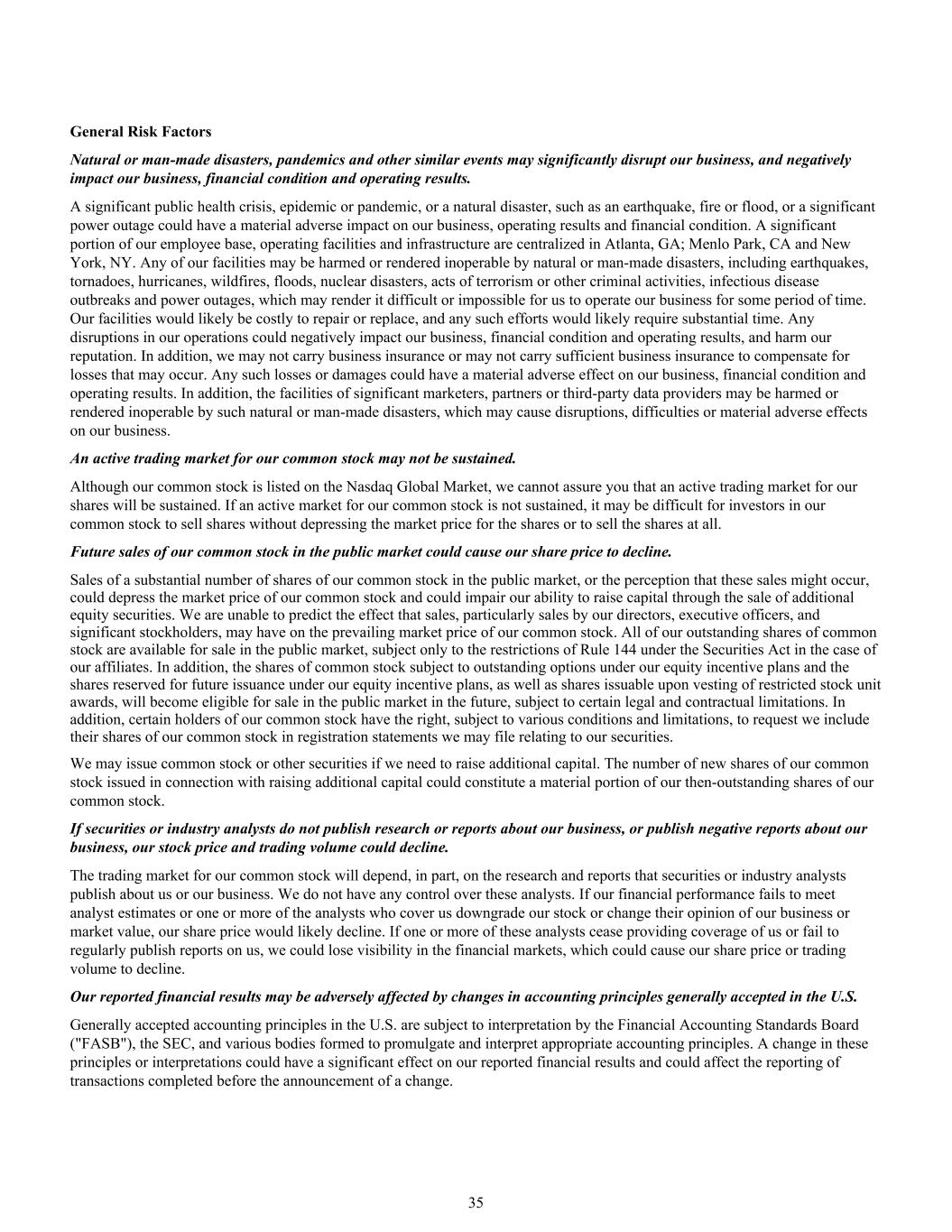 General Risk Factors Natural or man-made disasters, pandemics and other similar events may significantly disrupt our business, and negatively impact our business, financial condition and operating results. A significant public health crisis, epidemic or pandemic, or a natural disaster, such as an earthquake, fire or flood, or a significant power outage could have a material adverse impact on our business, operating results and financial condition. A significant portion of our employee base, operating facilities and infrastructure are centralized in Atlanta, GA; Menlo Park, CA and New York, NY. Any of our facilities may be harmed or rendered inoperable by natural or man-made disasters, including earthquakes, tornadoes, hurricanes, wildfires, floods, nuclear disasters, acts of terrorism or other criminal activities, infectious disease outbreaks and power outages, which may render it difficult or impossible for us to operate our business for some period of time. Our facilities would likely be costly to repair or replace, and any such efforts would likely require substantial time. Any disruptions in our operations could negatively impact our business, financial condition and operating results, and harm our reputation. In addition, we may not carry business insurance or may not carry sufficient business insurance to compensate for losses that may occur. Any such losses or damages could have a material adverse effect on our business, financial condition and operating results. In addition, the facilities of significant marketers, partners or third-party data providers may be harmed or rendered inoperable by such natural or man-made disasters, which may cause disruptions, difficulties or material adverse effects on our business. An active trading market for our common stock may not be sustained. Although our common stock is listed on the Nasdaq Global Market, we cannot assure you that an active trading market for our shares will be sustained. If an active market for our common stock is not sustained, it may be difficult for investors in our common stock to sell shares without depressing the market price for the shares or to sell the shares at all. Future sales of our common stock in the public market could cause our share price to decline. Sales of a substantial number of shares of our common stock in the public market, or the perception that these sales might occur, could depress the market price of our common stock and could impair our ability to raise capital through the sale of additional equity securities. We are unable to predict the effect that sales, particularly sales by our directors, executive officers, and significant stockholders, may have on the prevailing market price of our common stock. All of our outstanding shares of common stock are available for sale in the public market, subject only to the restrictions of Rule 144 under the Securities Act in the case of our affiliates. In addition, the shares of common stock subject to outstanding options under our equity incentive plans and the shares reserved for future issuance under our equity incentive plans, as well as shares issuable upon vesting of restricted stock unit awards, will become eligible for sale in the public market in the future, subject to certain legal and contractual limitations. In addition, certain holders of our common stock have the right, subject to various conditions and limitations, to request we include their shares of our common stock in registration statements we may file relating to our securities. We may issue common stock or other securities if we need to raise additional capital. The number of new shares of our common stock issued in connection with raising additional capital could constitute a material portion of our then-outstanding shares of our common stock. If securities or industry analysts do not publish research or reports about our business, or publish negative reports about our business, our stock price and trading volume could decline. The trading market for our common stock will depend, in part, on the research and reports that securities or industry analysts publish about us or our business. We do not have any control over these analysts. If our financial performance fails to meet analyst estimates or one or more of the analysts who cover us downgrade our stock or change their opinion of our business or market value, our share price would likely decline. If one or more of these analysts cease providing coverage of us or fail to regularly publish reports on us, we could lose visibility in the financial markets, which could cause our share price or trading volume to decline. Our reported financial results may be adversely affected by changes in accounting principles generally accepted in the U.S. Generally accepted accounting principles in the U.S. are subject to interpretation by the Financial Accounting Standards Board ("FASB"), the SEC, and various bodies formed to promulgate and interpret appropriate accounting principles. A change in these principles or interpretations could have a significant effect on our reported financial results and could affect the reporting of transactions completed before the announcement of a change. 35