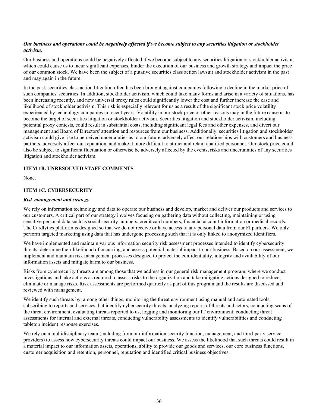 Our business and operations could be negatively affected if we become subject to any securities litigation or stockholder activism. Our business and operations could be negatively affected if we become subject to any securities litigation or stockholder activism, which could cause us to incur significant expenses, hinder the execution of our business and growth strategy and impact the price of our common stock. We have been the subject of a putative securities class action lawsuit and stockholder activism in the past and may again in the future. In the past, securities class action litigation often has been brought against companies following a decline in the market price of such companies' securities. In addition, stockholder activism, which could take many forms and arise in a variety of situations, has been increasing recently, and new universal proxy rules could significantly lower the cost and further increase the ease and likelihood of stockholder activism. This risk is especially relevant for us as a result of the significant stock price volatility experienced by technology companies in recent years. Volatility in our stock price or other reasons may in the future cause us to become the target of securities litigation or stockholder activism. Securities litigation and stockholder activism, including potential proxy contests, could result in substantial costs, including significant legal fees and other expenses, and divert our management and Board of Directors' attention and resources from our business. Additionally, securities litigation and stockholder activism could give rise to perceived uncertainties as to our future, adversely affect our relationships with customers and business partners, adversely affect our reputation, and make it more difficult to attract and retain qualified personnel. Our stock price could also be subject to significant fluctuation or otherwise be adversely affected by the events, risks and uncertainties of any securities litigation and stockholder activism. ITEM 1B. UNRESOLVED STAFF COMMENTS None. ITEM 1C. CYBERSECURITY Risk management and strategy We rely on information technology and data to operate our business and develop, market and deliver our products and services to our customers. A critical part of our strategy involves focusing on gathering data without collecting, maintaining or using sensitive personal data such as social security numbers, credit card numbers, financial account information or medical records. The Cardlytics platform is designed so that we do not receive or have access to any personal data from our FI partners. We only perform targeted marketing using data that has undergone processing such that it is only linked to anonymized identifiers. We have implemented and maintain various information security risk assessment processes intended to identify cybersecurity threats, determine their likelihood of occurring, and assess potential material impact to our business. Based on our assessment, we implement and maintain risk management processes designed to protect the confidentiality, integrity and availability of our information assets and mitigate harm to our business. Risks from cybersecurity threats are among those that we address in our general risk management program, where we conduct investigations and take actions as required to assess risks to the organization and take mitigating actions designed to reduce, eliminate or manage risks. Risk assessments are performed quarterly as part of this program and the results are discussed and reviewed with management. We identify such threats by, among other things, monitoring the threat environment using manual and automated tools, subscribing to reports and services that identify cybersecurity threats, analyzing reports of threats and actors, conducting scans of the threat environment, evaluating threats reported to us, logging and monitoring our IT environment, conducting threat assessments for internal and external threats, conducting vulnerability assessments to identify vulnerabilities and conducting tabletop incident response exercises. We rely on a multidisciplinary team (including from our information security function, management, and third-party service providers) to assess how cybersecurity threats could impact our business. We assess the likelihood that such threats could result in a material impact to our information assets, operations, ability to provide our goods and services, our core business functions, customer acquisition and retention, personnel, reputation and identified critical business objectives. 36