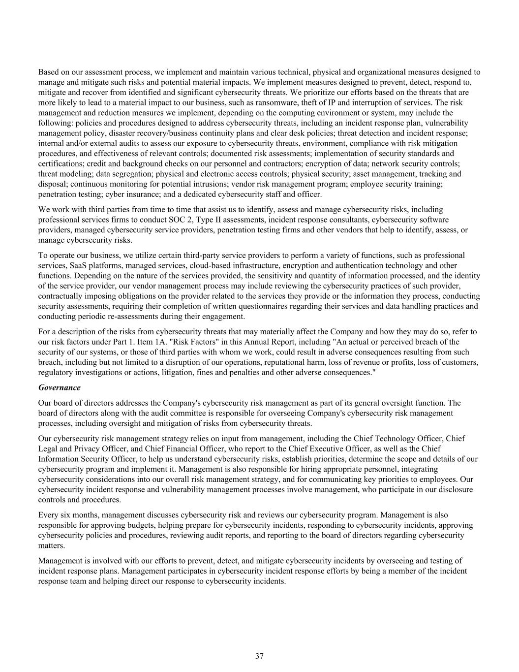 Based on our assessment process, we implement and maintain various technical, physical and organizational measures designed to manage and mitigate such risks and potential material impacts. We implement measures designed to prevent, detect, respond to, mitigate and recover from identified and significant cybersecurity threats. We prioritize our efforts based on the threats that are more likely to lead to a material impact to our business, such as ransomware, theft of IP and interruption of services. The risk management and reduction measures we implement, depending on the computing environment or system, may include the following: policies and procedures designed to address cybersecurity threats, including an incident response plan, vulnerability management policy, disaster recovery/business continuity plans and clear desk policies; threat detection and incident response; internal and/or external audits to assess our exposure to cybersecurity threats, environment, compliance with risk mitigation procedures, and effectiveness of relevant controls; documented risk assessments; implementation of security standards and certifications; credit and background checks on our personnel and contractors; encryption of data; network security controls; threat modeling; data segregation; physical and electronic access controls; physical security; asset management, tracking and disposal; continuous monitoring for potential intrusions; vendor risk management program; employee security training; penetration testing; cyber insurance; and a dedicated cybersecurity staff and officer. We work with third parties from time to time that assist us to identify, assess and manage cybersecurity risks, including professional services firms to conduct SOC 2, Type II assessments, incident response consultants, cybersecurity software providers, managed cybersecurity service providers, penetration testing firms and other vendors that help to identify, assess, or manage cybersecurity risks. To operate our business, we utilize certain third-party service providers to perform a variety of functions, such as professional services, SaaS platforms, managed services, cloud-based infrastructure, encryption and authentication technology and other functions. Depending on the nature of the services provided, the sensitivity and quantity of information processed, and the identity of the service provider, our vendor management process may include reviewing the cybersecurity practices of such provider, contractually imposing obligations on the provider related to the services they provide or the information they process, conducting security assessments, requiring their completion of written questionnaires regarding their services and data handling practices and conducting periodic re-assessments during their engagement. For a description of the risks from cybersecurity threats that may materially affect the Company and how they may do so, refer to our risk factors under Part 1. Item 1A. "Risk Factors" in this Annual Report, including "An actual or perceived breach of the security of our systems, or those of third parties with whom we work, could result in adverse consequences resulting from such breach, including but not limited to a disruption of our operations, reputational harm, loss of revenue or profits, loss of customers, regulatory investigations or actions, litigation, fines and penalties and other adverse consequences." Governance Our board of directors addresses the Company's cybersecurity risk management as part of its general oversight function. The board of directors along with the audit committee is responsible for overseeing Company's cybersecurity risk management processes, including oversight and mitigation of risks from cybersecurity threats. Our cybersecurity risk management strategy relies on input from management, including the Chief Technology Officer, Chief Legal and Privacy Officer, and Chief Financial Officer, who report to the Chief Executive Officer, as well as the Chief Information Security Officer, to help us understand cybersecurity risks, establish priorities, determine the scope and details of our cybersecurity program and implement it. Management is also responsible for hiring appropriate personnel, integrating cybersecurity considerations into our overall risk management strategy, and for communicating key priorities to employees. Our cybersecurity incident response and vulnerability management processes involve management, who participate in our disclosure controls and procedures. Every six months, management discusses cybersecurity risk and reviews our cybersecurity program. Management is also responsible for approving budgets, helping prepare for cybersecurity incidents, responding to cybersecurity incidents, approving cybersecurity policies and procedures, reviewing audit reports, and reporting to the board of directors regarding cybersecurity matters. Management is involved with our efforts to prevent, detect, and mitigate cybersecurity incidents by overseeing and testing of incident response plans. Management participates in cybersecurity incident response efforts by being a member of the incident response team and helping direct our response to cybersecurity incidents. 37
