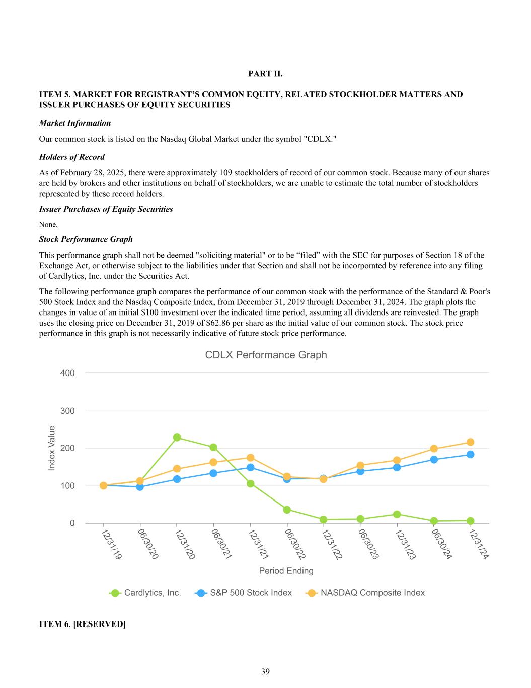 PART II. ITEM 5. MARKET FOR REGISTRANT’S COMMON EQUITY, RELATED STOCKHOLDER MATTERS AND ISSUER PURCHASES OF EQUITY SECURITIES Market Information Our common stock is listed on the Nasdaq Global Market under the symbol "CDLX." Holders of Record As of February 28, 2025, there were approximately 109 stockholders of record of our common stock. Because many of our shares are held by brokers and other institutions on behalf of stockholders, we are unable to estimate the total number of stockholders represented by these record holders. Issuer Purchases of Equity Securities None. Stock Performance Graph This performance graph shall not be deemed "soliciting material" or to be “filed” with the SEC for purposes of Section 18 of the Exchange Act, or otherwise subject to the liabilities under that Section and shall not be incorporated by reference into any filing of Cardlytics, Inc. under the Securities Act. The following performance graph compares the performance of our common stock with the performance of the Standard & Poor's 500 Stock Index and the Nasdaq Composite Index, from December 31, 2019 through December 31, 2024. The graph plots the changes in value of an initial $100 investment over the indicated time period, assuming all dividends are reinvested. The graph uses the closing price on December 31, 2019 of $62.86 per share as the initial value of our common stock. The stock price performance in this graph is not necessarily indicative of future stock price performance. Period Ending In de x Va lu e CDLX Performance Graph Cardlytics, Inc. S&P 500 Stock Index NASDAQ Composite Index 12/31/19 06/30/20 12/31/20 06/30/21 12/31/21 06/30/22 12/31/22 06/30/23 12/31/23 06/30/24 12/31/24 0 100 200 300 400 ITEM 6. [RESERVED] 39