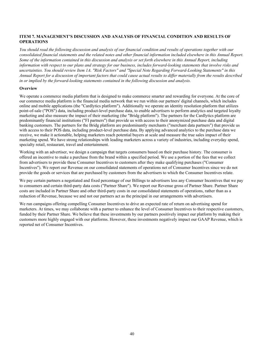 ITEM 7. MANAGEMENT’S DISCUSSION AND ANALYSIS OF FINANCIAL CONDITION AND RESULTS OF OPERATIONS You should read the following discussion and analysis of our financial condition and results of operations together with our consolidated financial statements and the related notes and other financial information included elsewhere in this Annual Report. Some of the information contained in this discussion and analysis or set forth elsewhere in this Annual Report, including information with respect to our plans and strategy for our business, includes forward-looking statements that involve risks and uncertainties. You should review Item 1A. "Risk Factors" and "Special Note Regarding Forward-Looking Statements" in this Annual Report for a discussion of important factors that could cause actual results to differ materially from the results described in or implied by the forward-looking statements contained in the following discussion and analysis. Overview We operate a commerce media platform that is designed to make commerce smarter and rewarding for everyone. At the core of our commerce media platform is the financial media network that we run within our partners' digital channels, which includes online and mobile applications (the "Cardlytics platform"). Additionally we operate an identity resolution platform that utilizes point-of-sale ("POS") data, including product-level purchase data, to enable advertisers to perform analytics and targeted loyalty marketing and also measure the impact of their marketing (the "Bridg platform"). The partners for the Cardlytics platform are predominantly financial institutions ("FI partners") that provide us with access to their anonymized purchase data and digital banking customers. The partners for the Bridg platform are predominantly merchants ("merchant data partners") that provide us with access to their POS data, including product-level purchase data. By applying advanced analytics to the purchase data we receive, we make it actionable, helping marketers reach potential buyers at scale and measure the true sales impact of their marketing spend. We have strong relationships with leading marketers across a variety of industries, including everyday spend, specialty retail, restaurant, travel and entertainment. Working with an advertiser, we design a campaign that targets consumers based on their purchase history. The consumer is offered an incentive to make a purchase from the brand within a specified period. We use a portion of the fees that we collect from advertisers to provide these Consumer Incentives to customers after they make qualifying purchases ("Consumer Incentives"). We report our Revenue on our consolidated statements of operations net of Consumer Incentives since we do not provide the goods or services that are purchased by customers from the advertisers to which the Consumer Incentives relate. We pay certain partners a negotiated and fixed percentage of our Billings to advertisers less any Consumer Incentives that we pay to consumers and certain third-party data costs ("Partner Share"). We report our Revenue gross of Partner Share. Partner Share costs are included in Partner Share and other third-party costs in our consolidated statements of operations, rather than as a reduction of Revenue, because we and not our partners act as the principal in our arrangements with advertisers. We run campaigns offering compelling Consumer Incentives to drive an expected rate of return on advertising spend for marketers. At times, we may collaborate with a partner to enhance the level of Consumer Incentives to their respective customers, funded by their Partner Share. We believe that these investments by our partners positively impact our platform by making their customers more highly engaged with our platforms. However, these investments negatively impact our GAAP Revenue, which is reported net of Consumer Incentives. 40