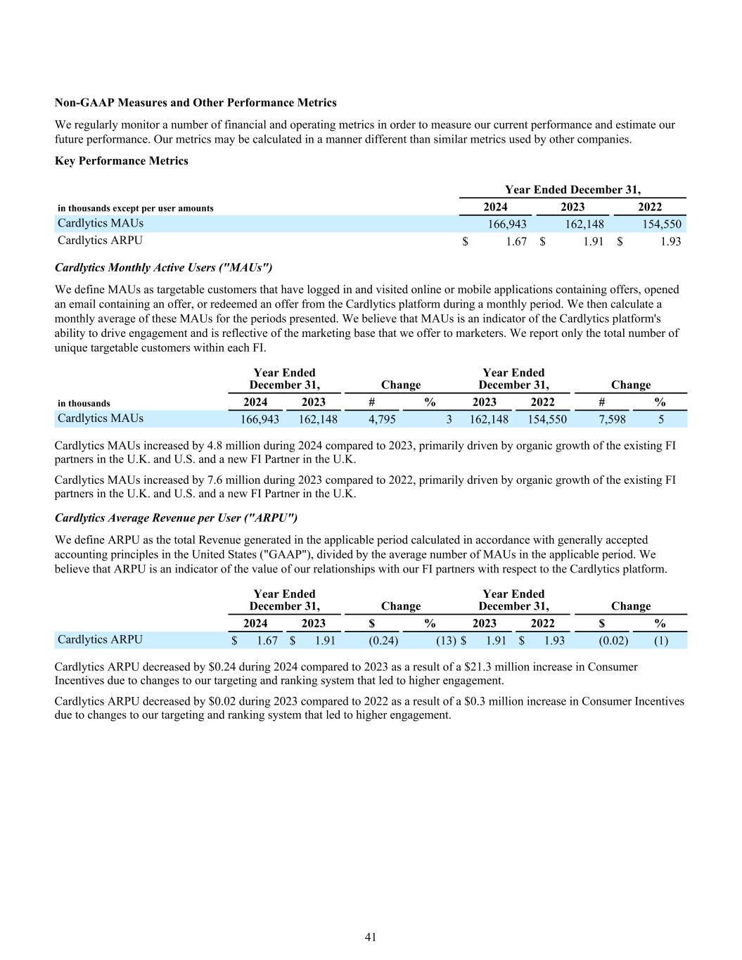 Non-GAAP Measures and Other Performance Metrics We regularly monitor a number of financial and operating metrics in order to measure our current performance and estimate our future performance. Our metrics may be calculated in a manner different than similar metrics used by other companies. Key Performance Metrics Year Ended December 31, in thousands except per user amounts 2024 2023 2022 Cardlytics MAUs 166,943 162,148 154,550 Cardlytics ARPU $ 1.67 $ 1.91 $ 1.93 Cardlytics Monthly Active Users ("MAUs") We define MAUs as targetable customers that have logged in and visited online or mobile applications containing offers, opened an email containing an offer, or redeemed an offer from the Cardlytics platform during a monthly period. We then calculate a monthly average of these MAUs for the periods presented. We believe that MAUs is an indicator of the Cardlytics platform's ability to drive engagement and is reflective of the marketing base that we offer to marketers. We report only the total number of unique targetable customers within each FI. Year Ended December 31, Change Year Ended December 31, Change in thousands 2024 2023 # % 2023 2022 # % Cardlytics MAUs 166,943 162,148 4,795 3 162,148 154,550 7,598 5 Cardlytics MAUs increased by 4.8 million during 2024 compared to 2023, primarily driven by organic growth of the existing FI partners in the U.K. and U.S. and a new FI Partner in the U.K. Cardlytics MAUs increased by 7.6 million during 2023 compared to 2022, primarily driven by organic growth of the existing FI partners in the U.K. and U.S. and a new FI Partner in the U.K. Cardlytics Average Revenue per User ("ARPU") We define ARPU as the total Revenue generated in the applicable period calculated in accordance with generally accepted accounting principles in the United States ("GAAP"), divided by the average number of MAUs in the applicable period. We believe that ARPU is an indicator of the value of our relationships with our FI partners with respect to the Cardlytics platform. Year Ended December 31, Change Year Ended December 31, Change 2024 2023 $ % 2023 2022 $ % Cardlytics ARPU $ 1.67 $ 1.91 (0.24) (13) $ 1.91 $ 1.93 (0.02) (1) Cardlytics ARPU decreased by $0.24 during 2024 compared to 2023 as a result of a $21.3 million increase in Consumer Incentives due to changes to our targeting and ranking system that led to higher engagement. Cardlytics ARPU decreased by $0.02 during 2023 compared to 2022 as a result of a $0.3 million increase in Consumer Incentives due to changes to our targeting and ranking system that led to higher engagement. 41