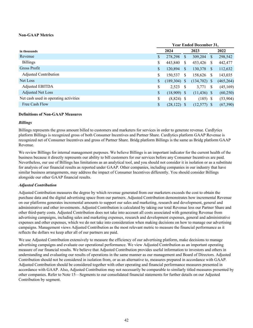 Non-GAAP Metrics Year Ended December 31, in thousands 2024 2023 2022 Revenue $ 278,298 $ 309,204 $ 298,542 Billings $ 443,840 $ 453,426 $ 442,477 Gross Profit $ 120,894 $ 130,378 $ 112,632 Adjusted Contribution $ 150,537 $ 158,626 $ 143,035 Net Loss $ (189,304) $ (134,702) $ (465,264) Adjusted EBITDA $ 2,523 $ 3,771 $ (45,169) Adjusted Net Loss $ (18,909) $ (11,436) $ (60,250) Net cash used in operating activities $ (8,824) $ (185) $ (53,904) Free Cash Flow $ (28,122) $ (12,577) $ (67,390) Definitions of Non-GAAP Measures Billings Billings represents the gross amount billed to customers and marketers for services in order to generate revenue. Cardlytics platform Billings is recognized gross of both Consumer Incentives and Partner Share. Cardlytics platform GAAP Revenue is recognized net of Consumer Incentives and gross of Partner Share. Bridg platform Billings is the same as Bridg platform GAAP Revenue. We review Billings for internal management purposes. We believe Billings is an important indicator for the current health of the business because it directly represents our ability to bill customers for our services before any Consumer Incentives are paid. Nevertheless, our use of Billings has limitations as an analytical tool, and you should not consider it in isolation or as a substitute for analysis of our financial results as reported under GAAP. Other companies, including companies in our industry that have similar business arrangements, may address the impact of Consumer Incentives differently. You should consider Billings alongside our other GAAP financial results. Adjusted Contribution Adjusted Contribution measures the degree by which revenue generated from our marketers exceeds the cost to obtain the purchase data and the digital advertising space from our partners. Adjusted Contribution demonstrates how incremental Revenue on our platforms generates incremental amounts to support our sales and marketing, research and development, general and administrative and other investments. Adjusted Contribution is calculated by taking our total Revenue less our Partner Share and other third-party costs. Adjusted Contribution does not take into account all costs associated with generating Revenue from advertising campaigns, including sales and marketing expenses, research and development expenses, general and administrative expenses and other expenses, which we do not take into consideration when making decisions on how to manage our advertising campaigns. Management views Adjusted Contribution as the most relevant metric to measure the financial performance as it reflects the dollars we keep after all of our partners are paid. We use Adjusted Contribution extensively to measure the efficiency of our advertising platform, make decisions to manage advertising campaigns and evaluate our operational performance. We view Adjusted Contribution as an important operating measure of our financial results. We believe that Adjusted Contribution provides useful information to investors and others in understanding and evaluating our results of operations in the same manner as our management and Board of Directors. Adjusted Contribution should not be considered in isolation from, or as an alternative to, measures prepared in accordance with GAAP. Adjusted Contribution should be considered together with other operating and financial performance measures presented in accordance with GAAP. Also, Adjusted Contribution may not necessarily be comparable to similarly titled measures presented by other companies. Refer to Note 15—Segments to our consolidated financial statements for further details on our Adjusted Contribution by segment. 42